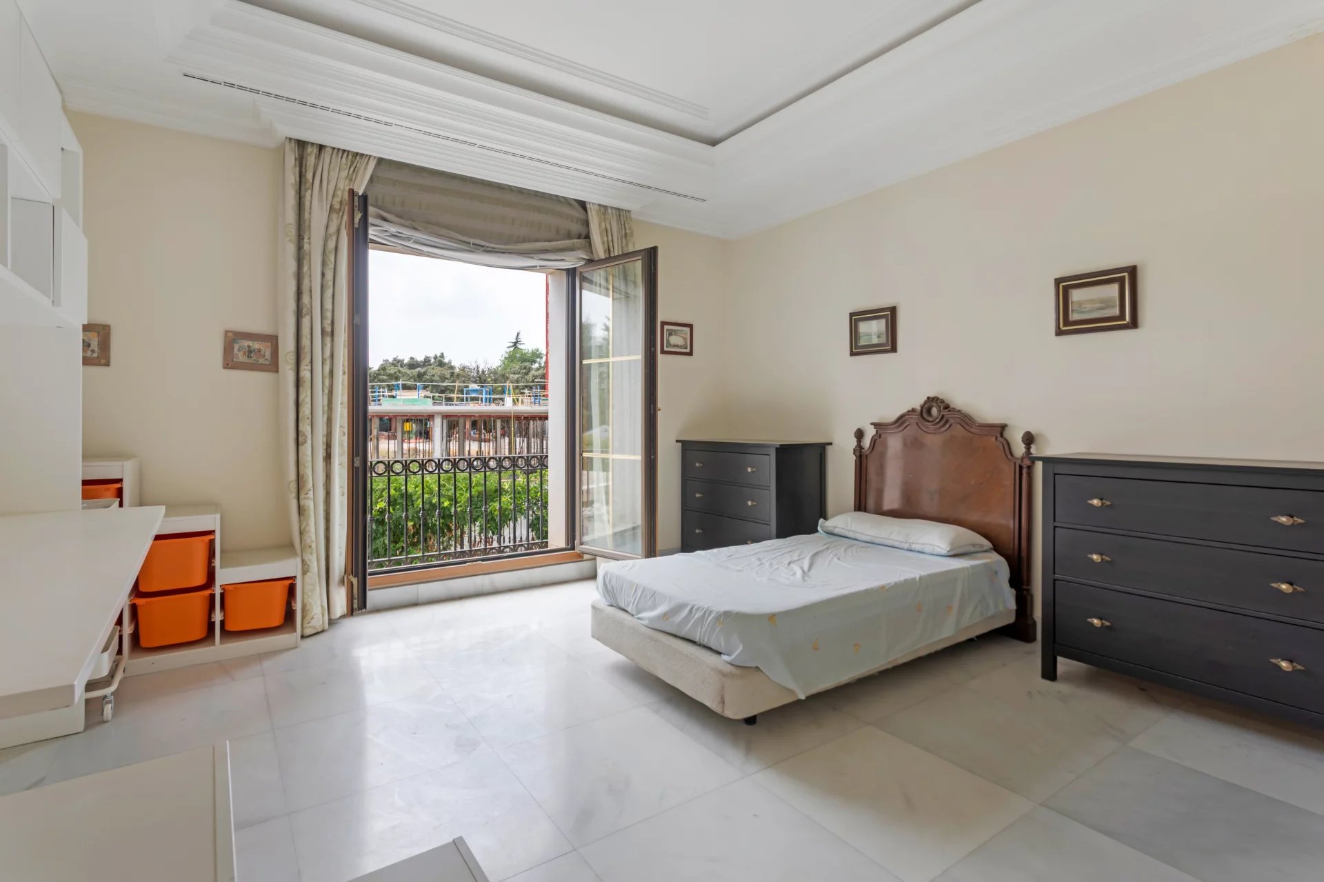 On the upper floor, four bedrooms in total, all with dressing room and bathroom en suite. The master bedroom stands out for its high ceilings, its terrace overlooking the golf course, and its two integrated dressing rooms.