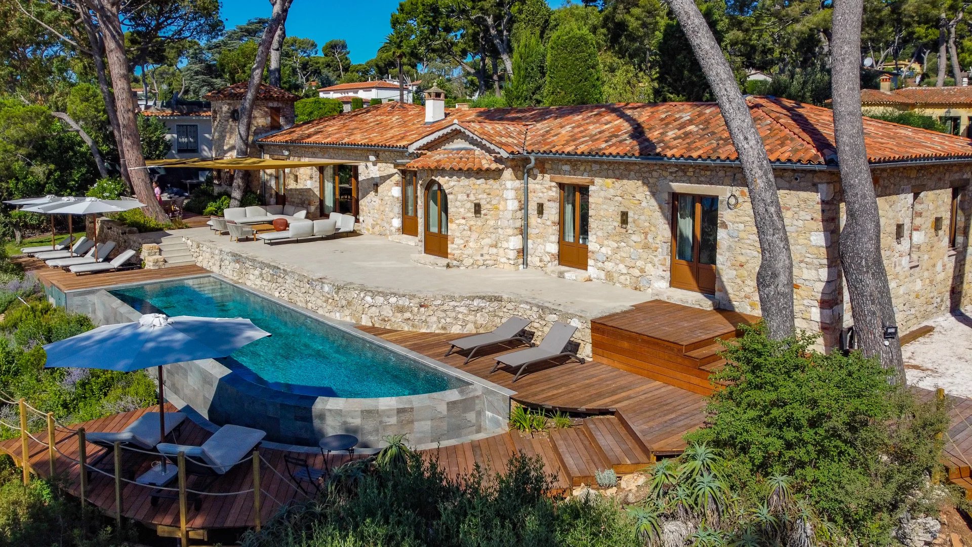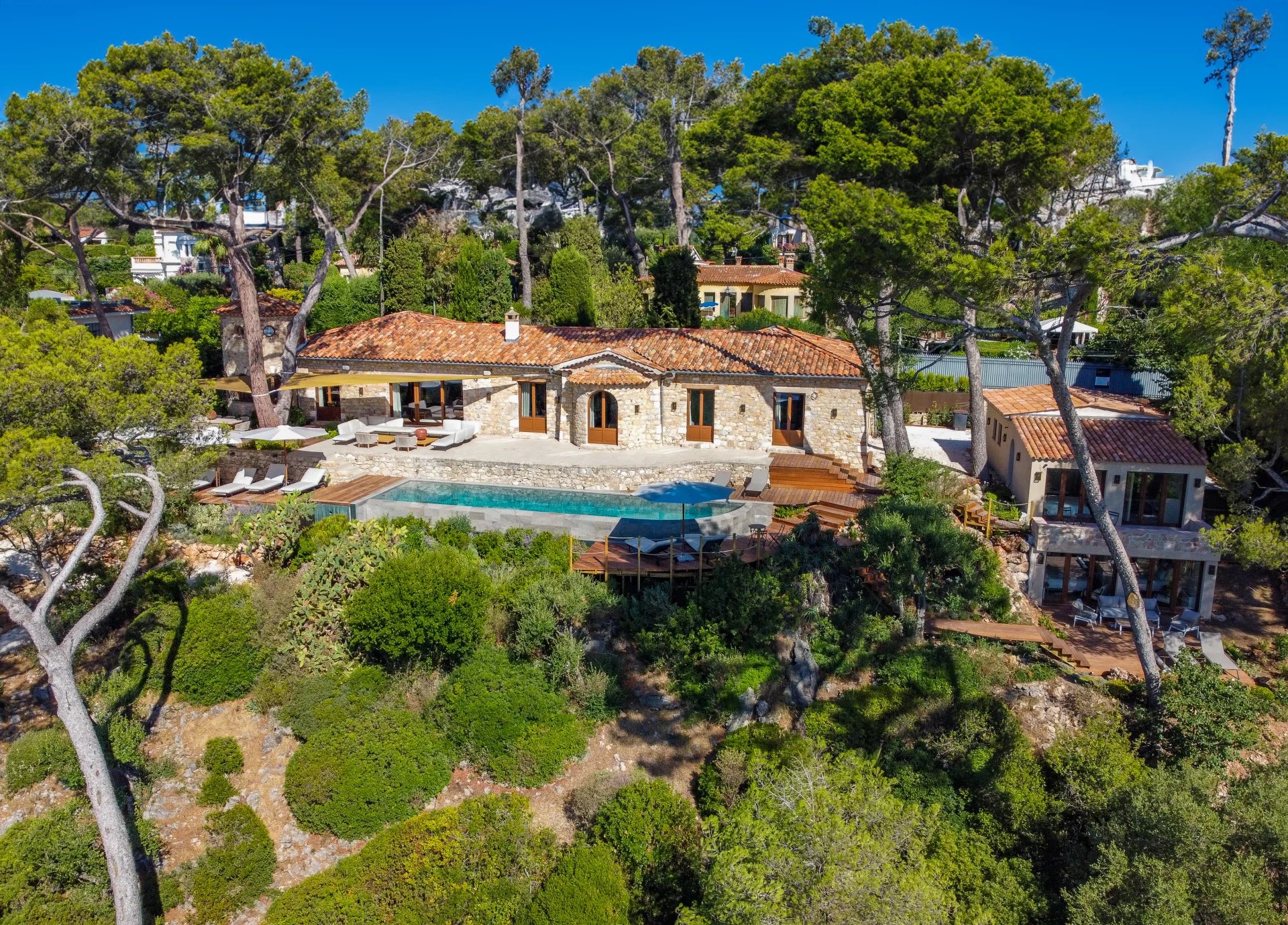 Superb and rare stone bastide-type property of approximately 360 sqm on one level, benefiting from a magnificent landscaped park of 3050 sqm. Large terrace with shaded corners, BBQ, 14 meter infinity pool with panoramic view. Main house of 280 sqm consisting of a large entrance, living space with living room, fitted kitchen, dining room, all opening onto the swimming pool. 4 en-suite bedrooms. The 80 sqm guest house consists of 3 en-suite bedrooms. Garage for 2 cars.