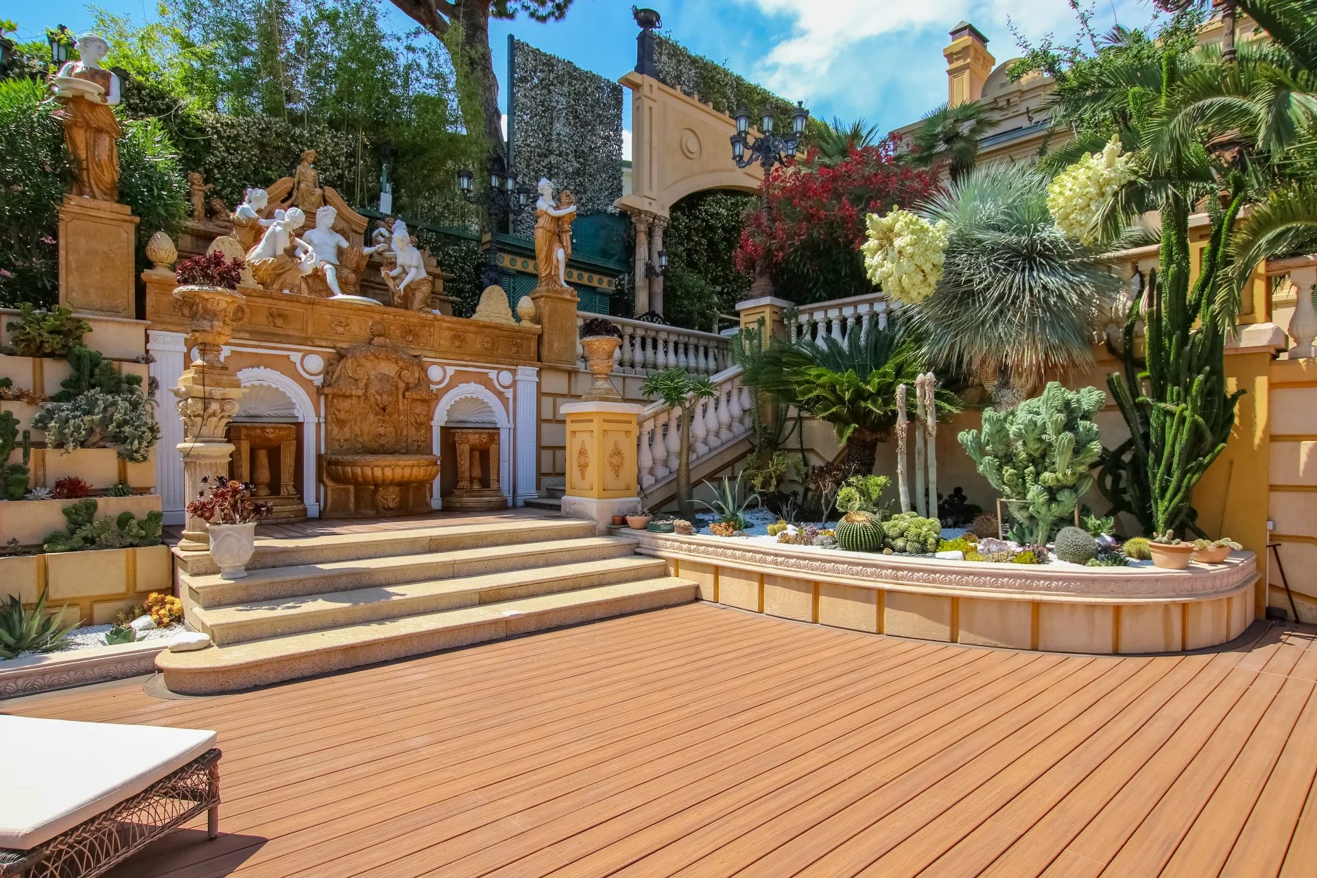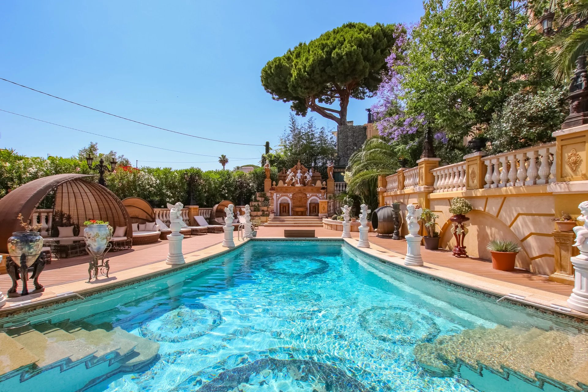 The garden is beautifully landscaped with colorful flower beds and an elegant fountain. The swimming pool is large and has a spacious terrace.
