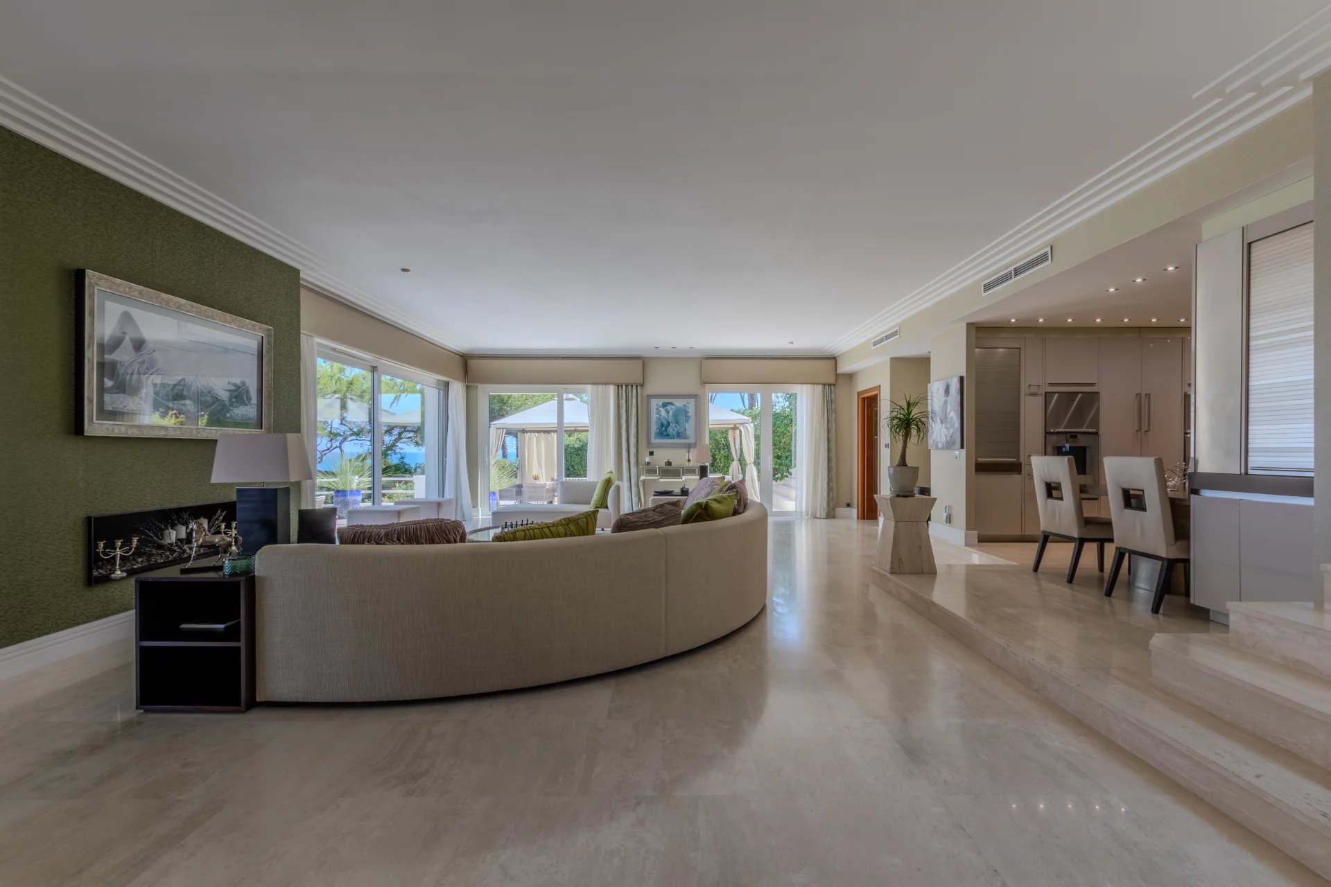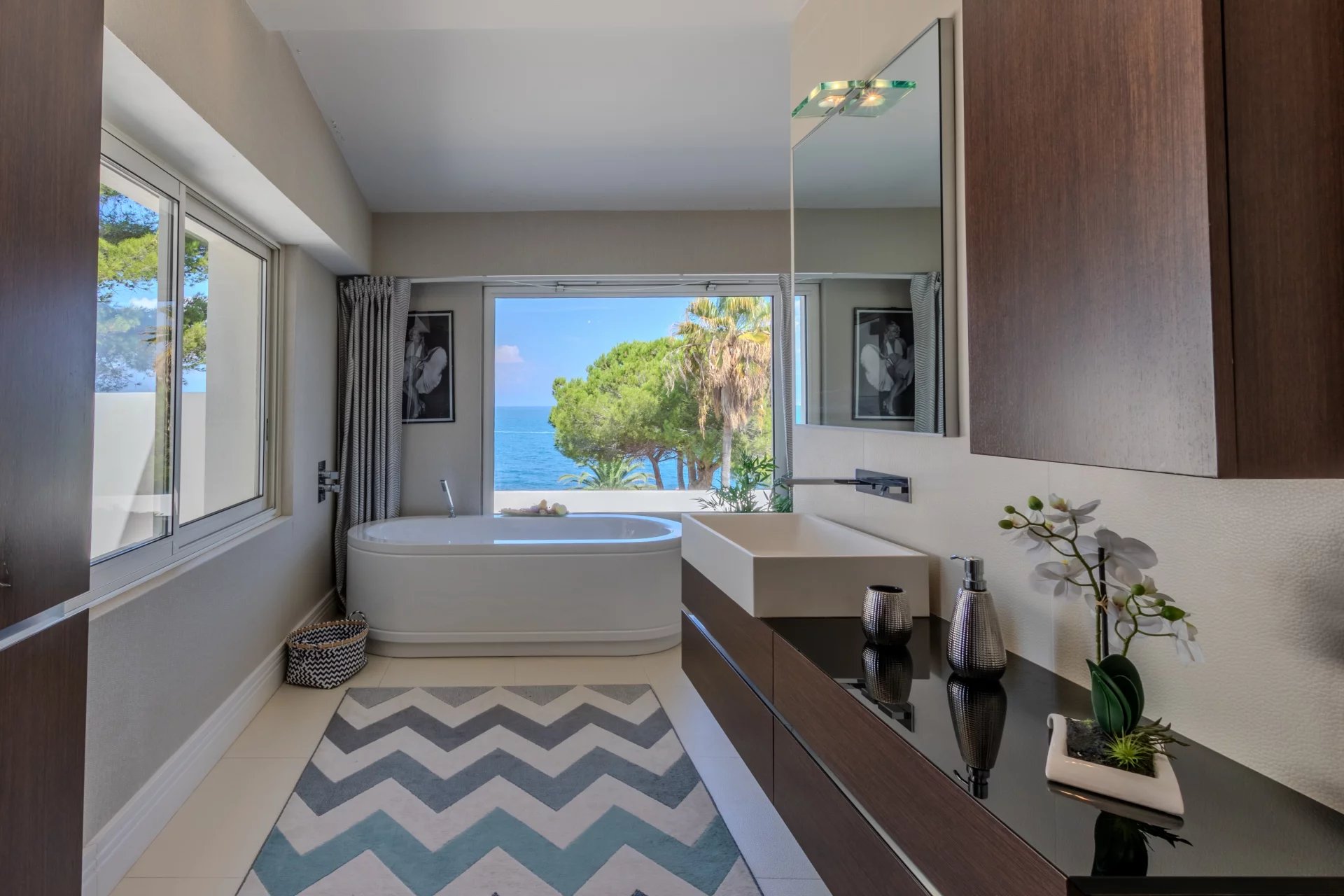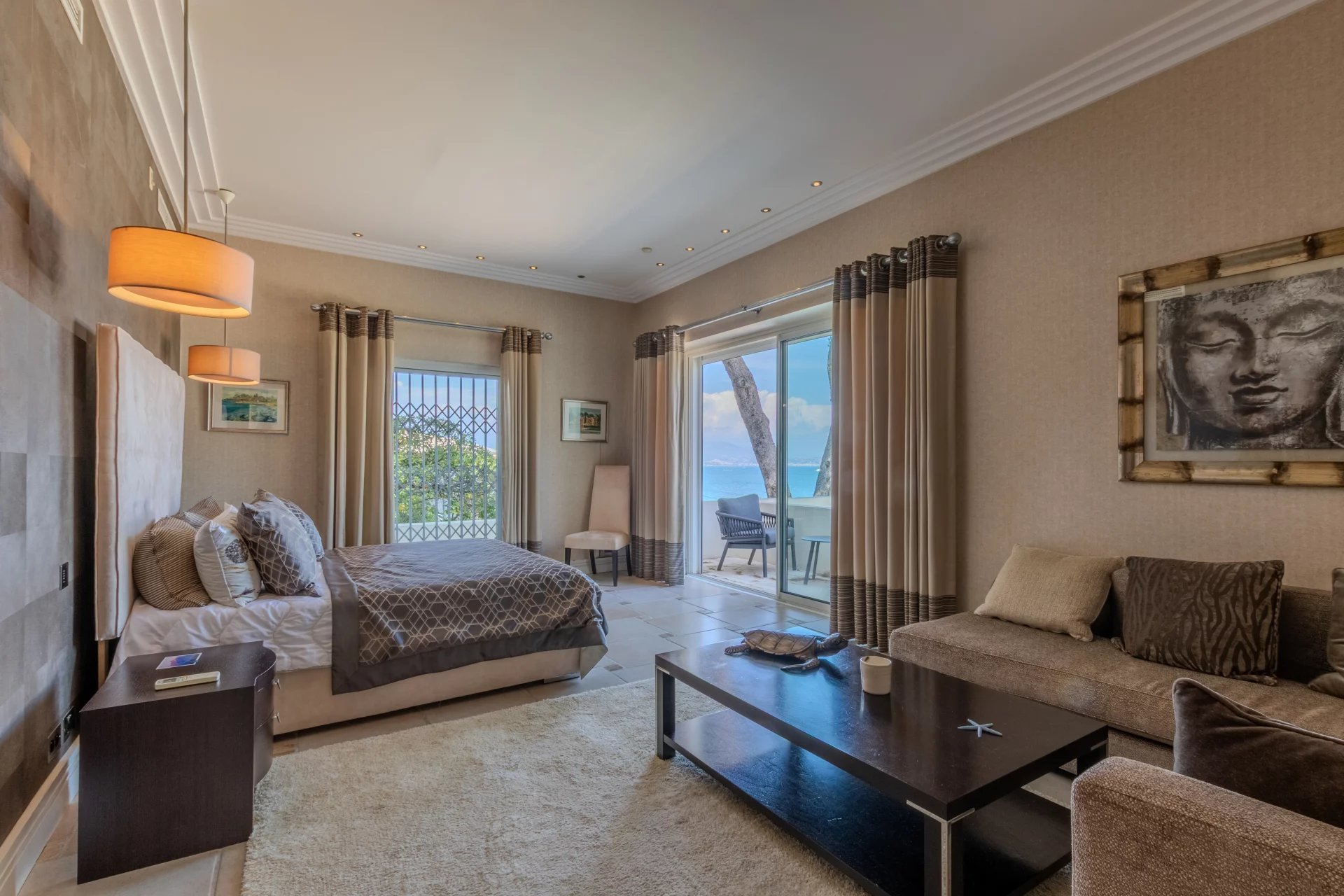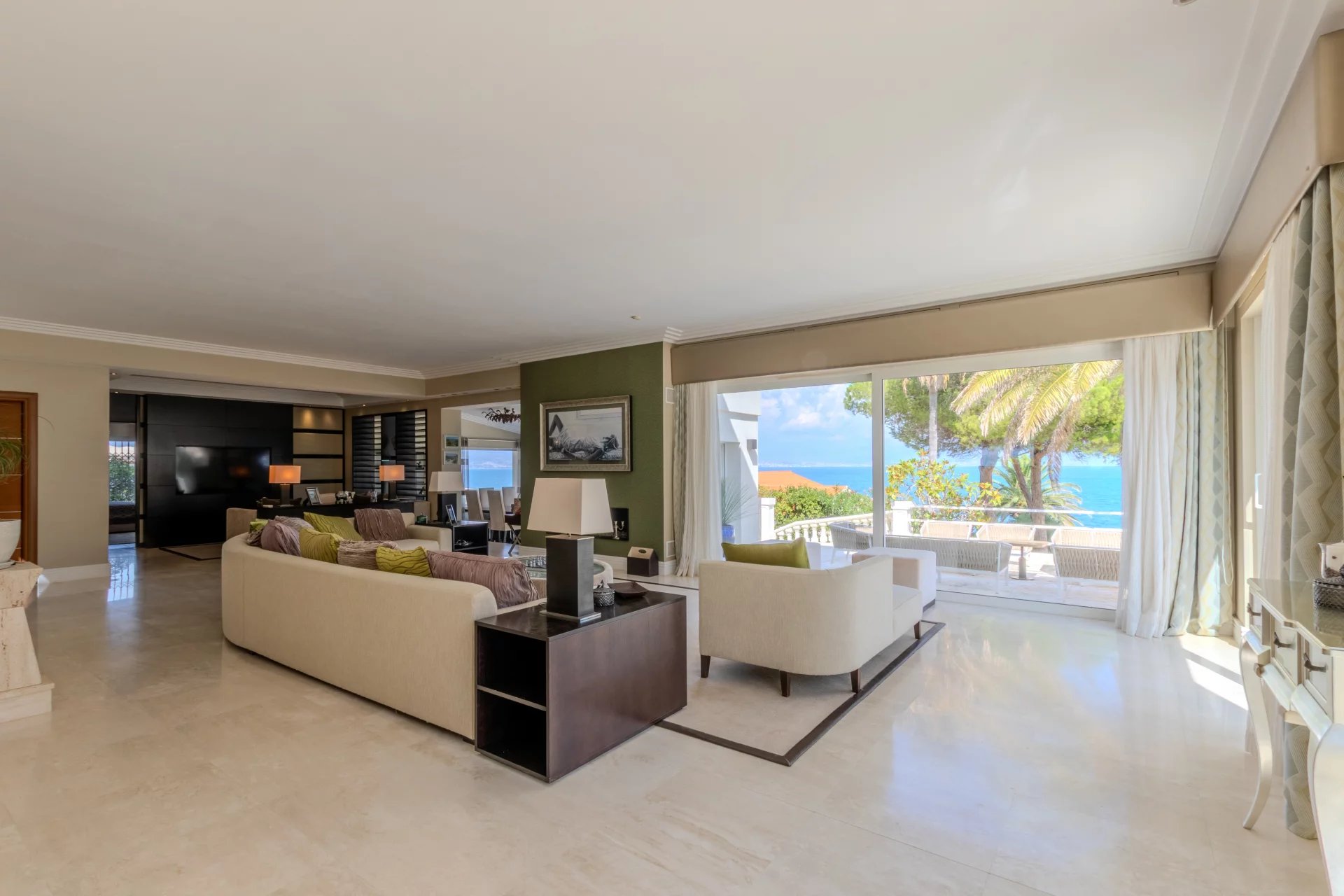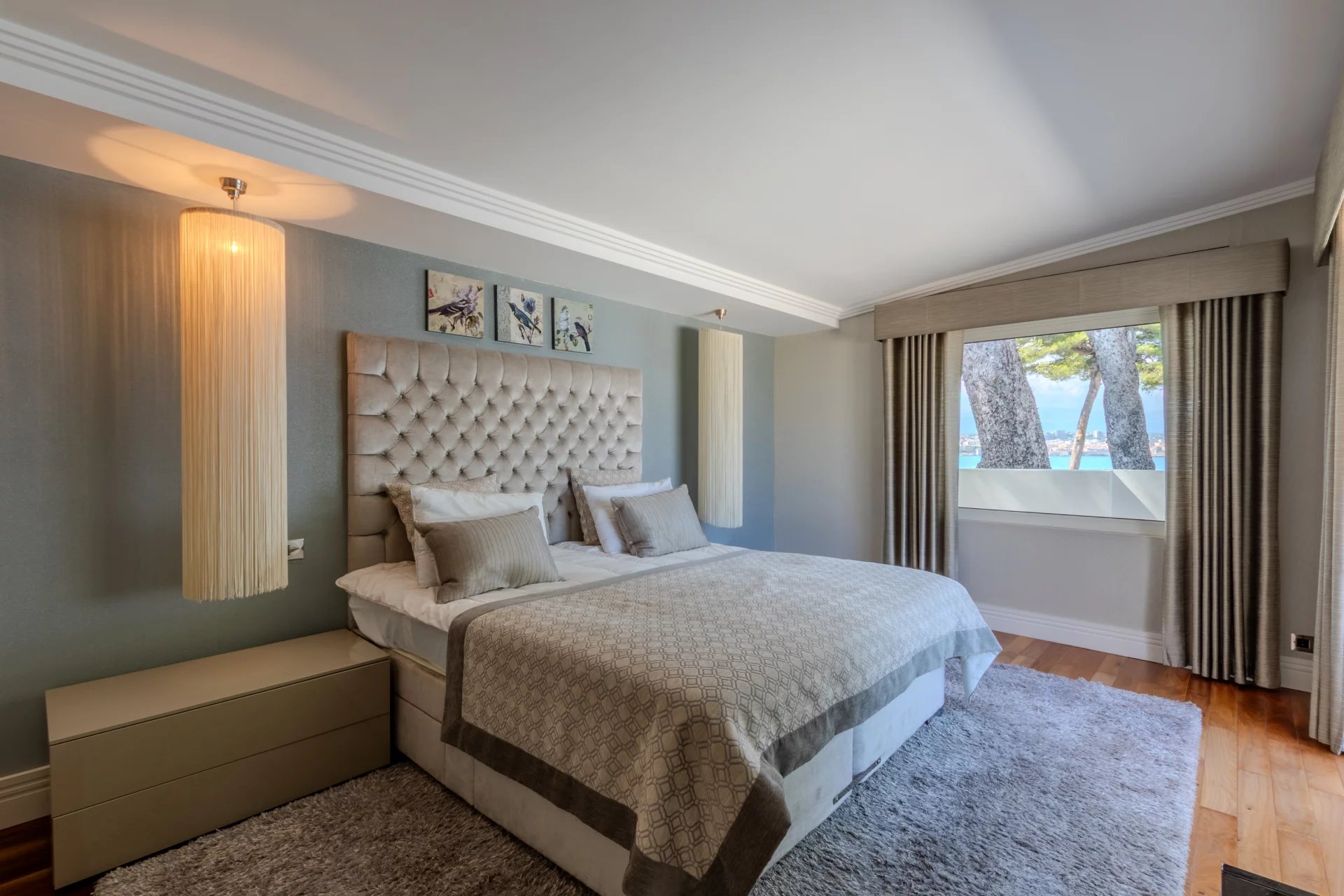 Dominant position for this superb villa of 371 sqm with large flat garden of 2164 sqm and swimming pool. Panoramic sea view. Garden level: spacious living room with sea view, TV lounge, fitted kitchen and dining room. A large bedroom with en-suite bathroom. Upstairs, a master suite with living room, large bathroom and terrace overlooking the sea. A second bedroom with bathroom and sea view. Two further bedrooms with shower rooms. Parking spaces available.