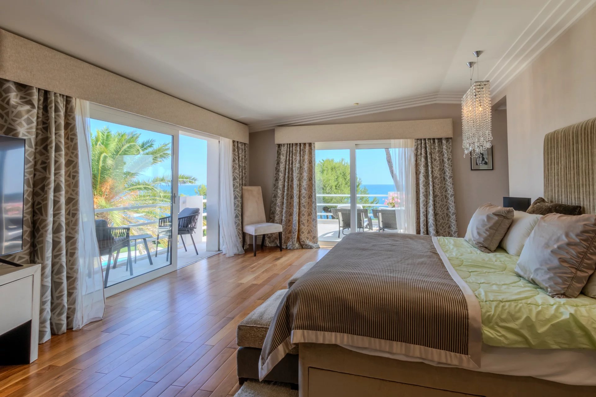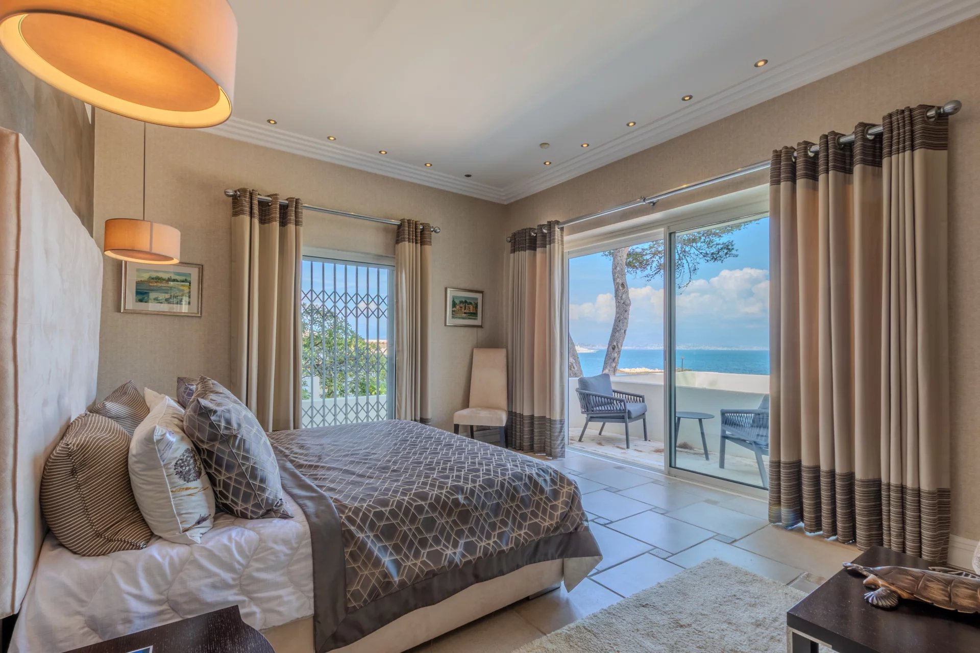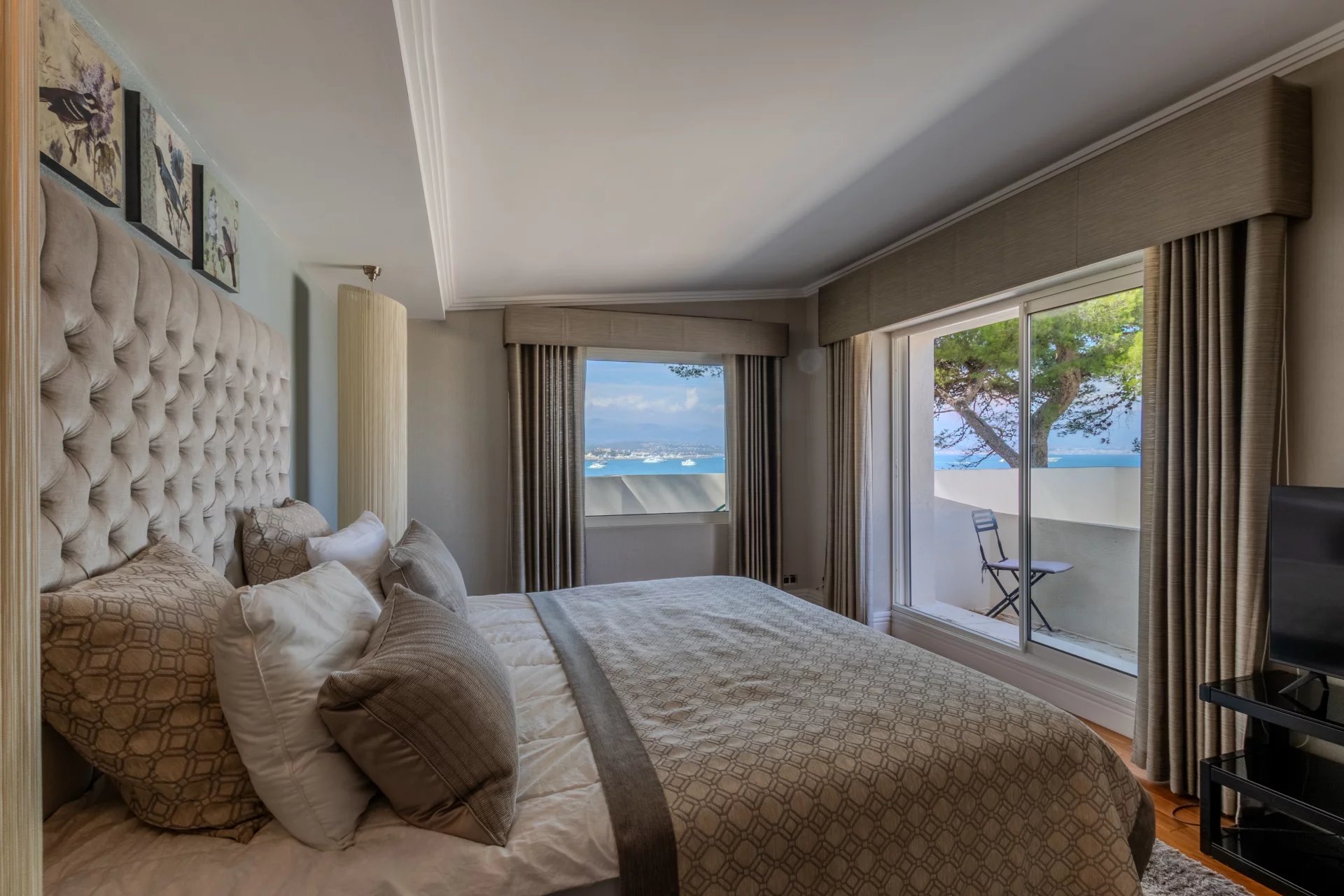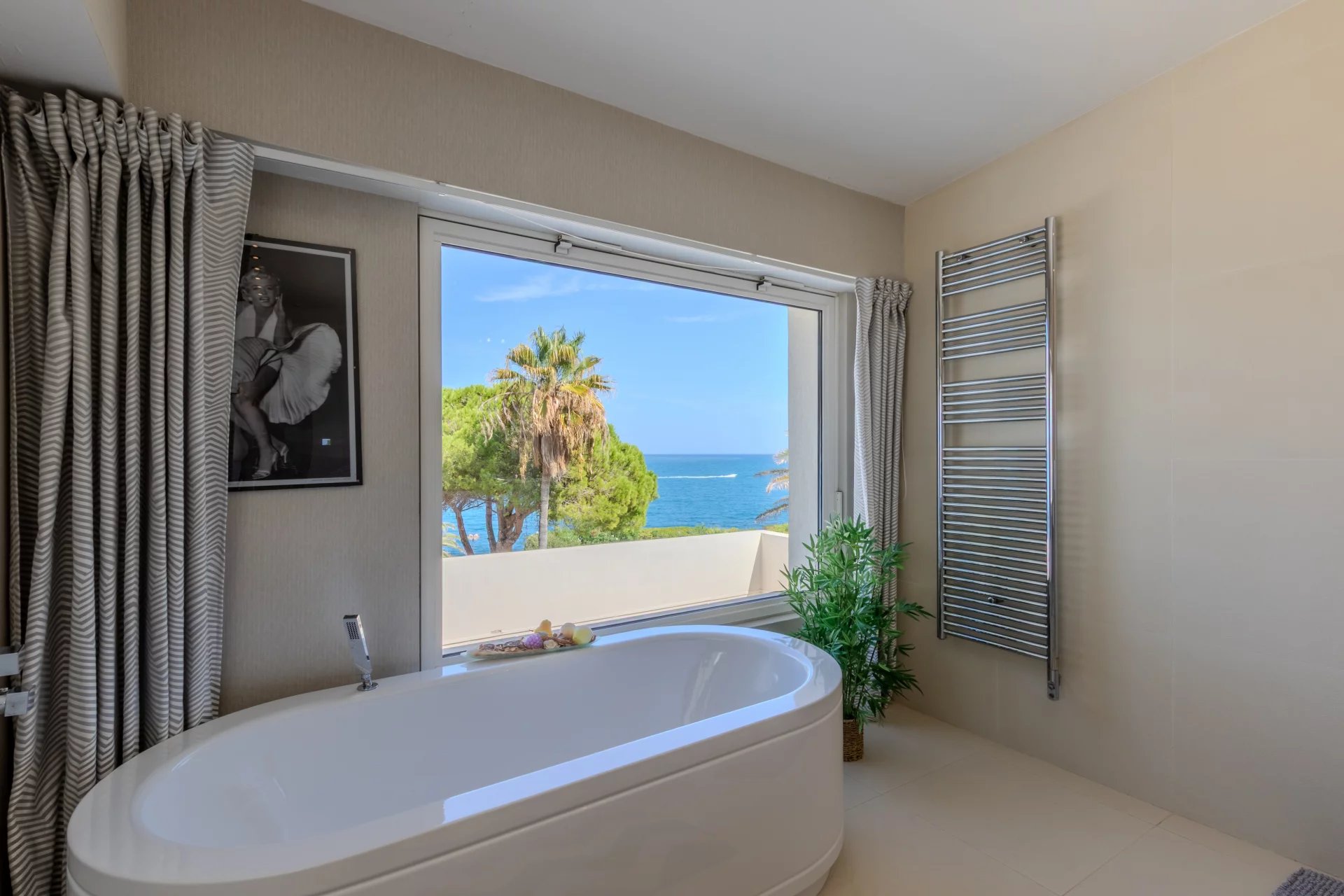 Dominant position for this superb villa of 371 sqm with large flat garden of 2164 sqm and swimming pool. Panoramic sea view. Garden level: spacious living room with sea view, TV lounge, fitted kitchen and dining room. A large bedroom with en-suite bathroom. Upstairs, a master suite with living room, large bathroom and terrace overlooking the sea. A second bedroom with bathroom and sea view. Two further bedrooms with shower rooms. Parking spaces available.