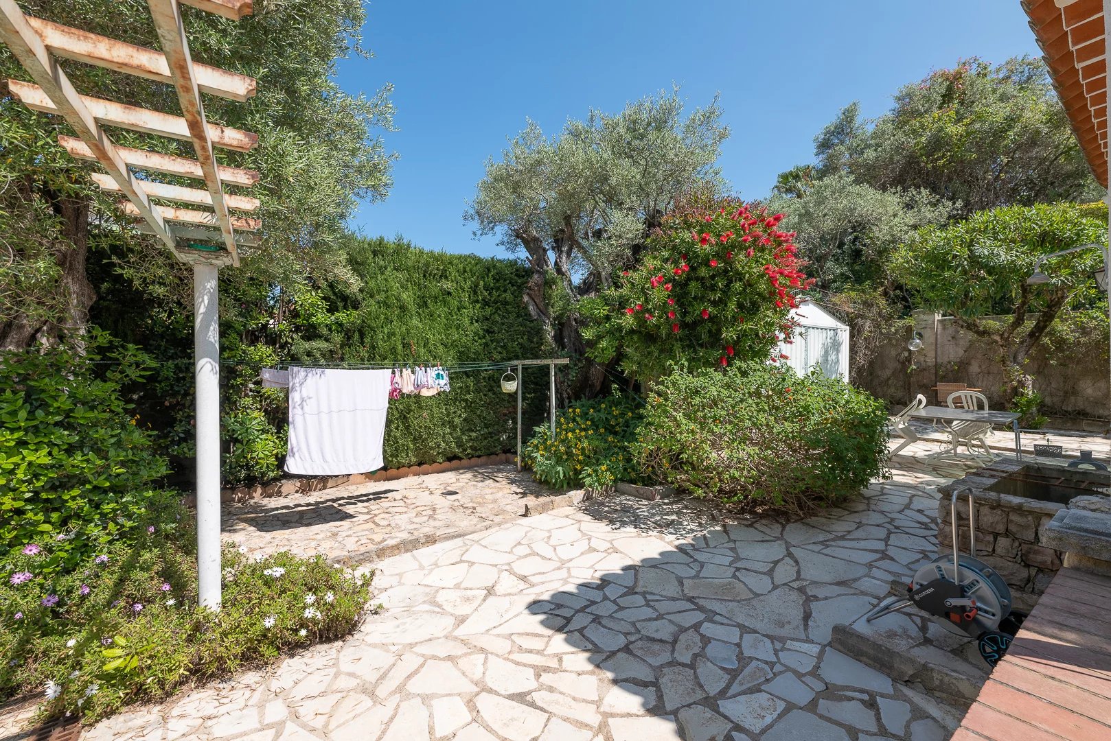 Charming 165 m² villa nestled in a lush, private setting. Upon entering, you are greeted by a spacious, sun-drenched living and dining area with an elegant veranda—perfect for enjoying the Mediterranean light. A separate kitchen completes the living space.