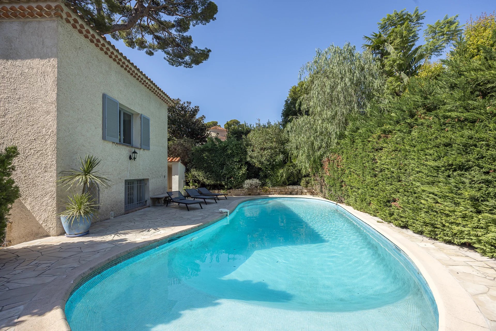 Outside, a swimming pool perfectly complements the garden, providing an idyllic setting to relax and enjoy the sunny days of the French Riviera. The villa ensures optimal comfort with air conditioning throughout and a gas heating system, ensuring pleasant temperatures year-round.