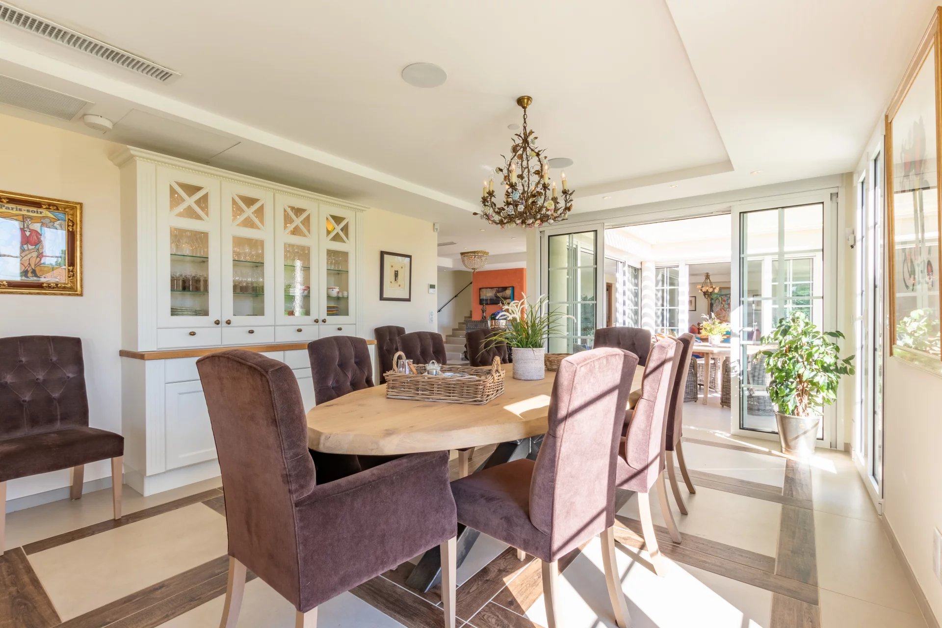 Beautiful entrance hall leading to the reception room including living room with TV, dining area and equipped kitchen, all opening onto a covered terrace (summer dining room) and the pool