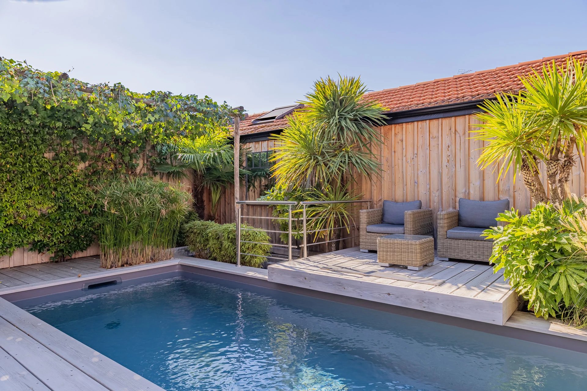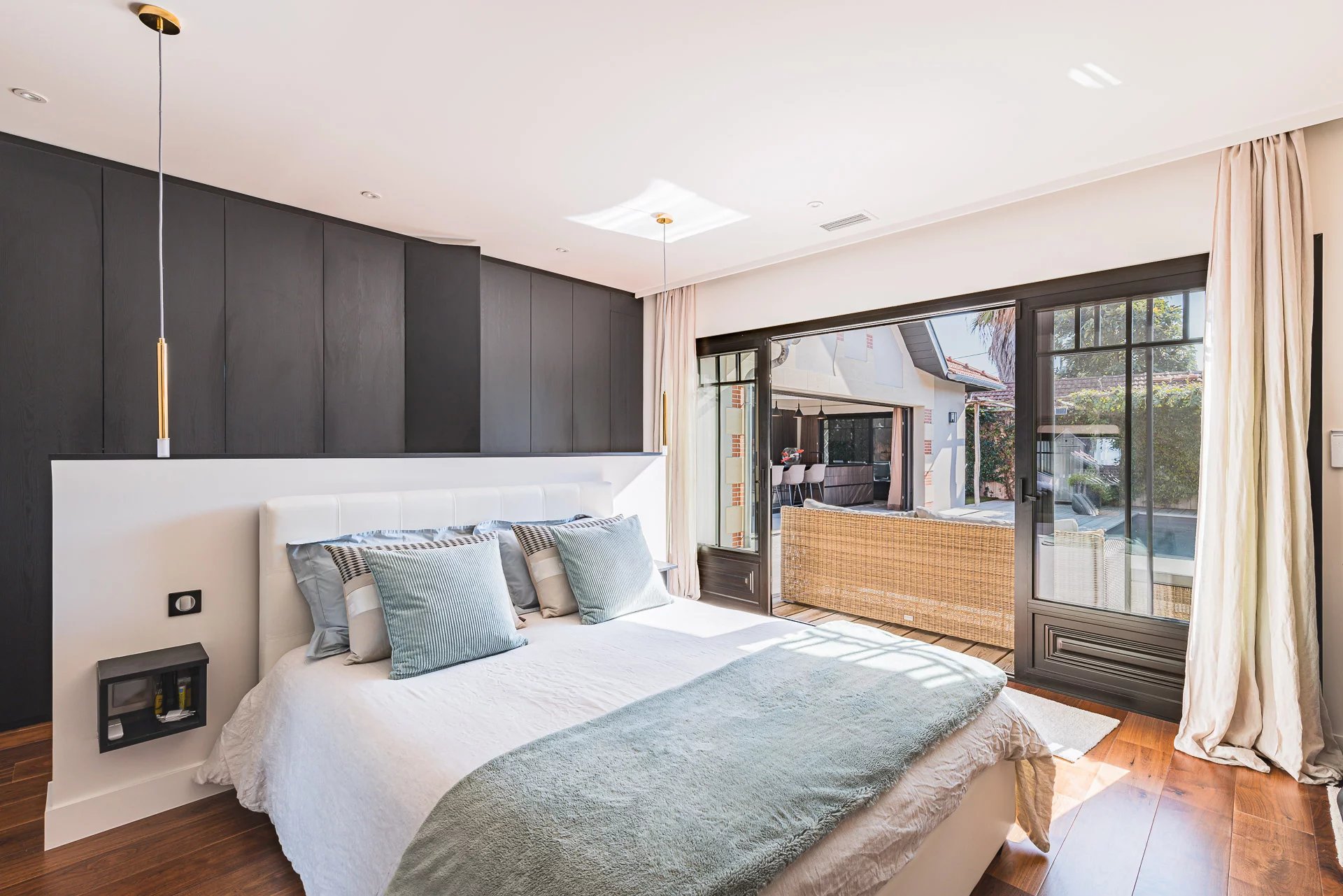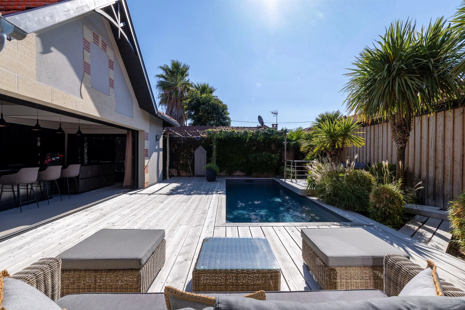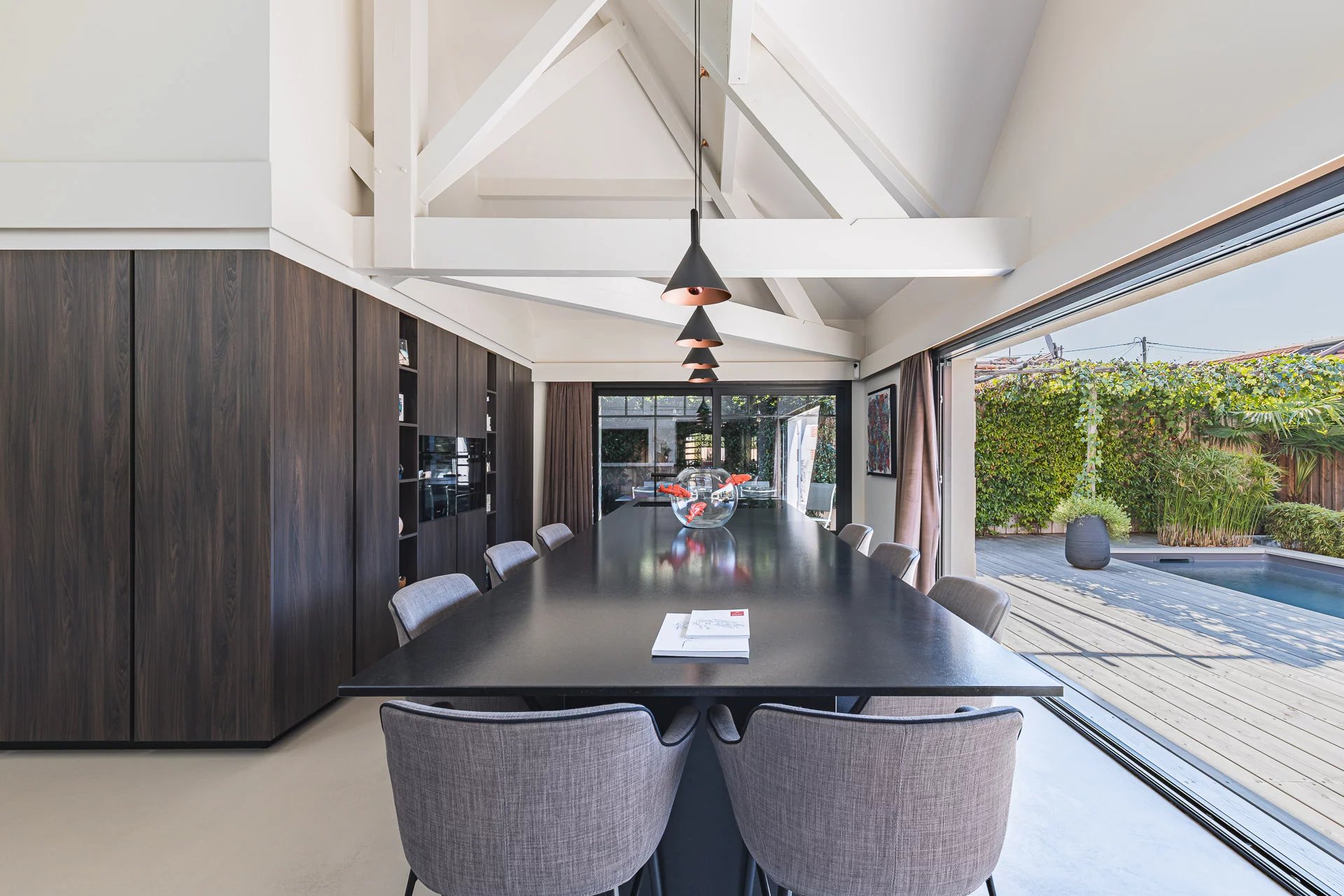 Large sliding bay windows extend the interior towards the terrace and the swimming pool, creating a natural sense of continuity.