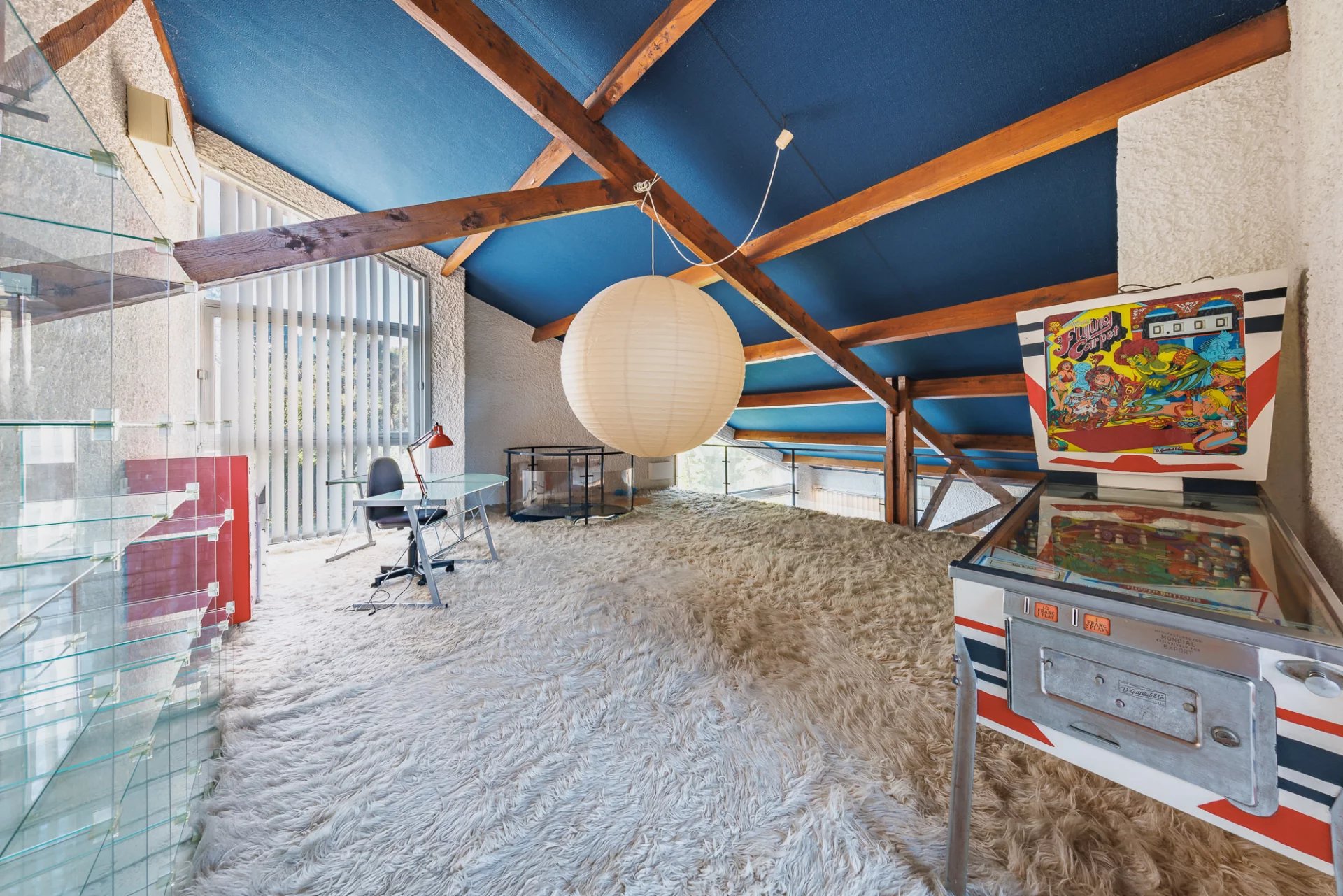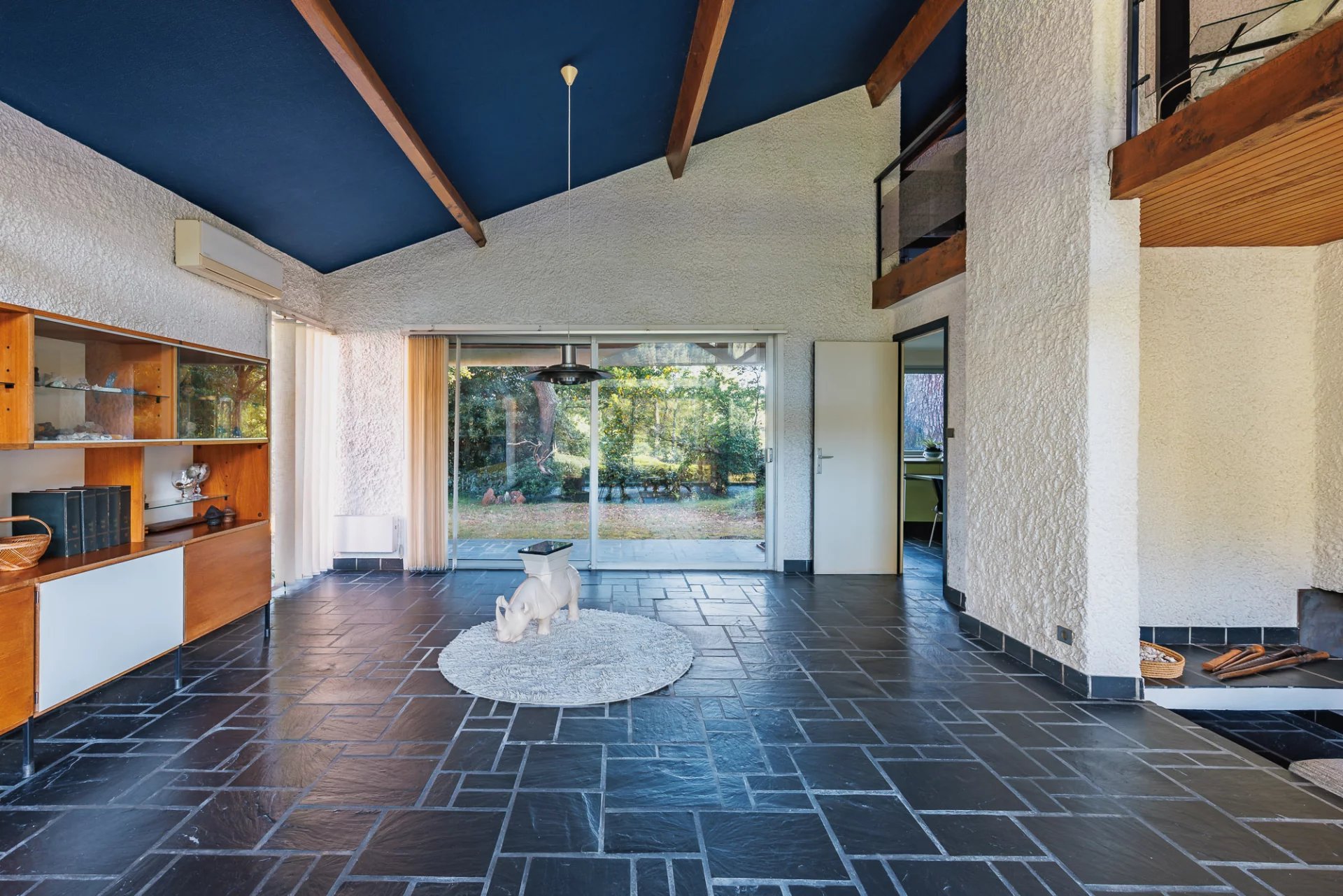 Upstairs, a mezzanine overlooks the living room, providing a versatile space that can serve as an office, reading nook, or additional bedroom. Its elevated position enhances the sense of openness and offers a clear view of the garden.