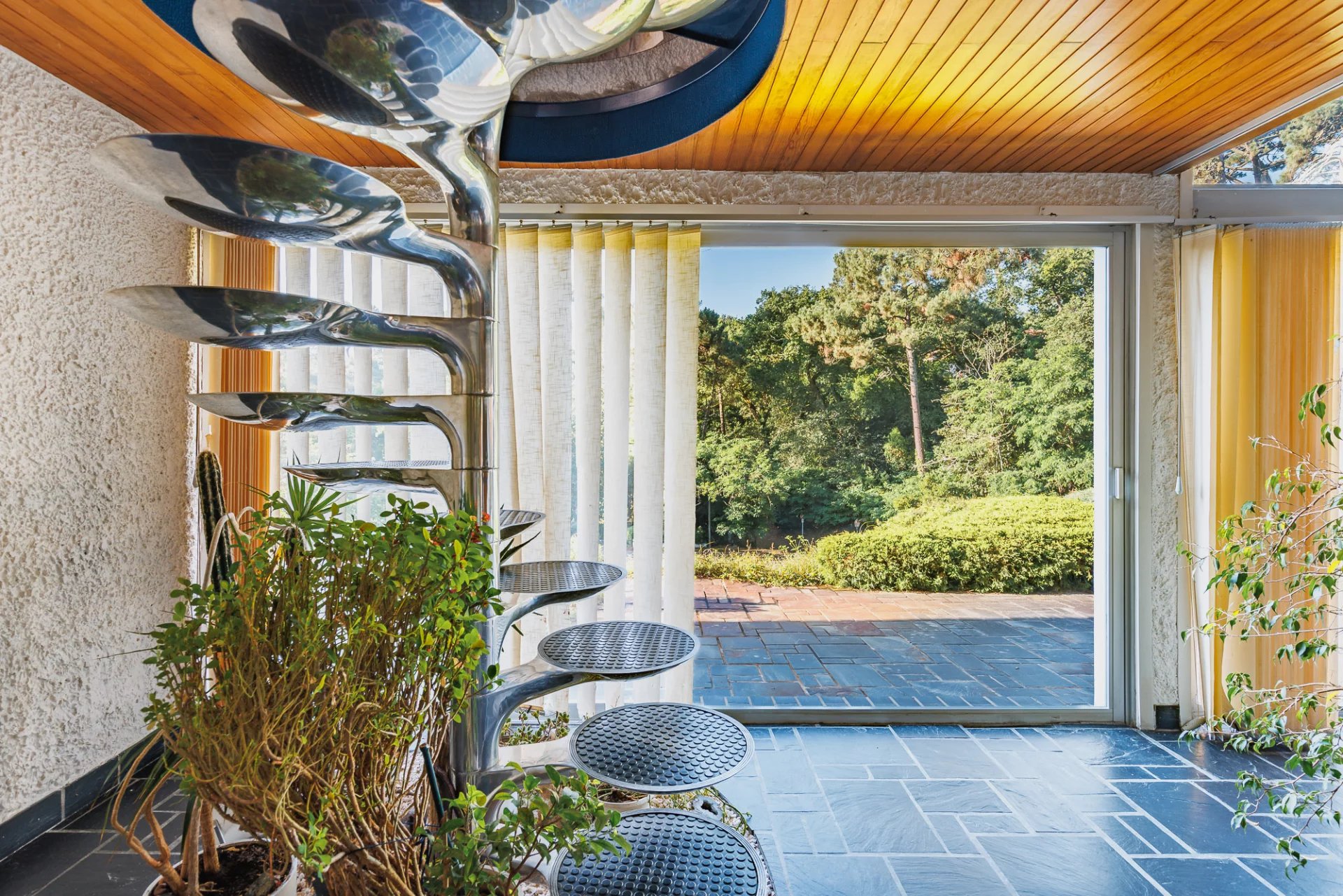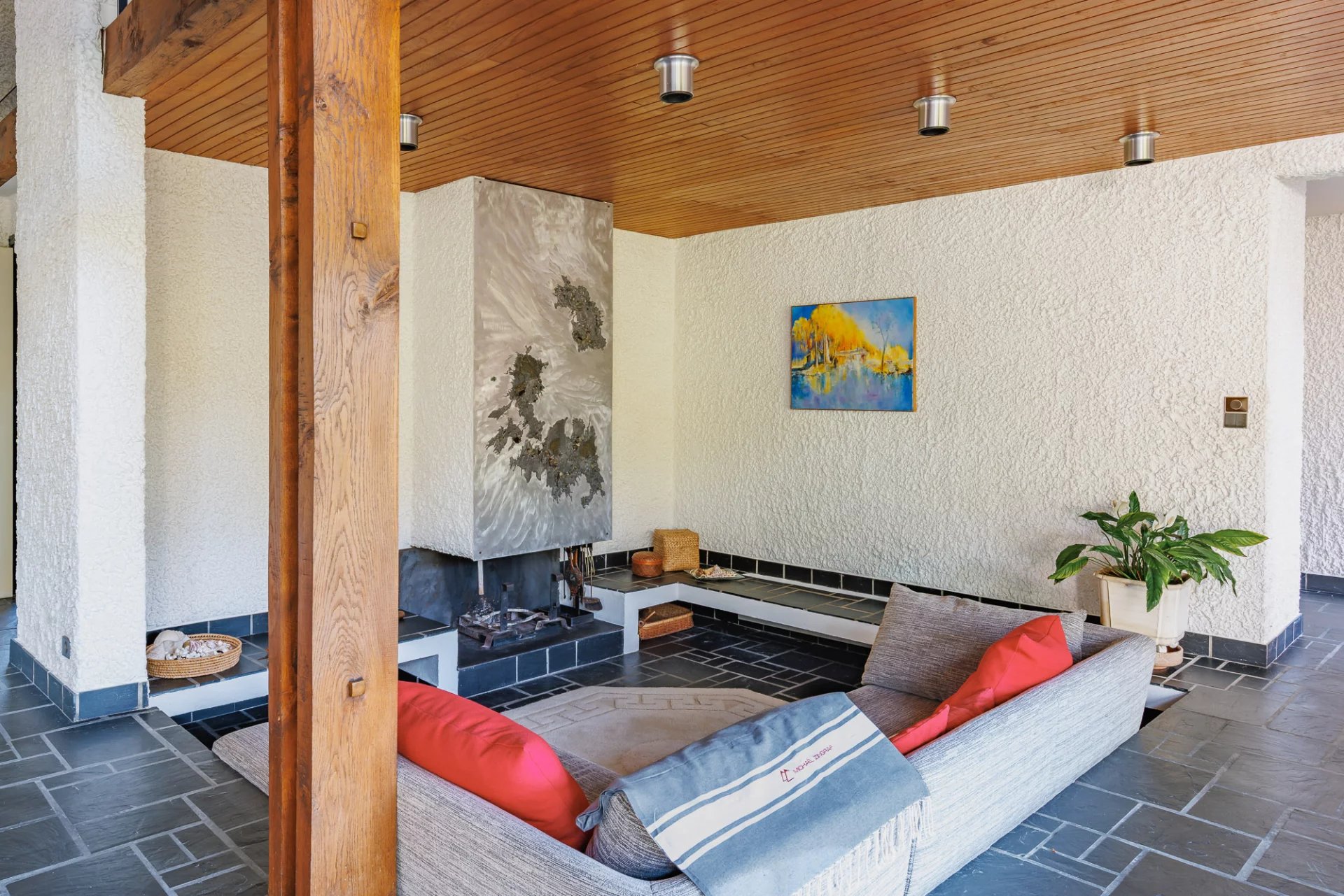 Michael Zingraf Bassin d’Arcachon presents an architect-designed house built in 1975, set on a 1,432 m² plot near the bay. Its design emphasizes a fluid and open layout, ensuring natural circulation and brightness. The house blends raw materials such as concrete, wood, and glass with an open structure that creates a seamless connection between the indoor and outdoor spaces.