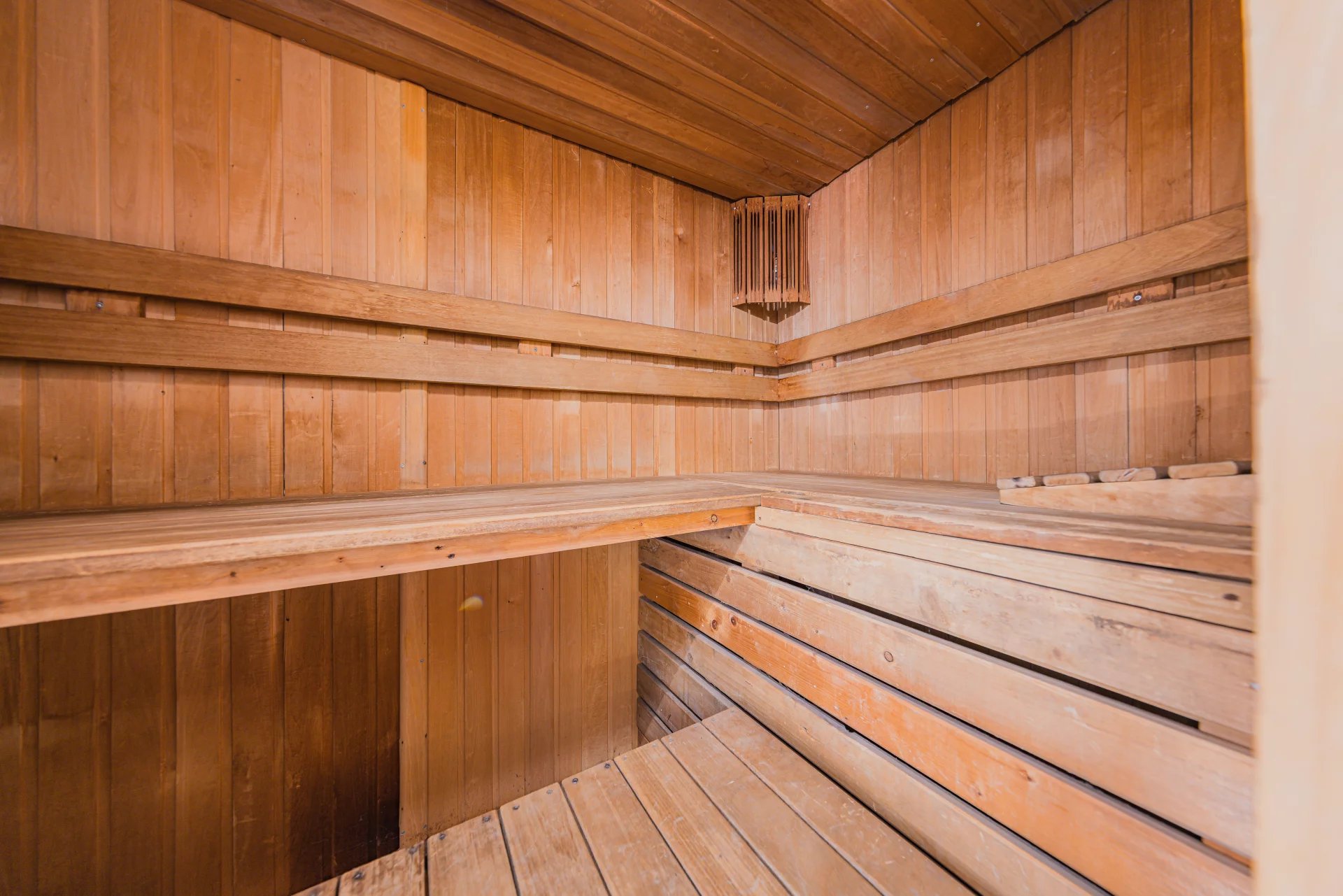 The garden level comprises a service entrance with cupboards, a utility room, a pantry, two bedrooms (one with an en-suite shower room), and a sauna.