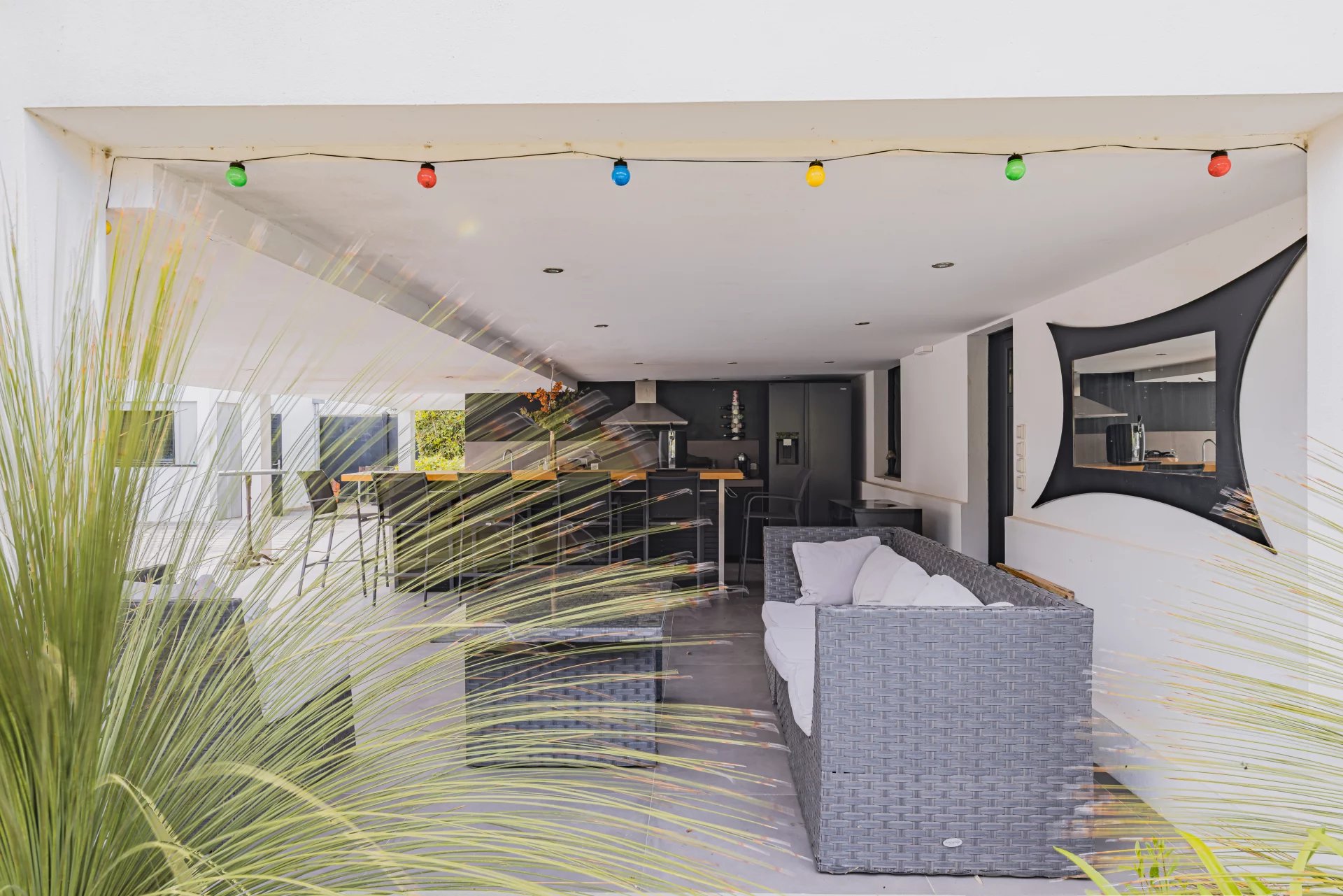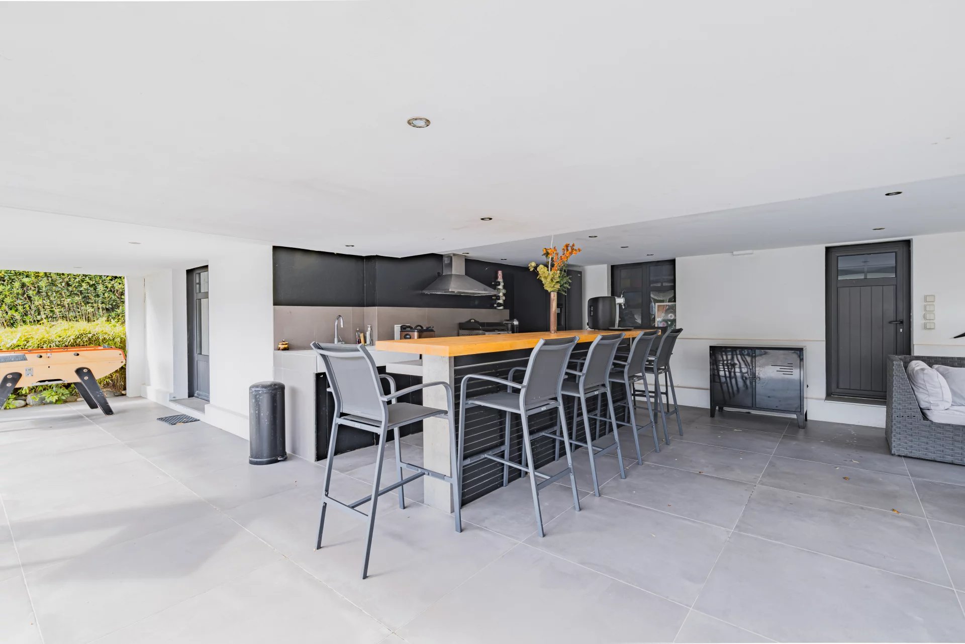 The 1,100 m² fenced plot features areas designed for relaxation, including a heated swimming pool, an outdoor kitchen and a boules court.