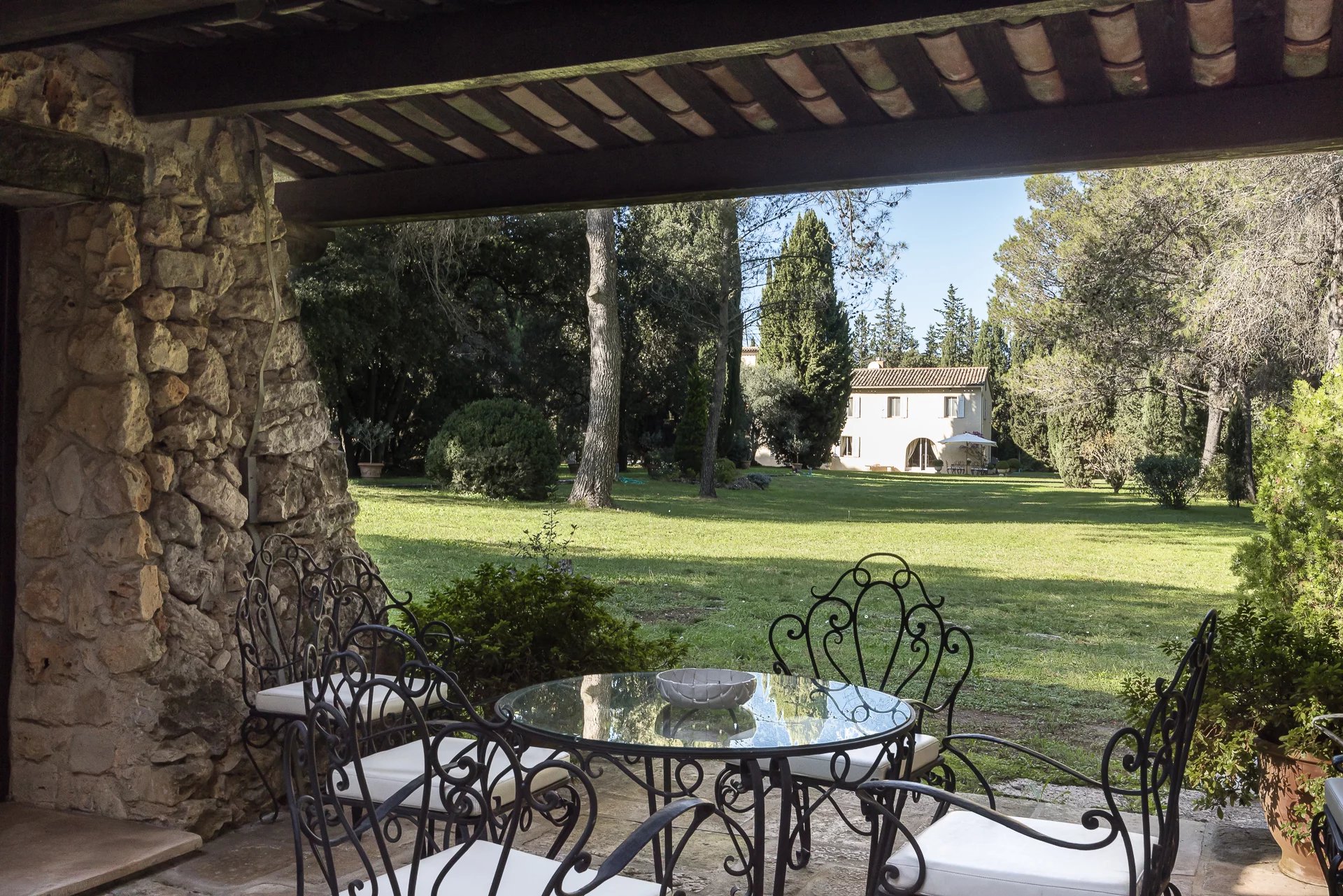The outdoor areas are designed for both relaxation and entertaining, with stone walls, shaded terraces, and peaceful Mediterranean surroundings.