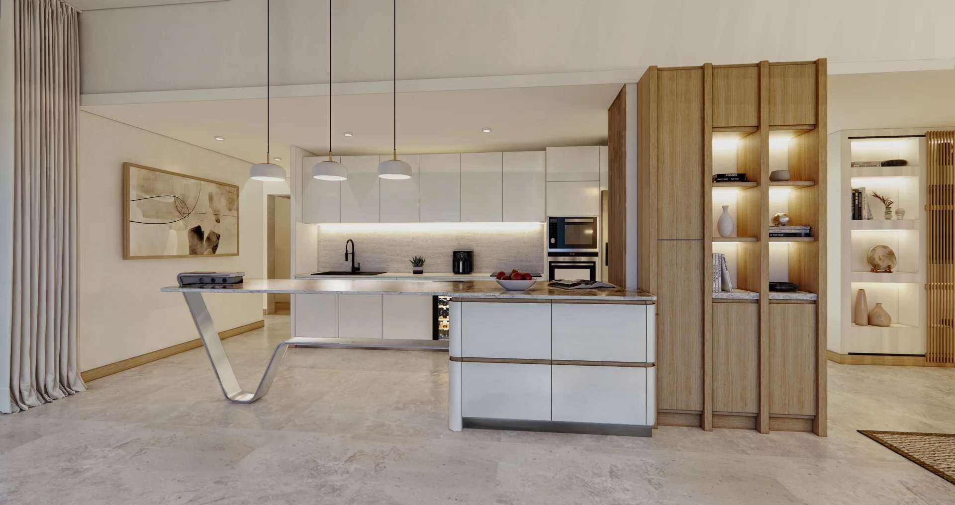 Each room of the apartment boasts an abundance of natural light and space to entertain family and friends. Equipped with modern quality appliances and fixtures, the apartment’s colour palettes and textures are derived from its natural surroundings and designed to be warm and sophisticated. The kitchen, which is out of shot, is from the Snaidero range.