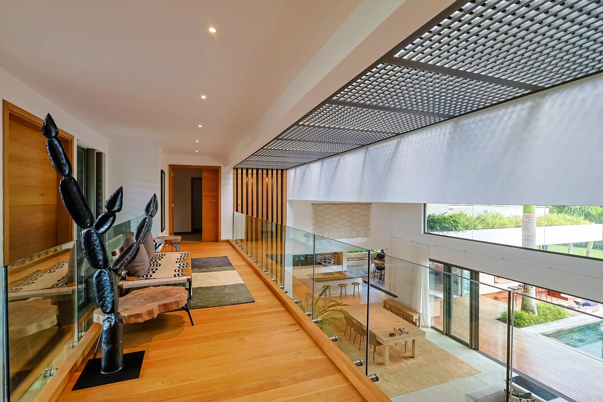 The outdoor areas include a landscaped garden, considered one of the most remarkable on the estate. Fully irrigated and secured for children, it is planted with numerous fruit trees, including mango, avocado, and passion fruit trees.