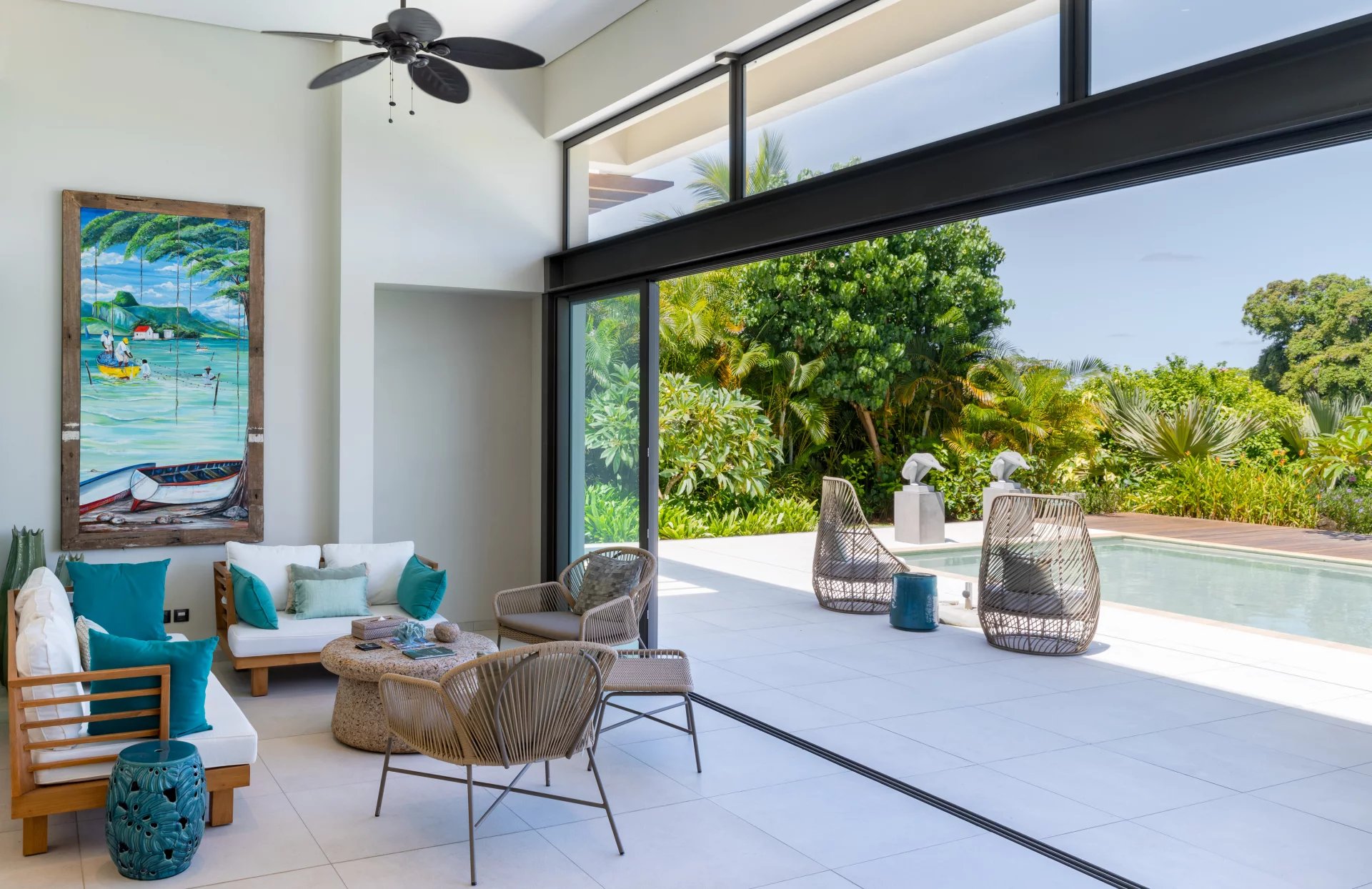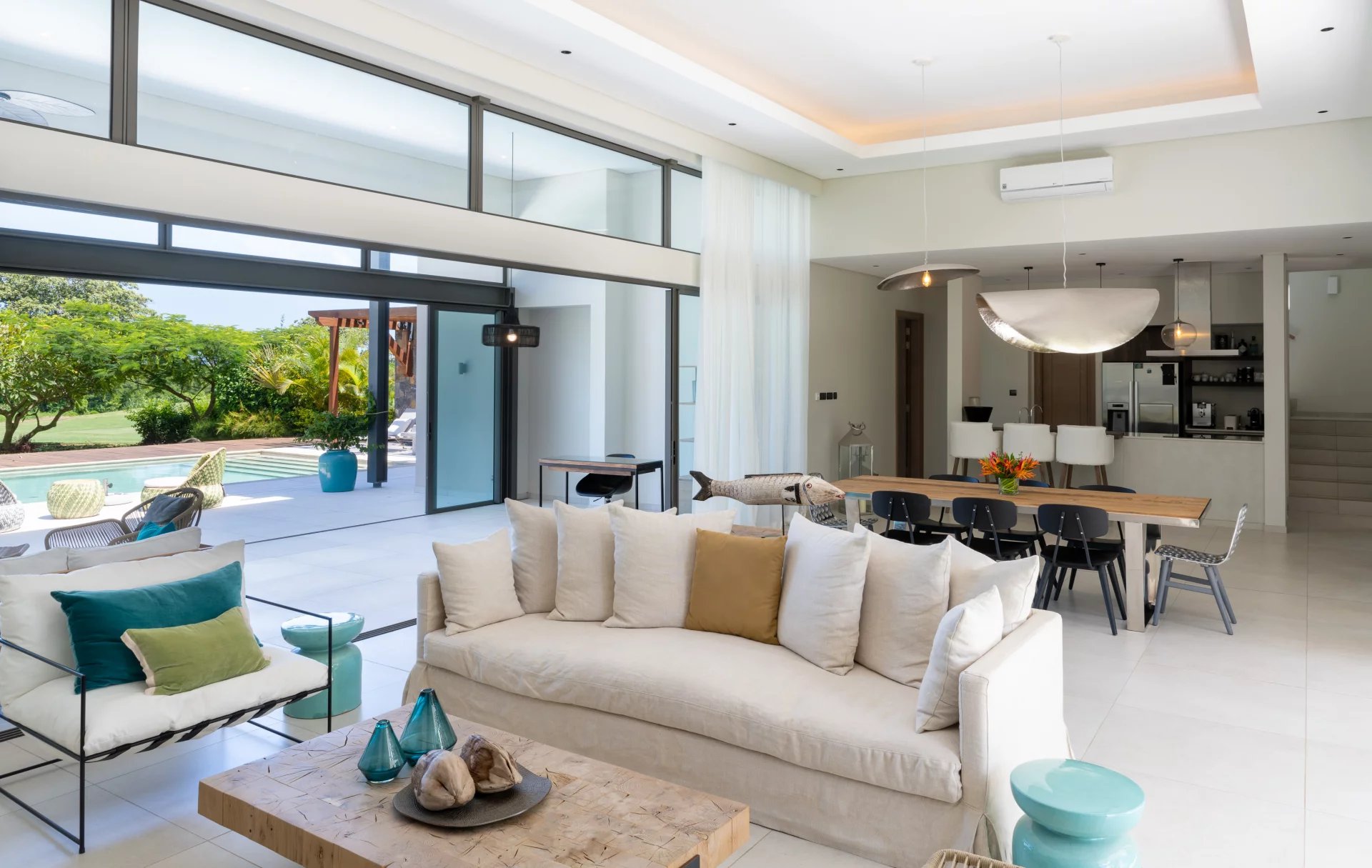 Nestled in the heart of the internationally renowned golf course, this district offers a serene living environment. Your luxury villa, on a freehold plot, will offer you a view of the fairways designed by the legend Ernie Els and of the Bamboo mountain range. This very recent 304 m2 villa has 4 bedrooms with en-suite bathrooms. Located on the edge of the golf course, it offers magnificent views of the course and the lagoon facing it. Built on a shared plot of 2,243 m2, this semi-detached villa with remarkable ceiling heights offers very bright living spaces, including a large living-dining room with American kitchen which opens onto a beautiful terrace and a swimming pool with large dimensions. It also has a roof terrace with a panoramic view to share superb moments of conviviality with family or friends.