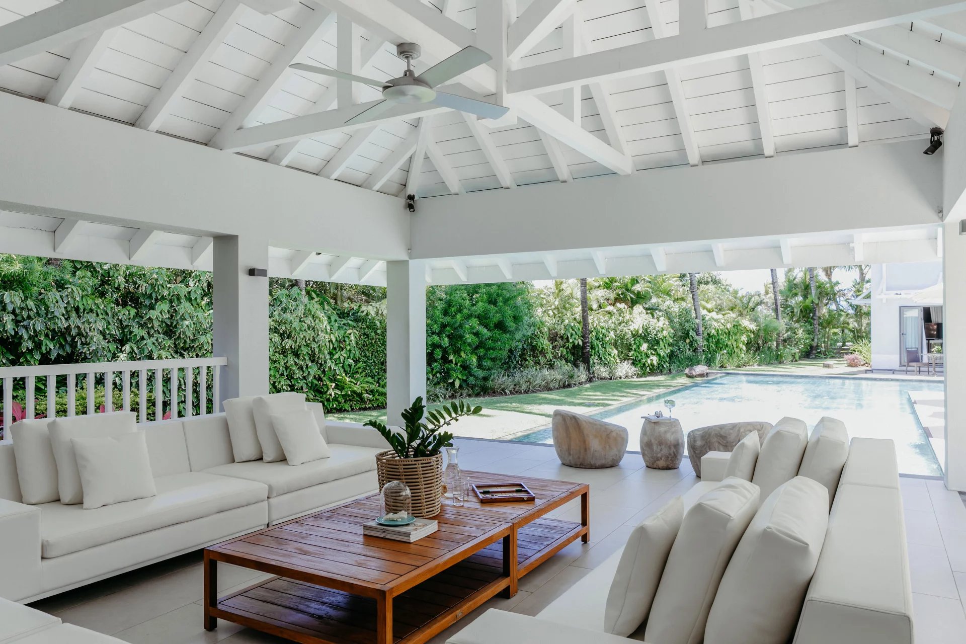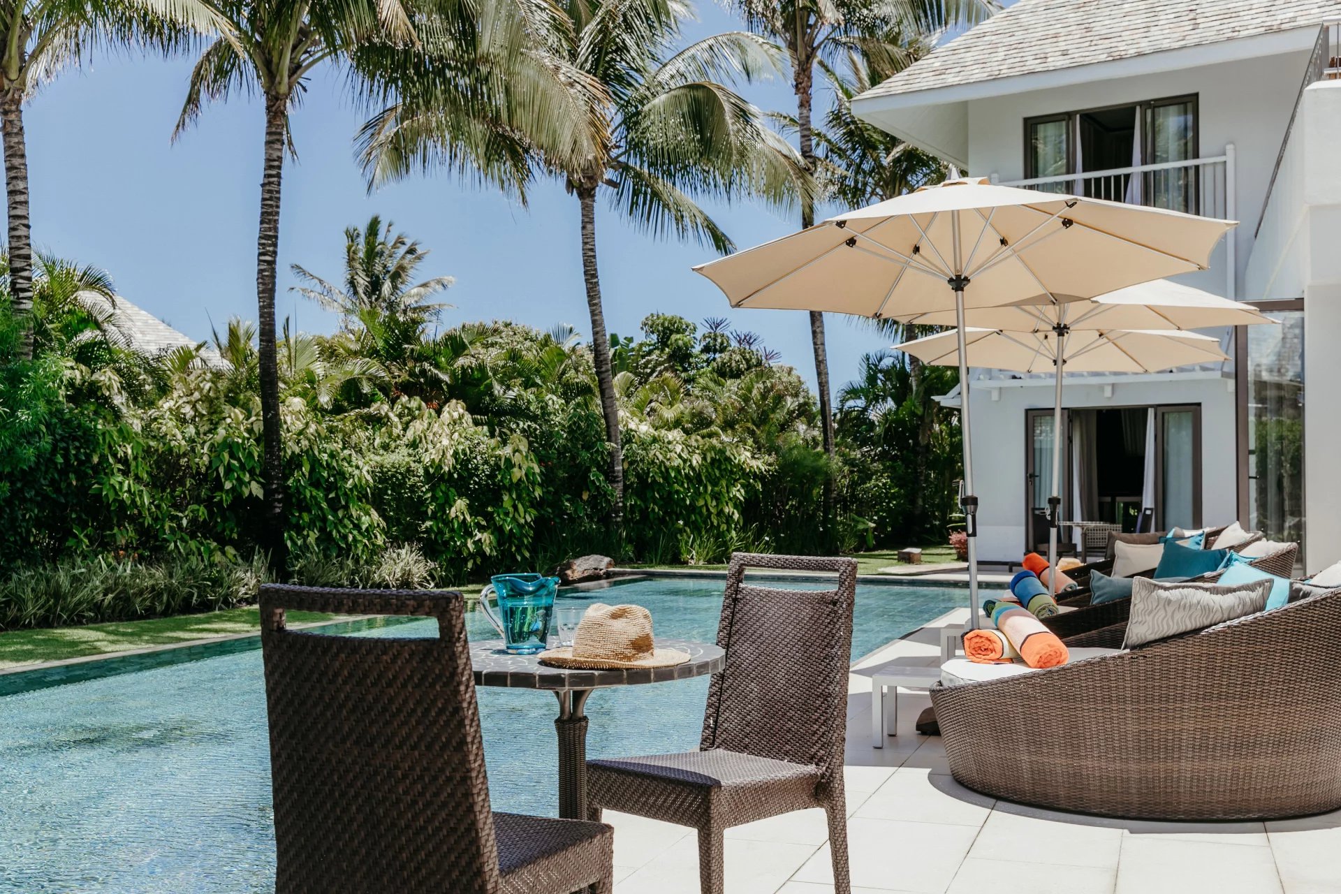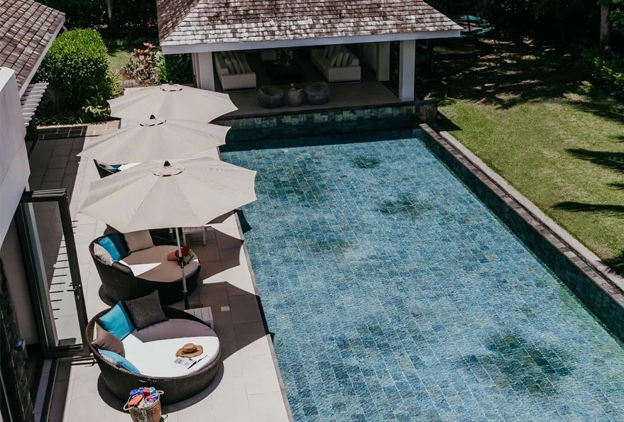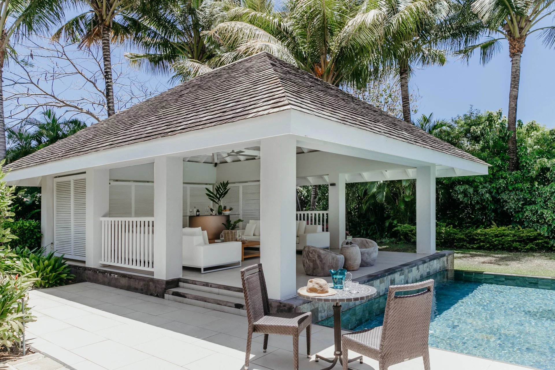 The villa's living room and dining room open onto the landscaped garden and large natural stone swimming pool, creating a bright and spacious living space that is perfect for relaxing and socializing. The outdoor kiosk, bordering the pool, is an ideal place to entertain or simply relax with family or friends.