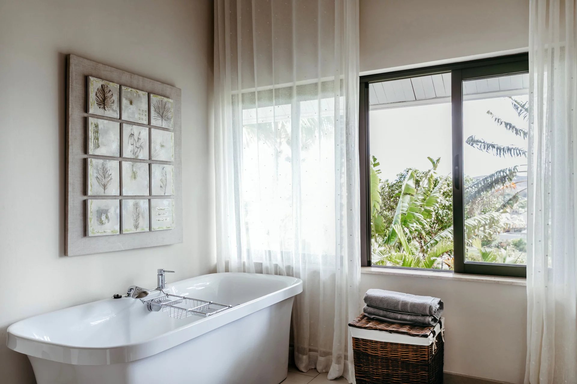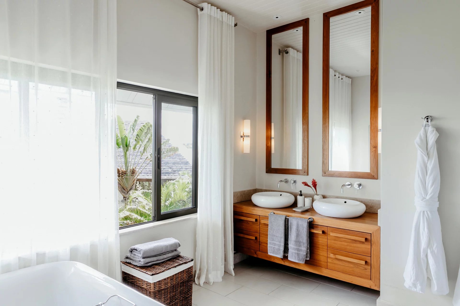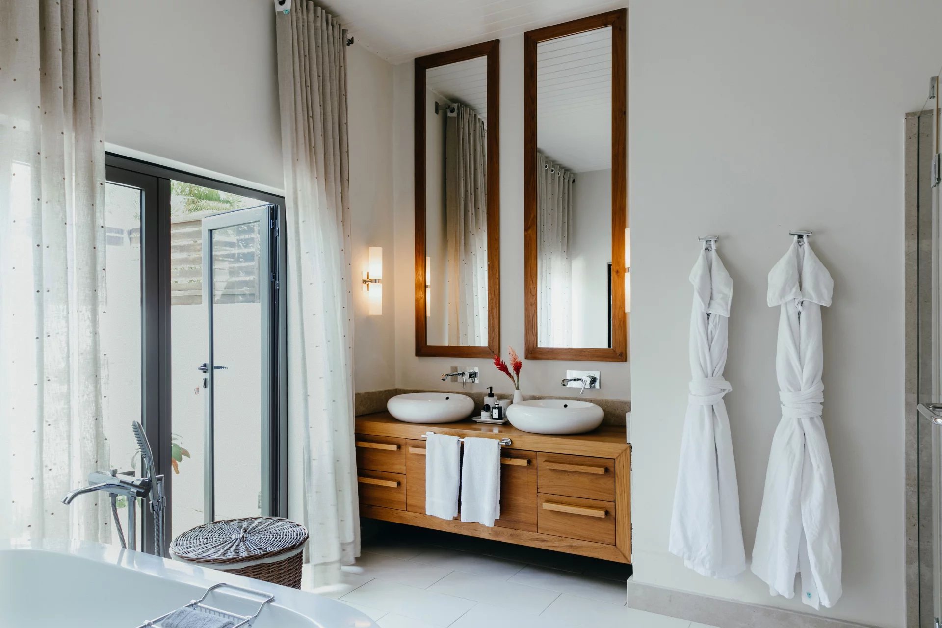 The villa consists of 4 large bedrooms, each equipped with bathrooms and dressing rooms, as well as an annex offering 2 additional bedrooms for optimal comfort. The "master" bedroom located upstairs offers direct access to a wooden decking terrace with a view of the nearby lagoon and ocean.