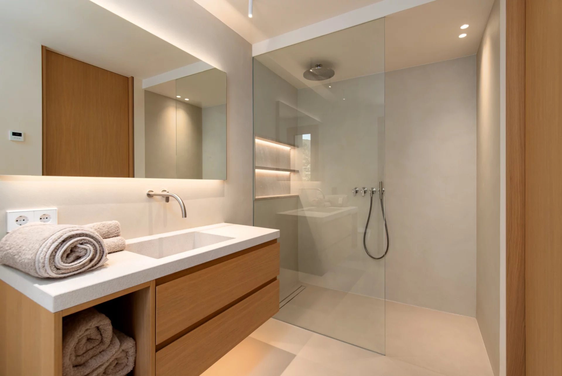 On the lower level there is an exclusive wellness area with fitness area and separate bathroom, a sophisticated air-conditioned wine cellar and a large garage for three vehicles.