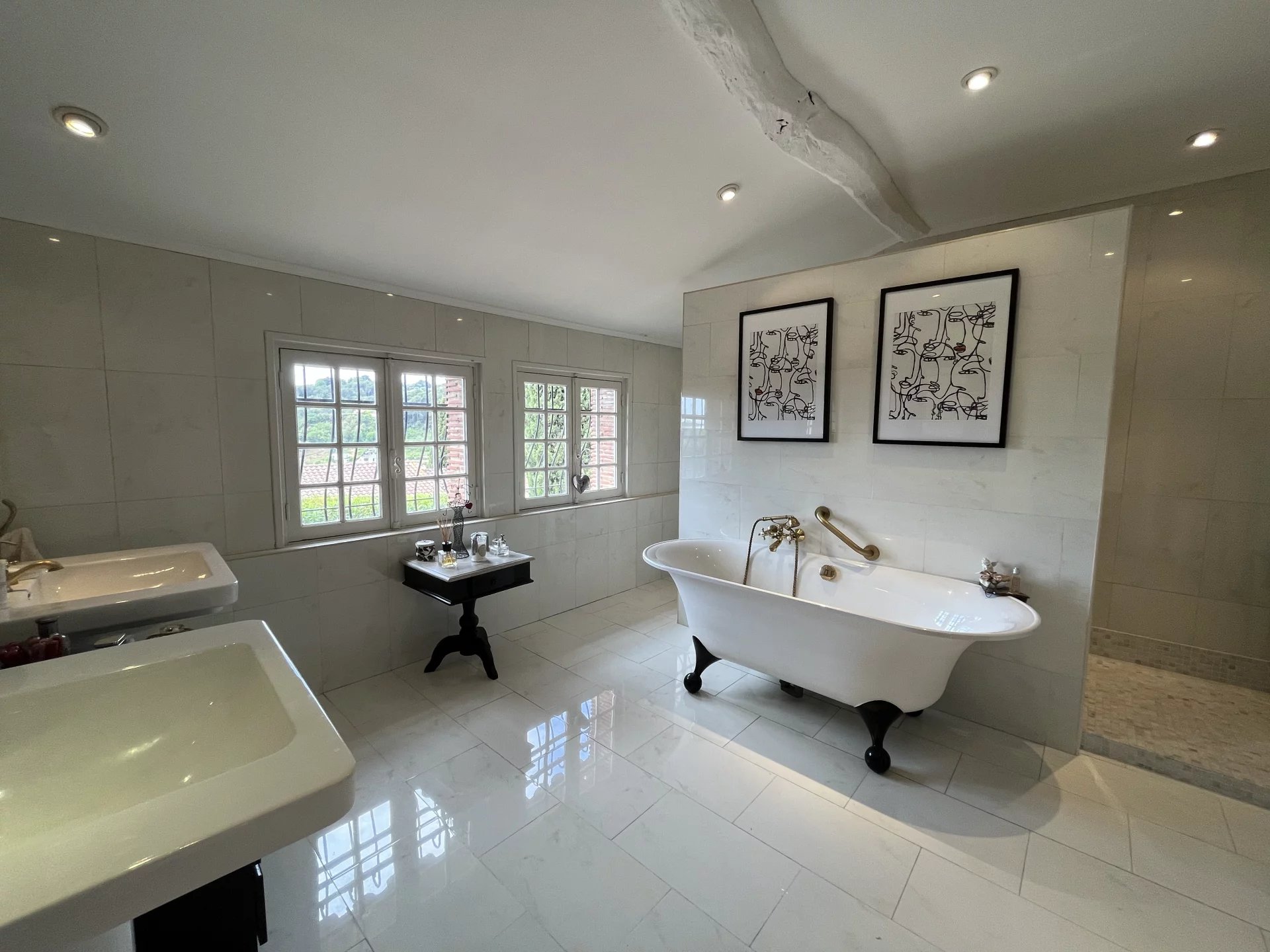 Inside, the house features five spacious bedrooms, several cozy living rooms, a dedicated office, and a wine cellar — all bathed in natural light thanks to large windows and openings.