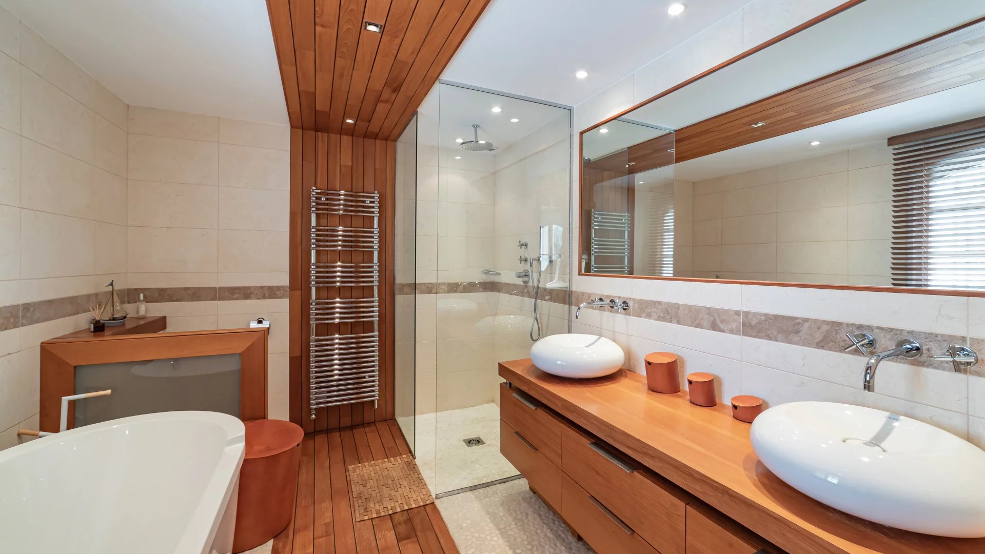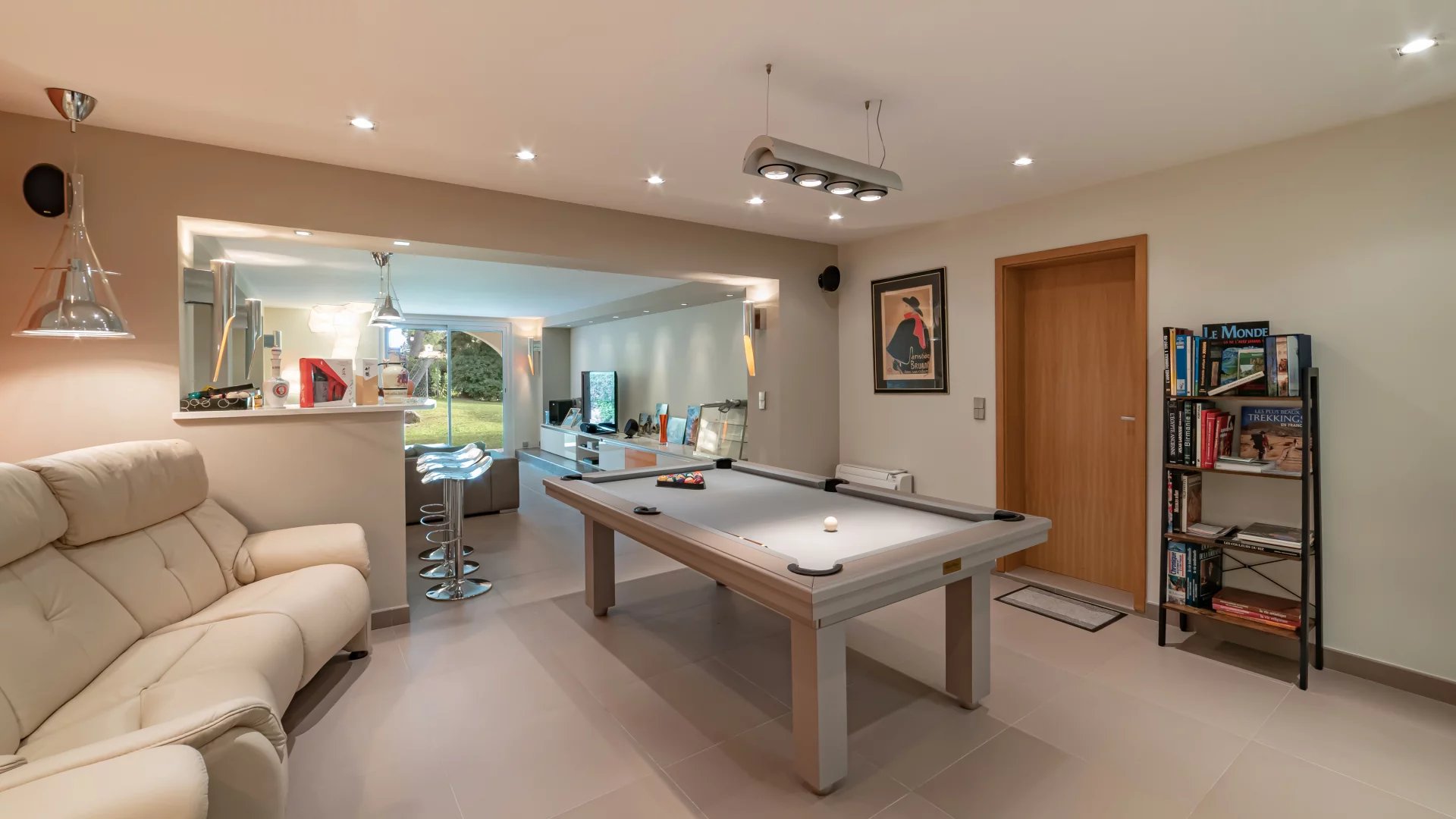 On the garden level, a vast space dedicated to leisure activities includes a gym, a relaxation area with jacuzzi and sauna, a cinema room, and a lounge opening onto the garden, equipped with a billiards table, a bar and a wine cellar.