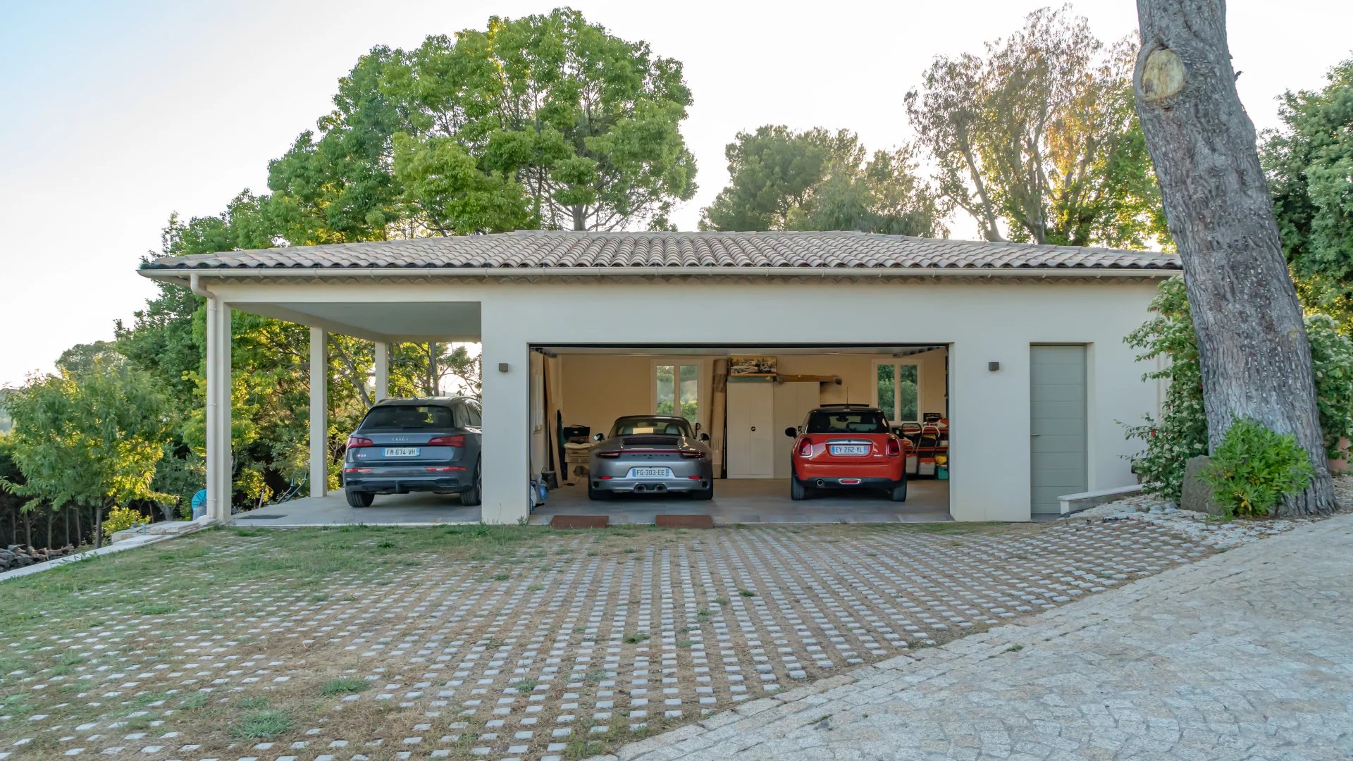 The property also has a large double garage, a carport, numerous parking spaces and a workshop, all bordered by a cobbled driveway leading to the gate.