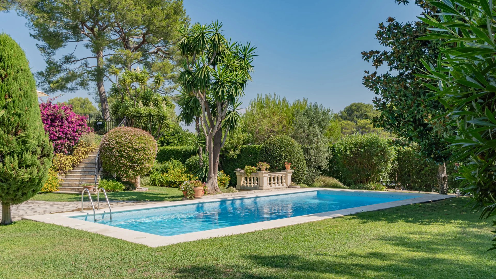 Outside, beautifully landscaped gardens surround a stunning 14-meter swimming pool and expansive terrace—perfect for soaking in the sunshine and admiring the open sea views.
