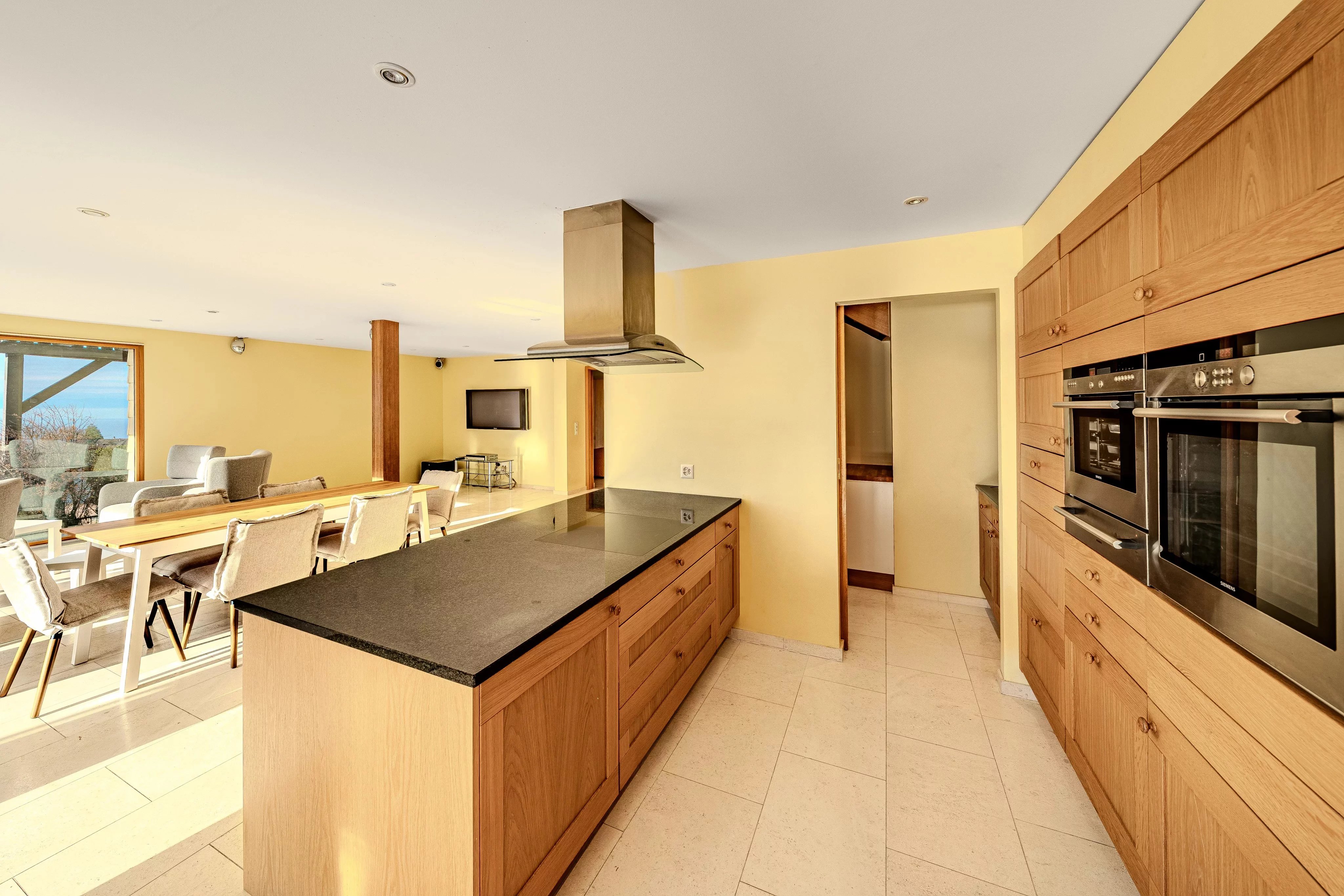 - The first floor is dedicated to the main living areas and a first sleeping area. It features a fully equipped kitchen with a central island, open to a bright living and dining area with direct access to the terrace and the swimming pool.