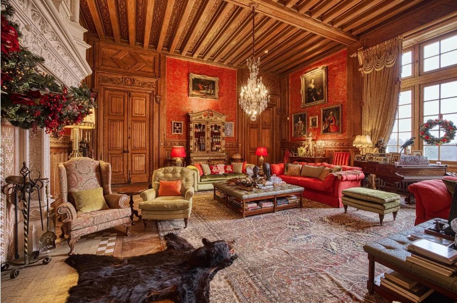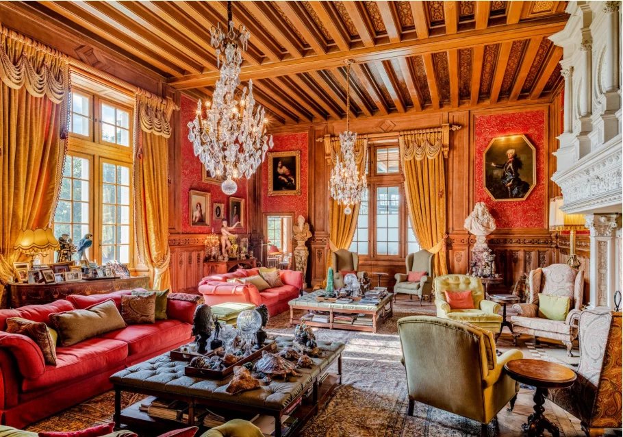The château comprises five floors housing several complete apartments with living rooms, bedrooms, bathrooms, and often kitchens.