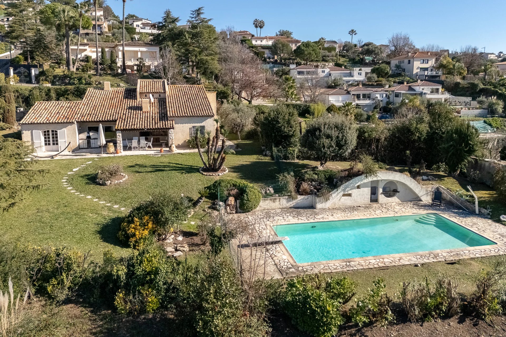 The 2400 m² flat plot offers unobstructed views and south-west exposure, guaranteeing optimal sunshine throughout the day. There's a lovely garden, a refreshing swimming pool and a pool-house for relaxing in the open air.