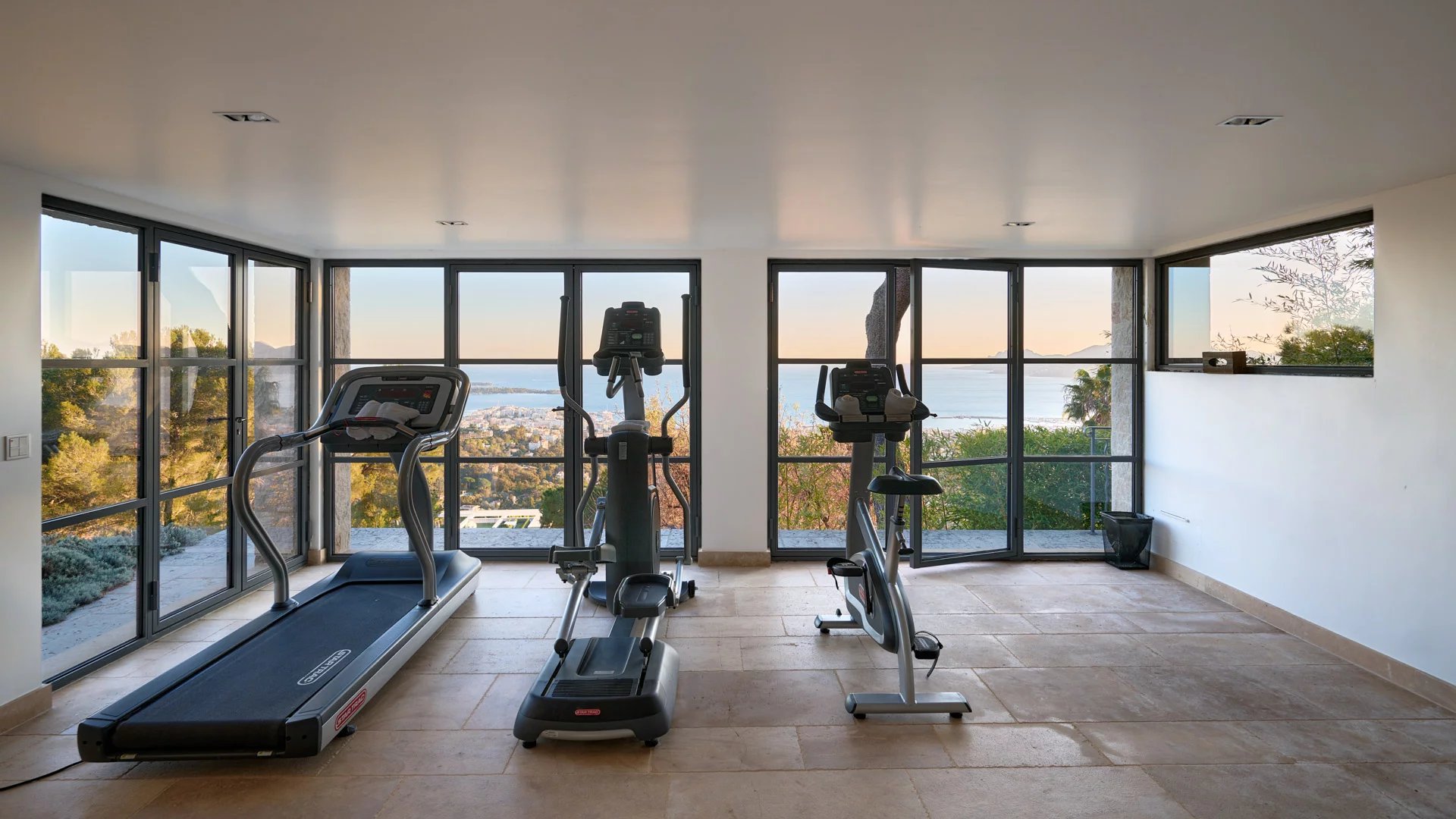 A fitness room with "Star Trac" equipment also boasts a sea view.