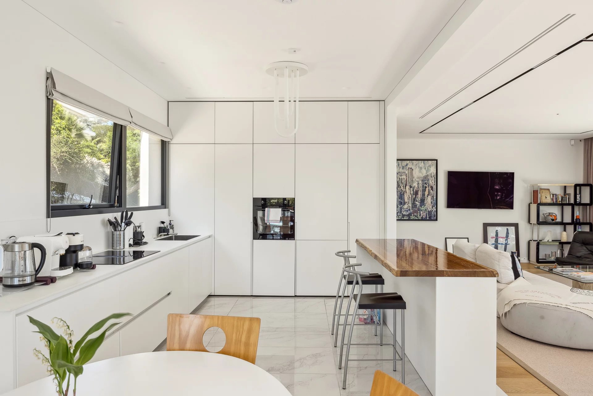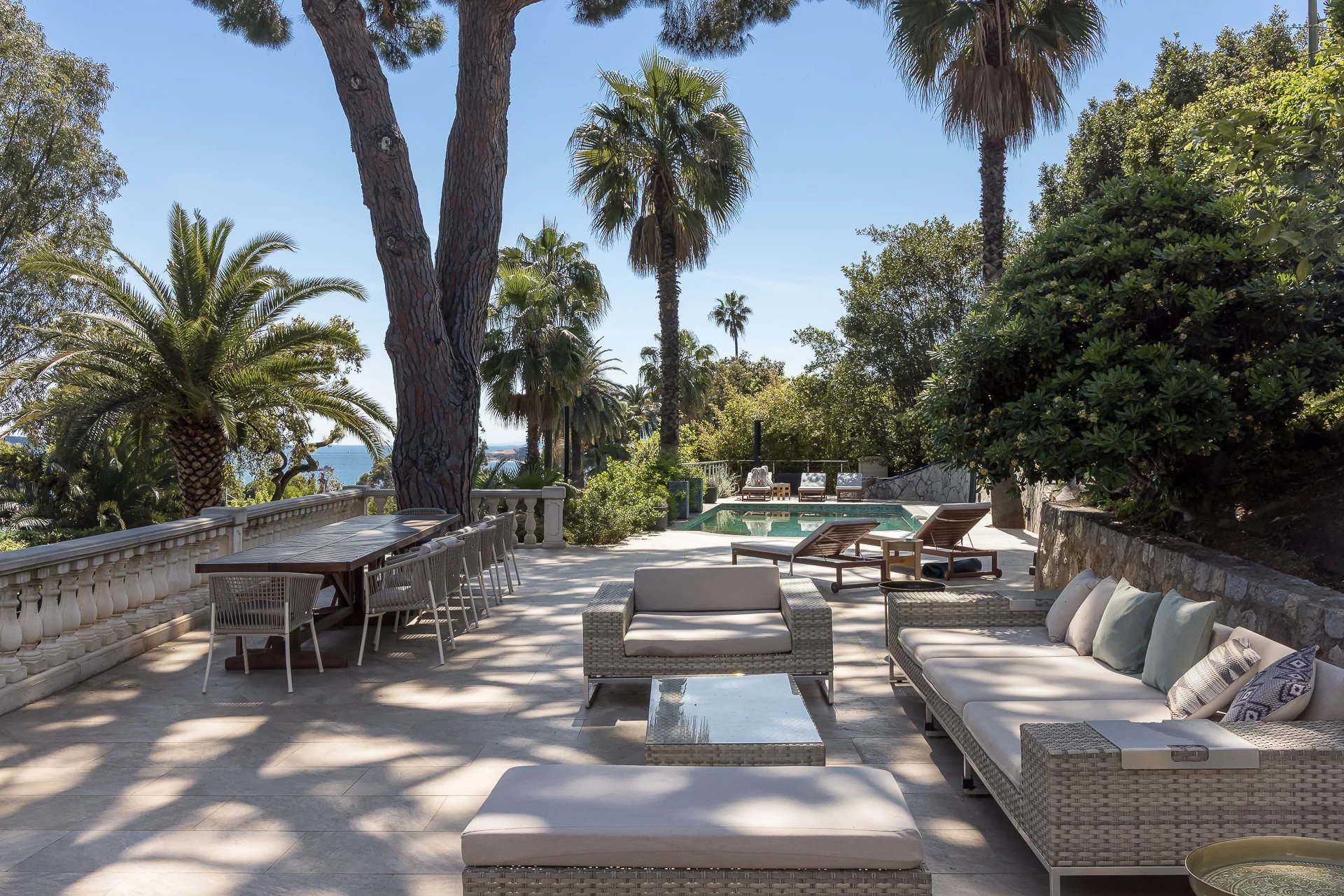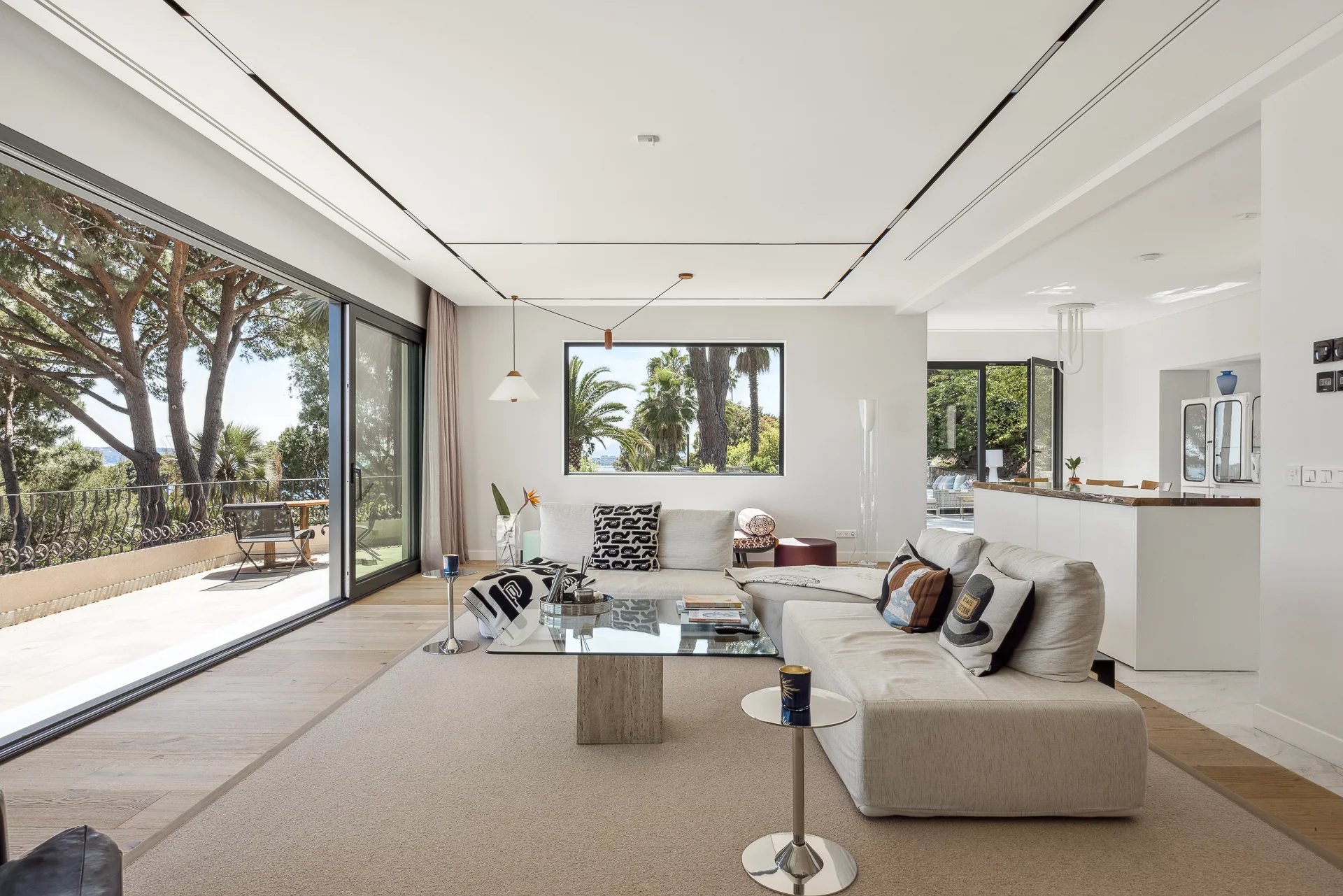 Entirely renovated using top-quality materials, the property boasts around 289 sqm of light-filled living space, opening onto breathtaking panoramic views of Cap d'Antibes, the Lérins islands and Palm Beach.