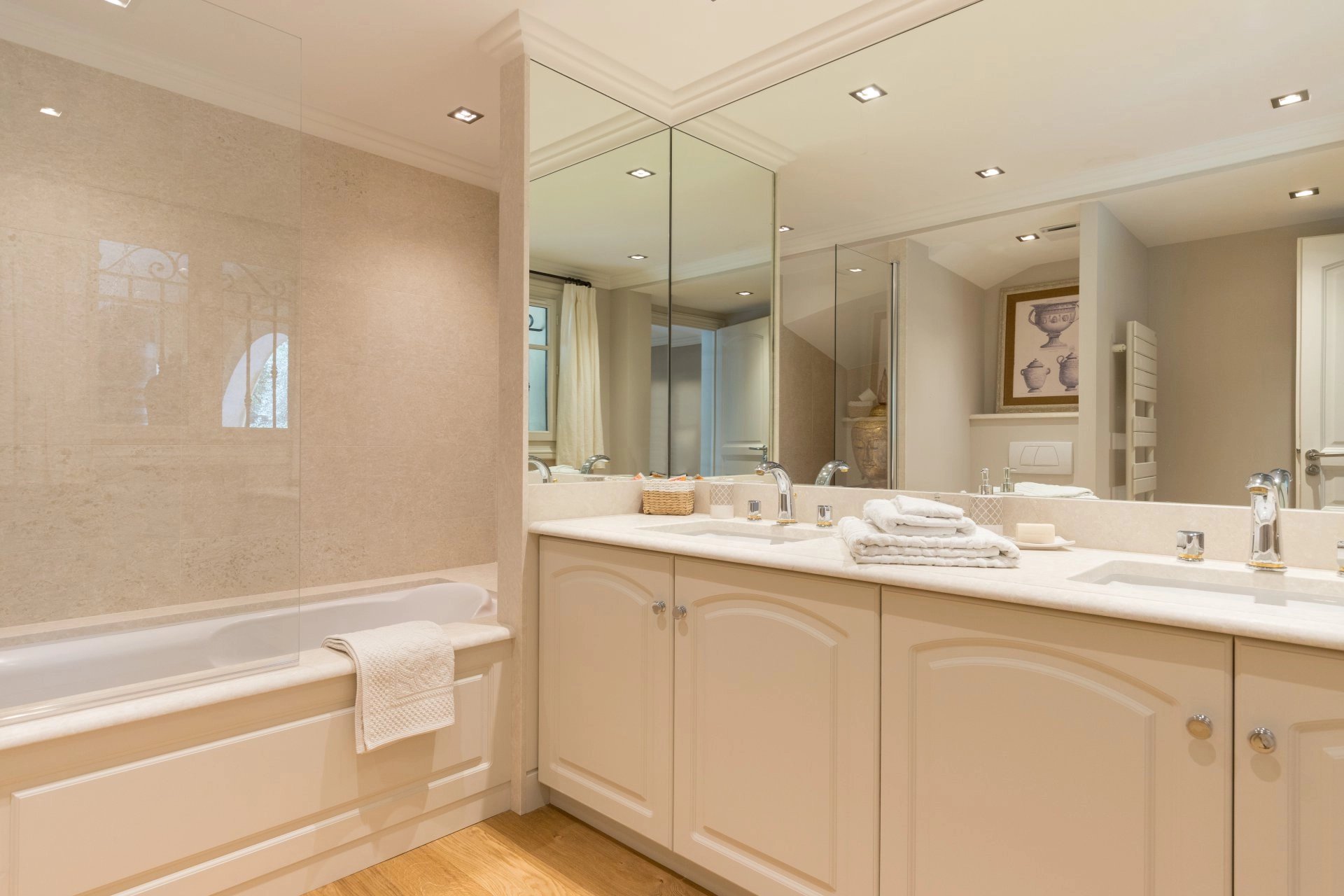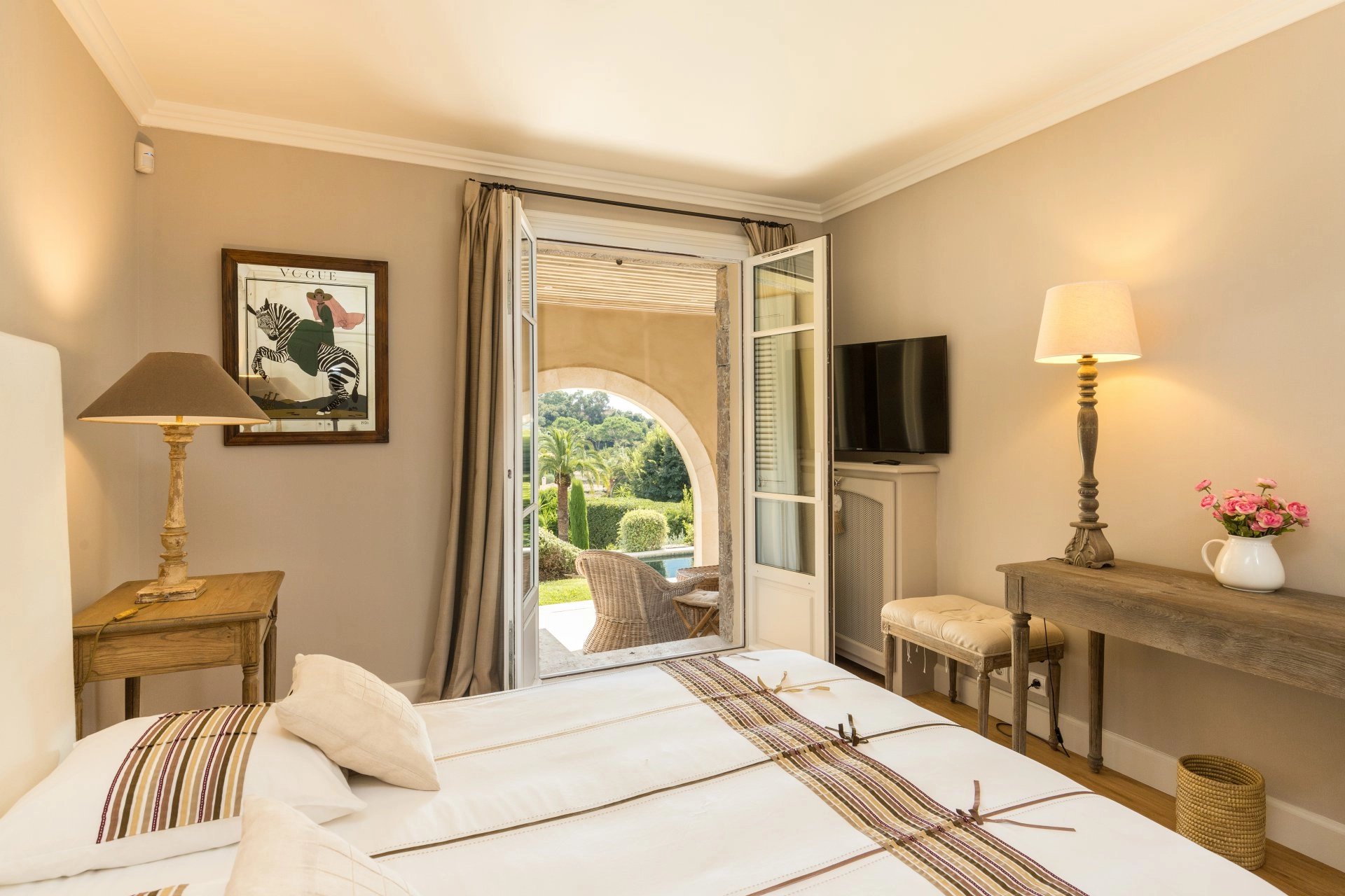 Garden level: two bedrooms, each with en suite bathroom, a wine cellar, a laundry room and a large TV lounge, all opening onto a spacious terrace and heated swimming pool.