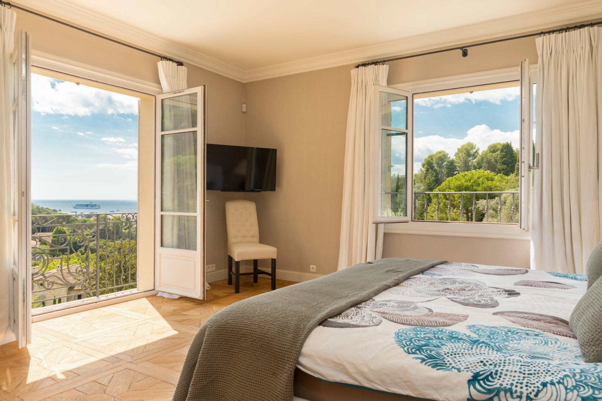 First floor: a master suite with sea view, featuring a bathroom, shower room and large dressing room, as well as a bedroom with private shower room and separate dressing room.