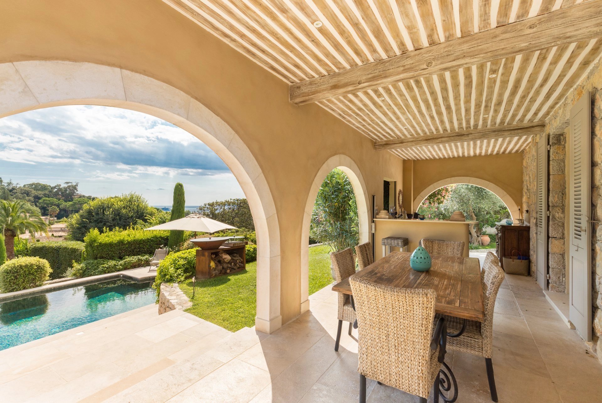 Outside areas: summer dining room with fully equipped outdoor kitchen (hob, dishwasher, fridge).