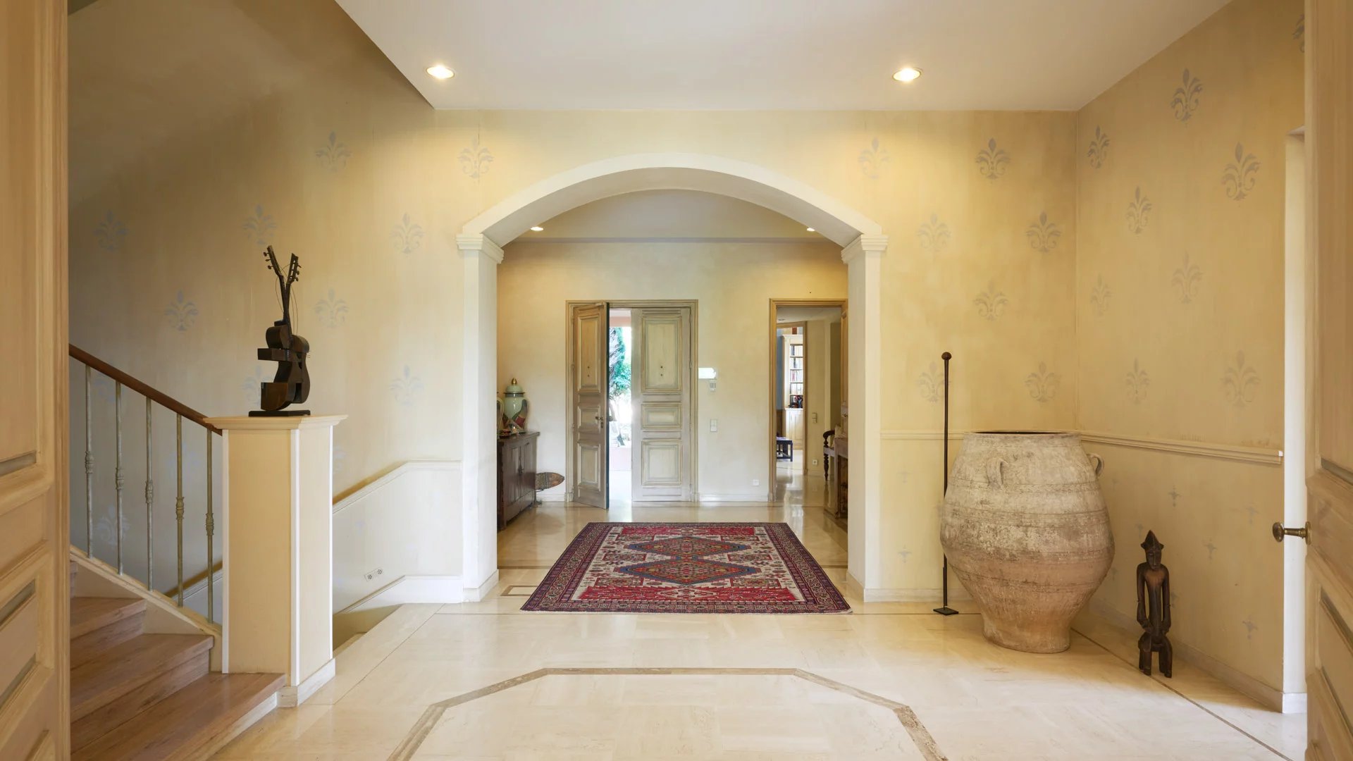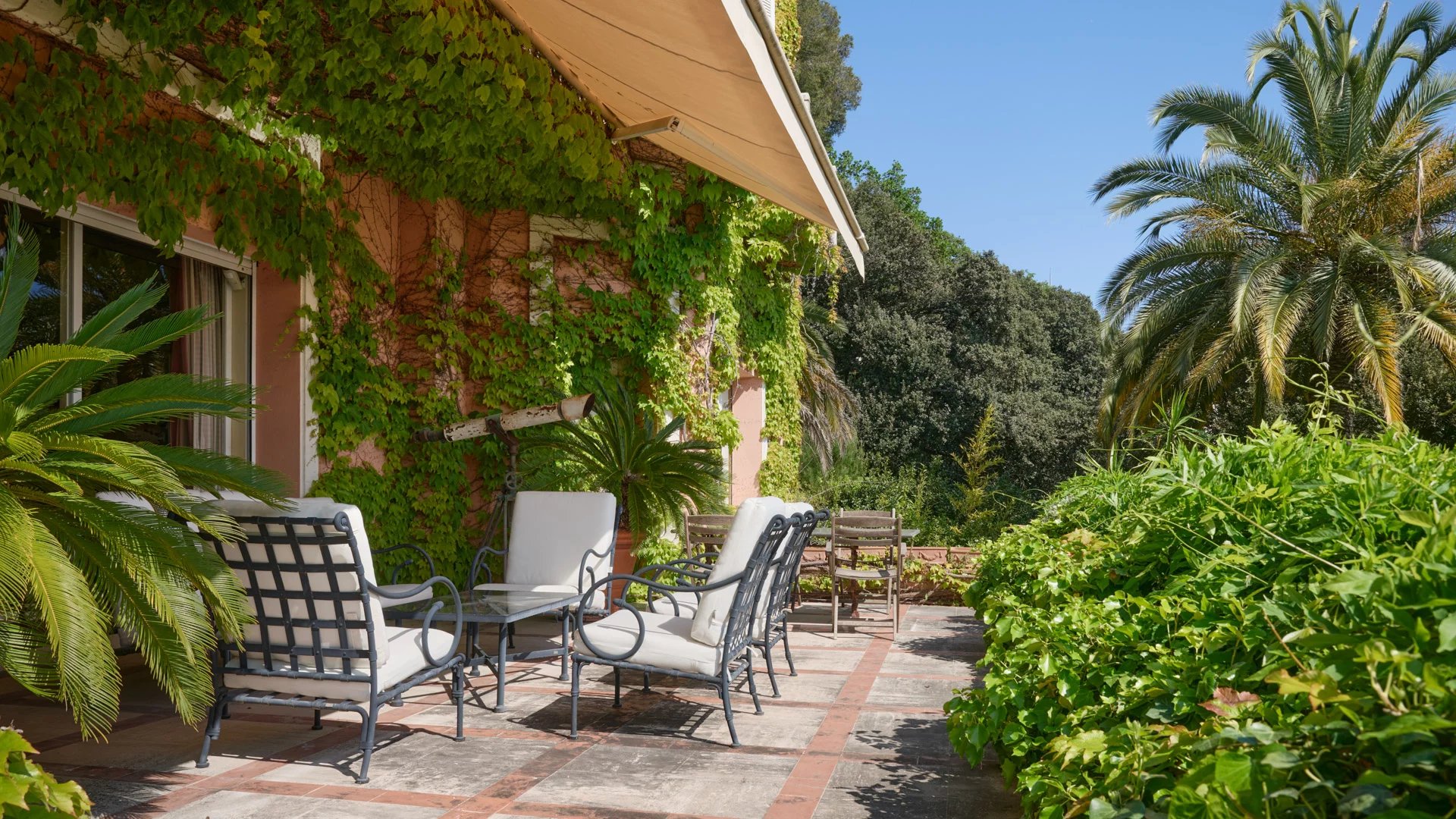 - Triple reception room with fireplace opening onto the terrace with views of the Suquet and Esterel mountains, with office leading to the independent bedroom at garden level with bathroom and dressing room.