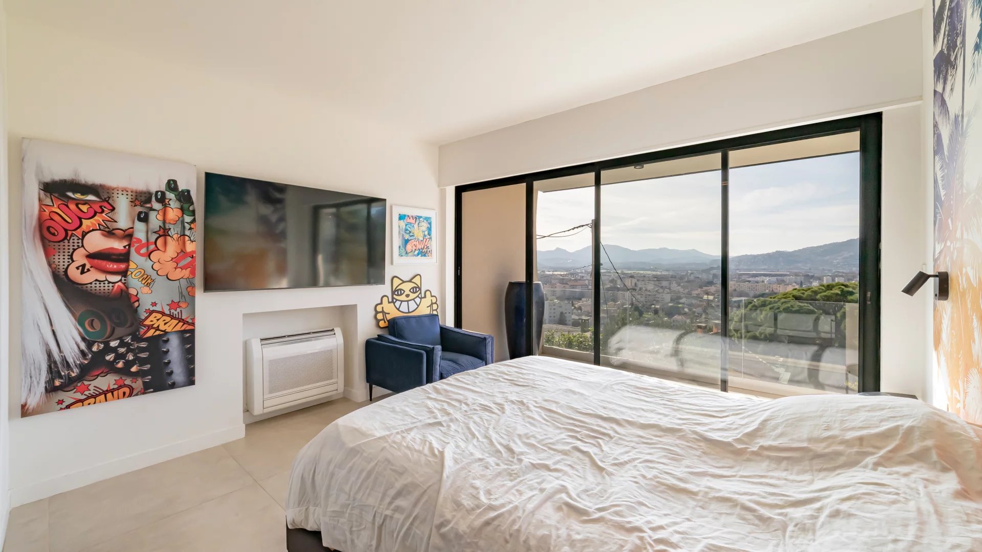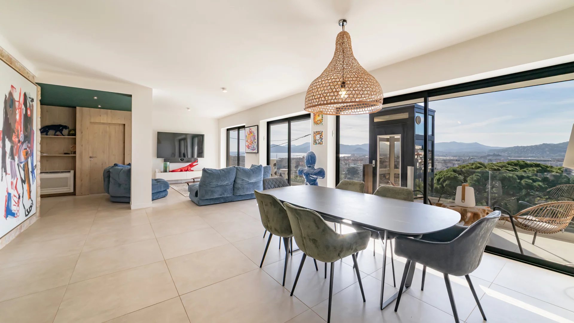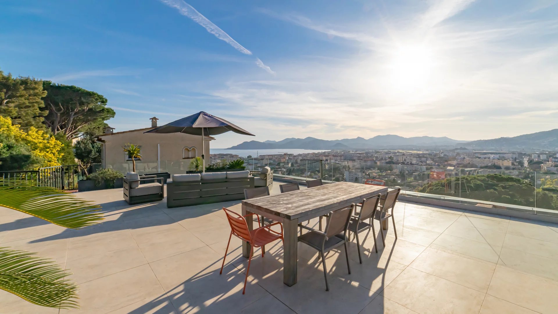 Contemporary villa with roof terrace, fully renovated with panoramic views of the sea, the Esterel and the Tanneron. With approx. 170 sqm of living space, the villa is composed as follows: Garden floor : - 3 bedrooms ; - A bathroom; - A shower room; - Separate toilet. First floor : - Entrance hall ; - Living/dining room ; - Open-plan kitchen ; - Guest WC ; - Master bedroom with shower room and dressing room; - West terrace ; - East-facing terrace with summer kitchen. Second floor : - Roof terrace. The property also features a swimming pool, garage and two parking spaces.