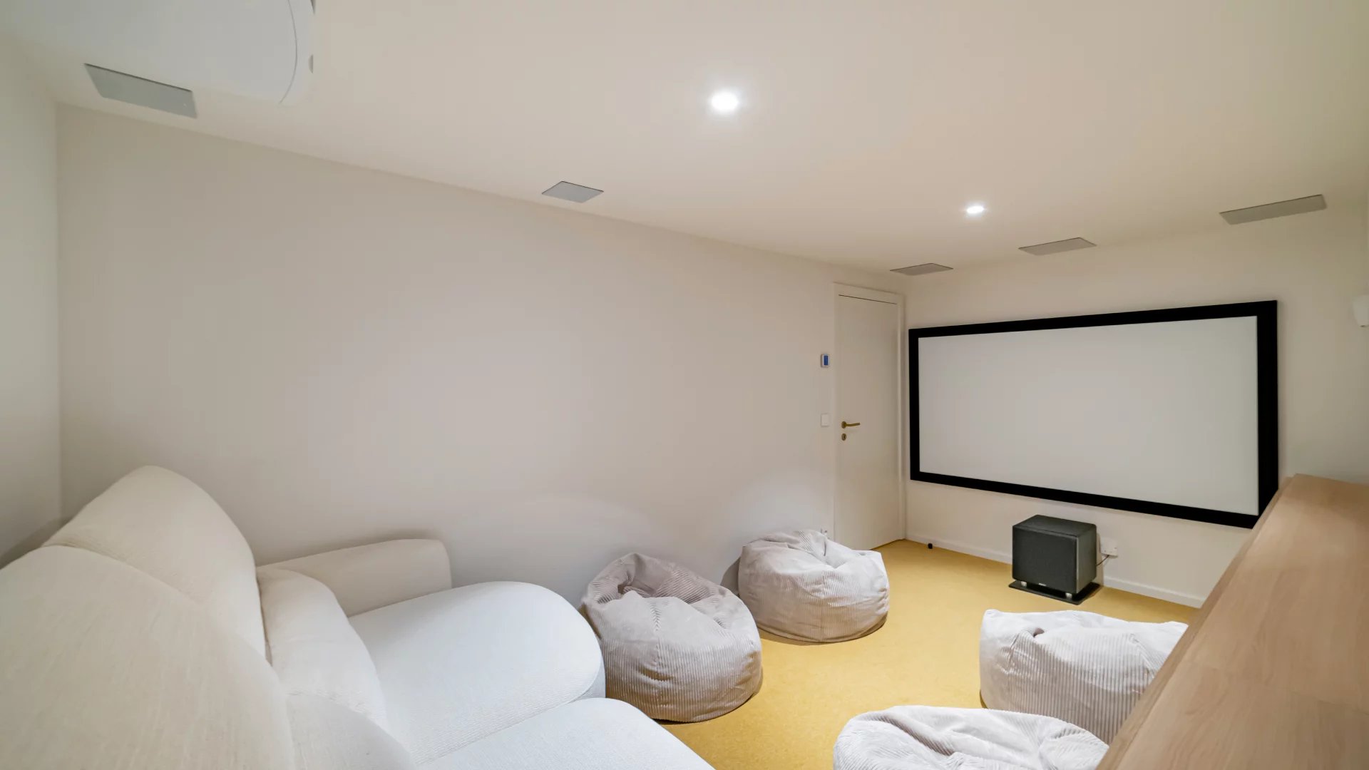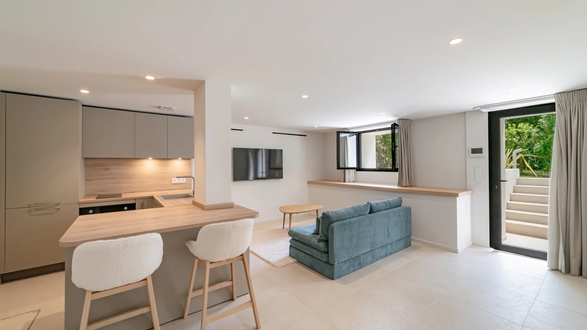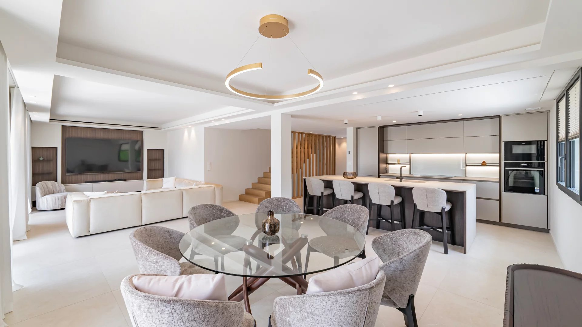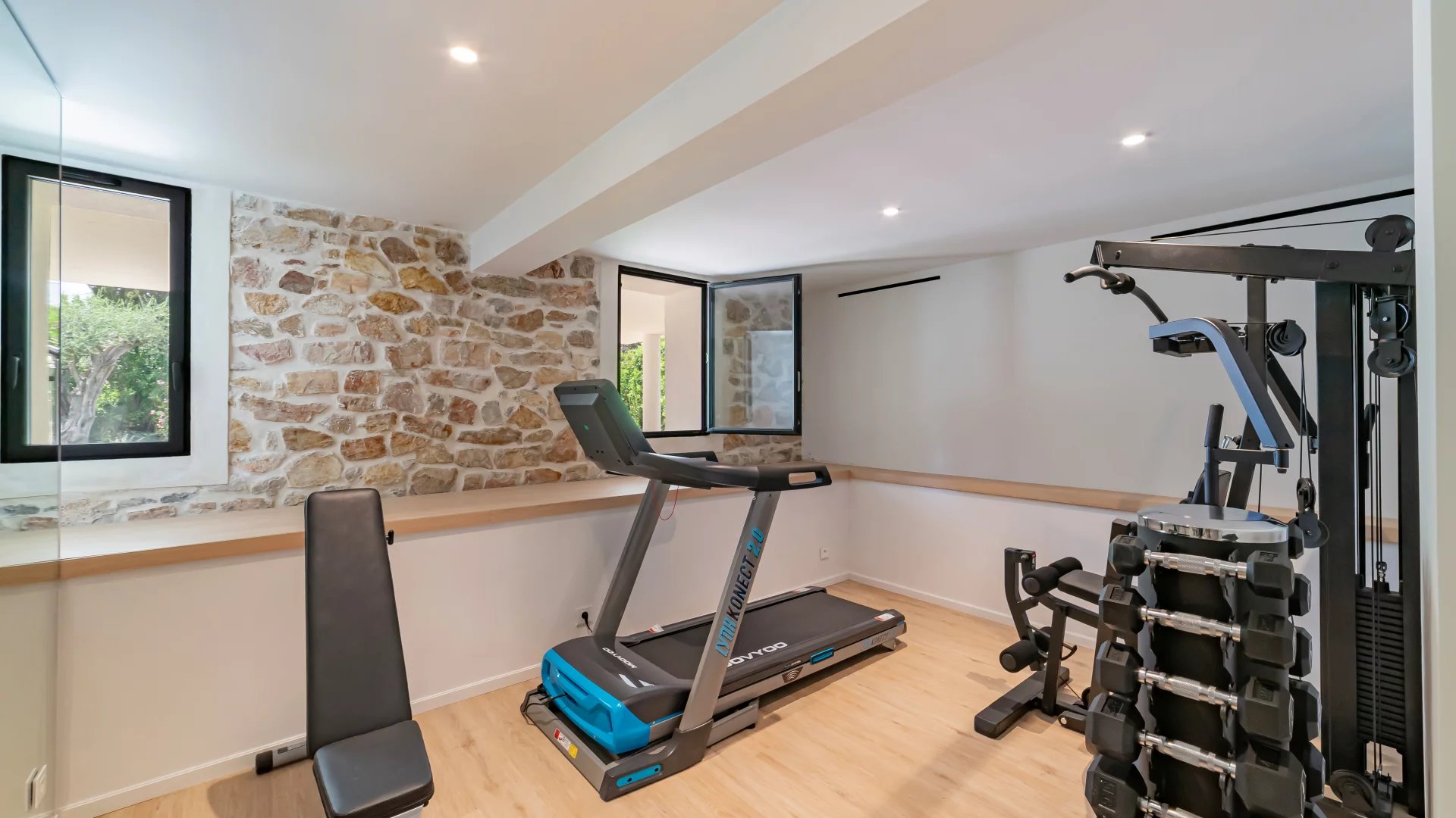 Garden level: fitness area, cinema room and an independent apartment comprising a living room with kitchen, bedroom and shower room.