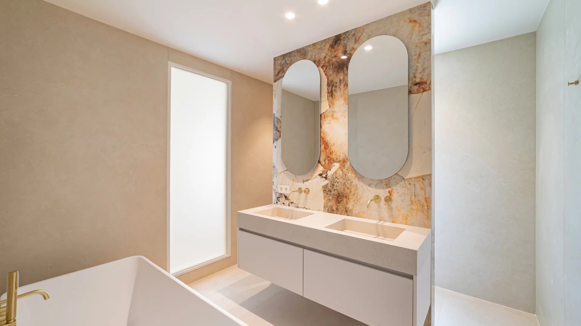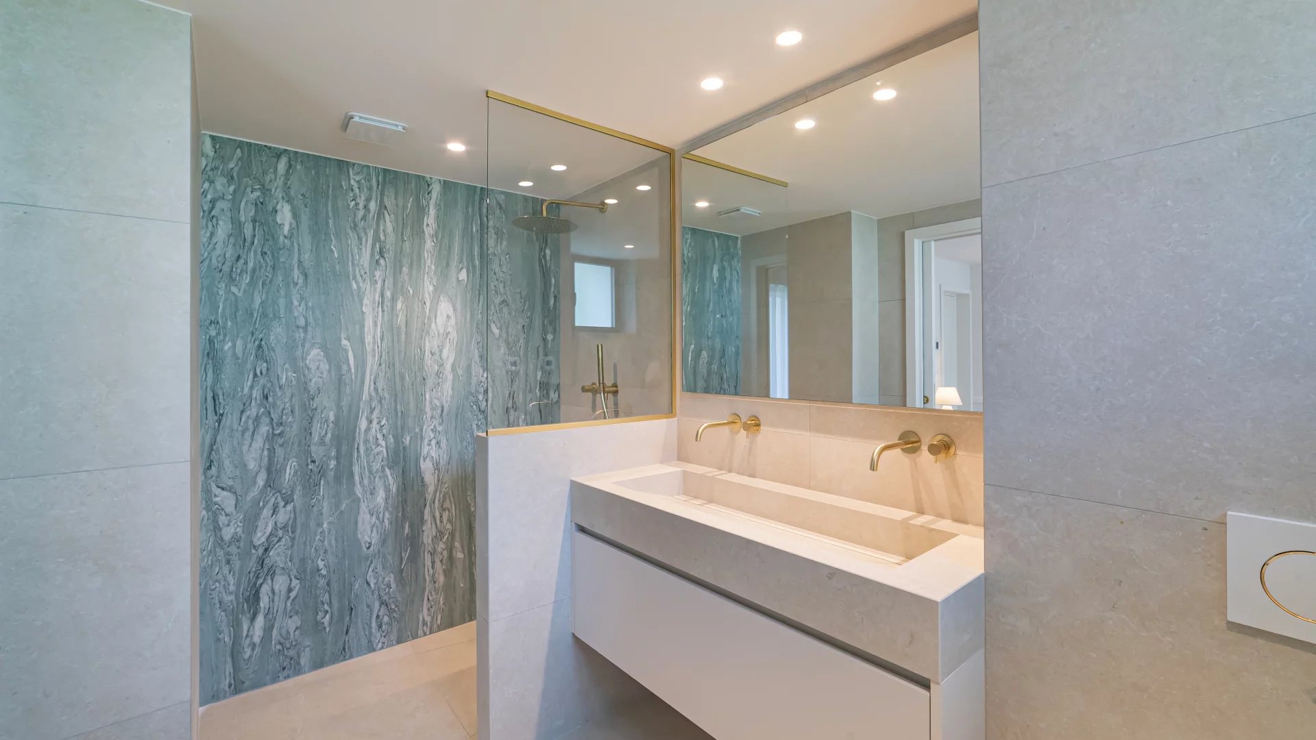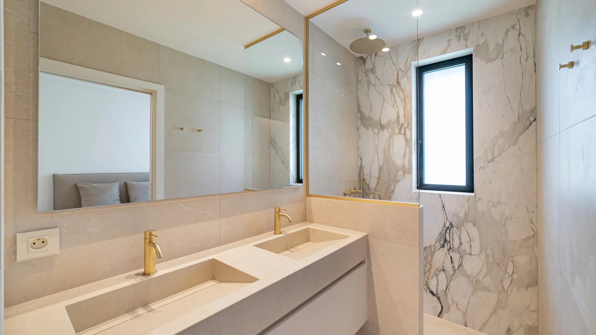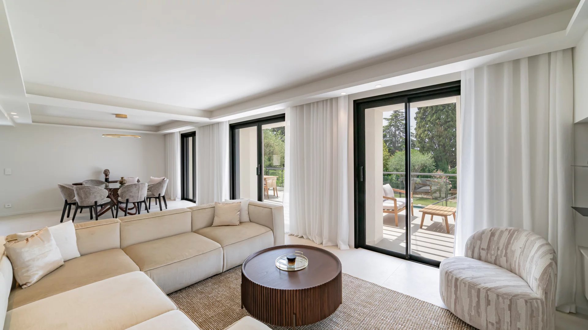 Garden level: fitness area, cinema room and an independent apartment comprising a living room with kitchen, bedroom and shower room.