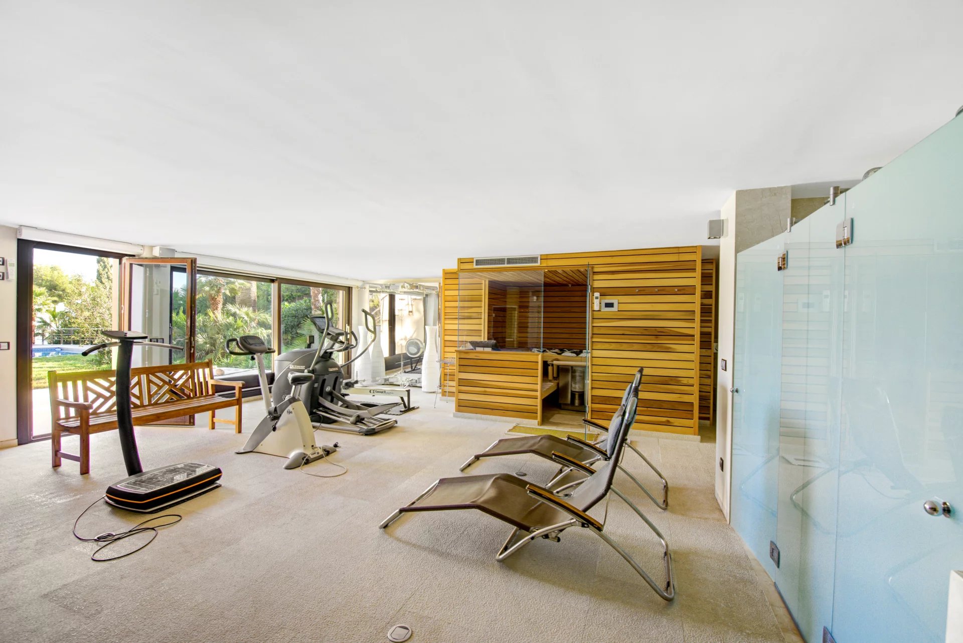 On the lower floor there is another living room, a small kitchen and 2 bedrooms with bathroom en suite. The spa and fitness area consists of a sauna, a Turkish bath, a bathroom and the gym with a variety of machines. This area connects perfectly with the terrace with jacuzzi and from there you can access the large garden with solarium, swimming pool and the multi-sports court. There is also an apartment for the staff there.