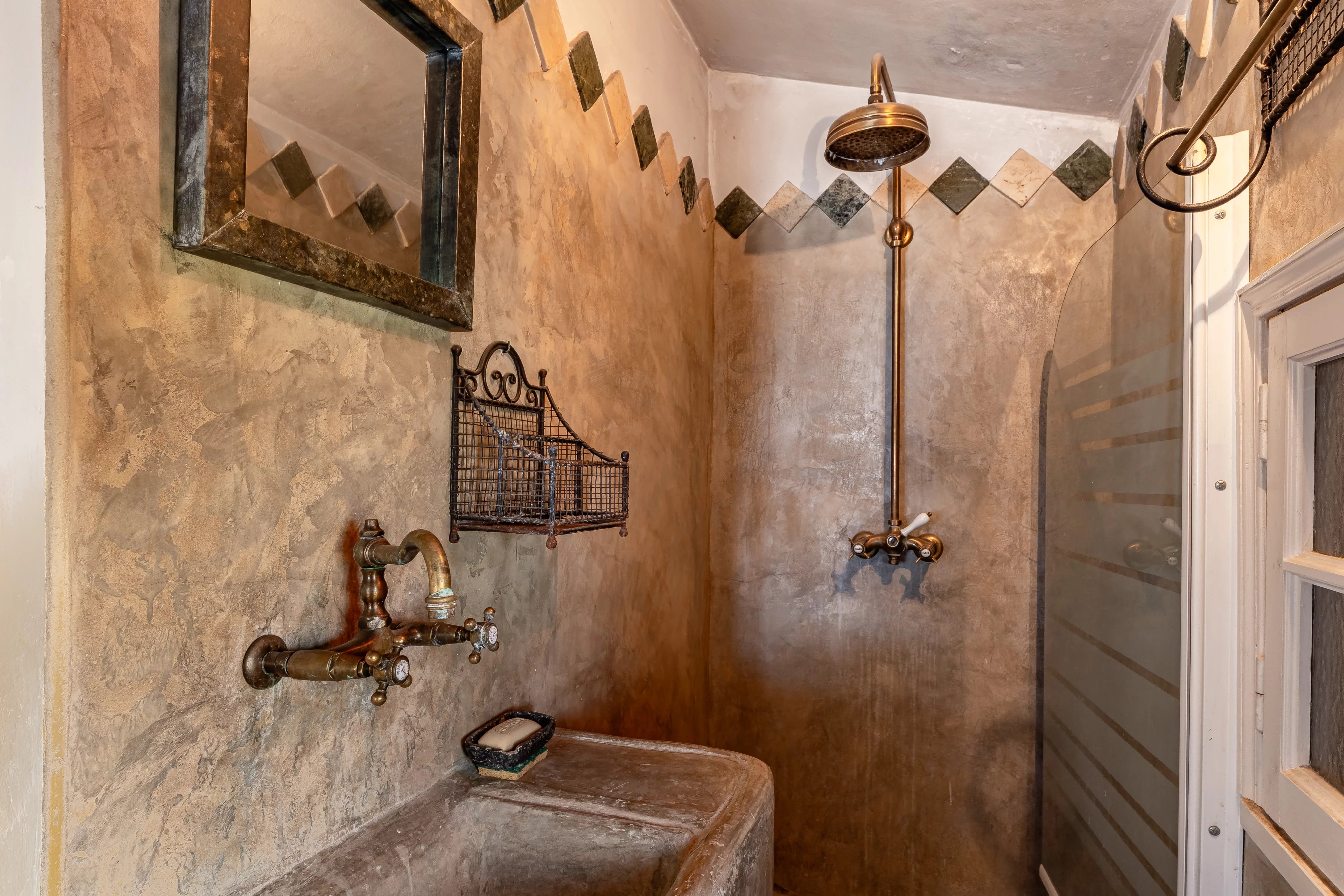 Upstairs, the landing leads to three bedrooms, one of which includes a shower and a washbasin, a bathroom, and separate toilets.