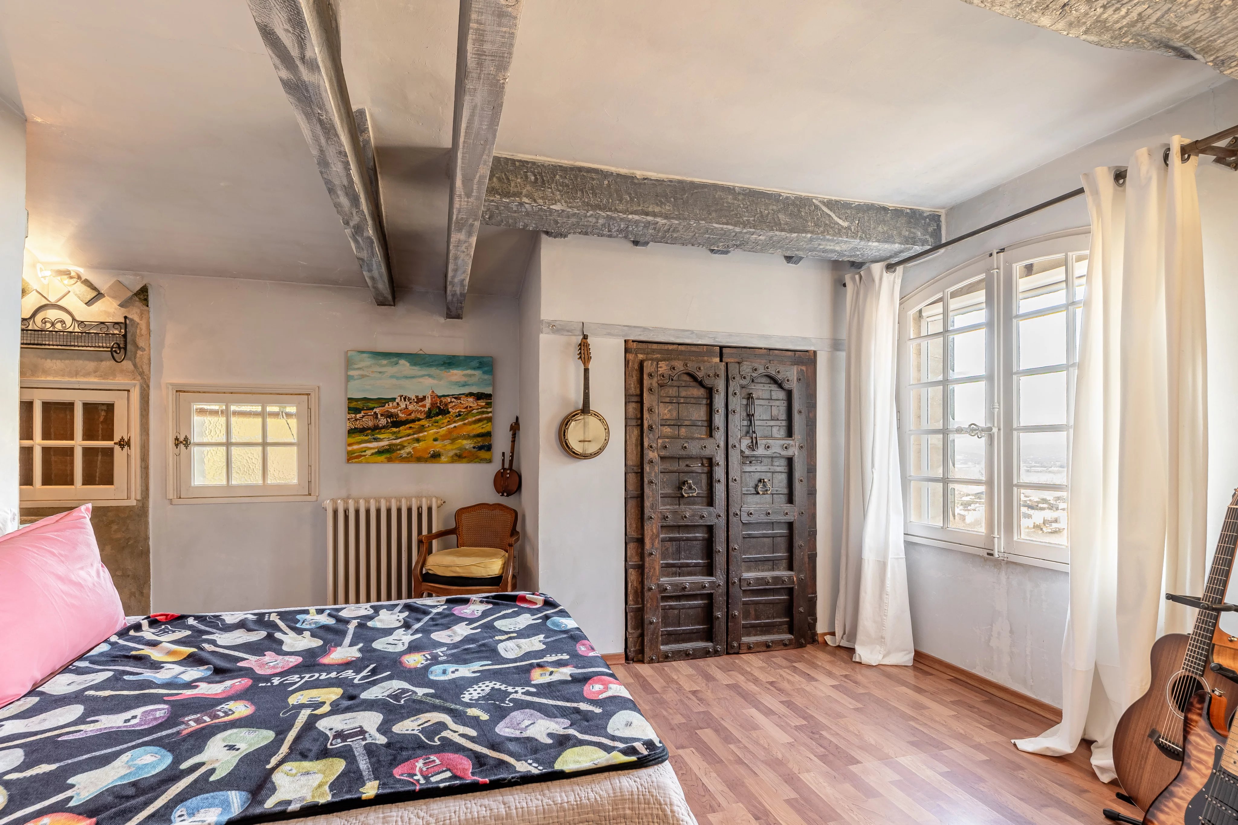 On the ground floor, the house features a small fitted kitchen, a pantry, a nice living room with fireplace, as well as a second lounge opening onto a terrace overlooking the town and the Luberon mountain range.