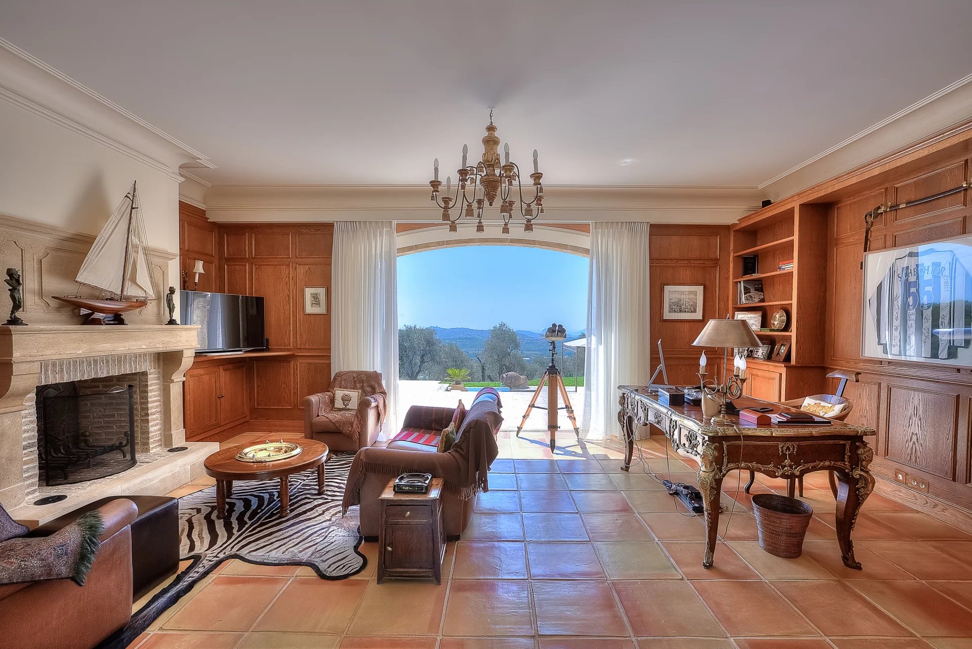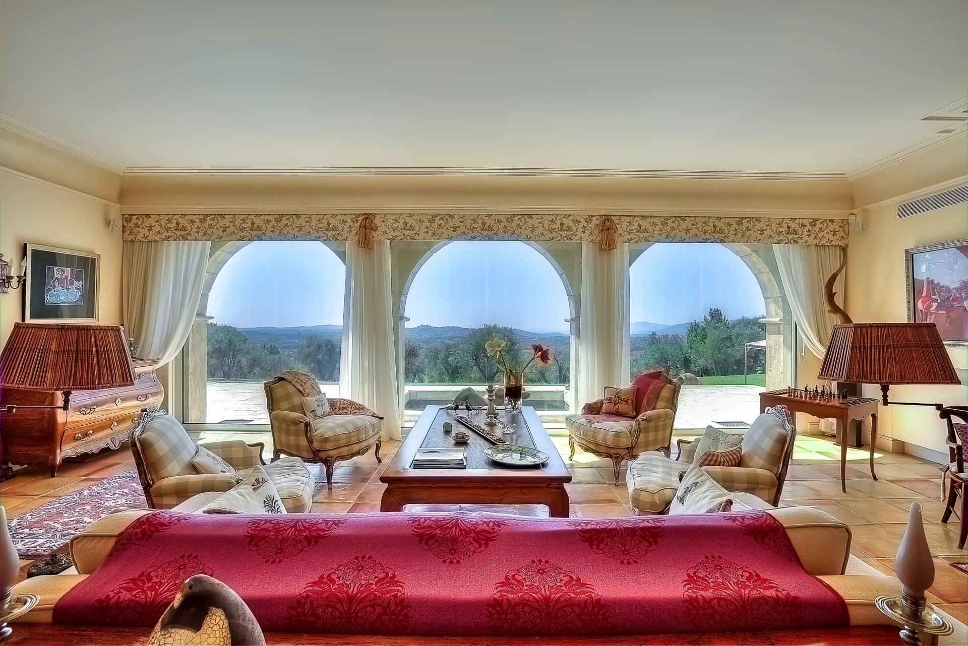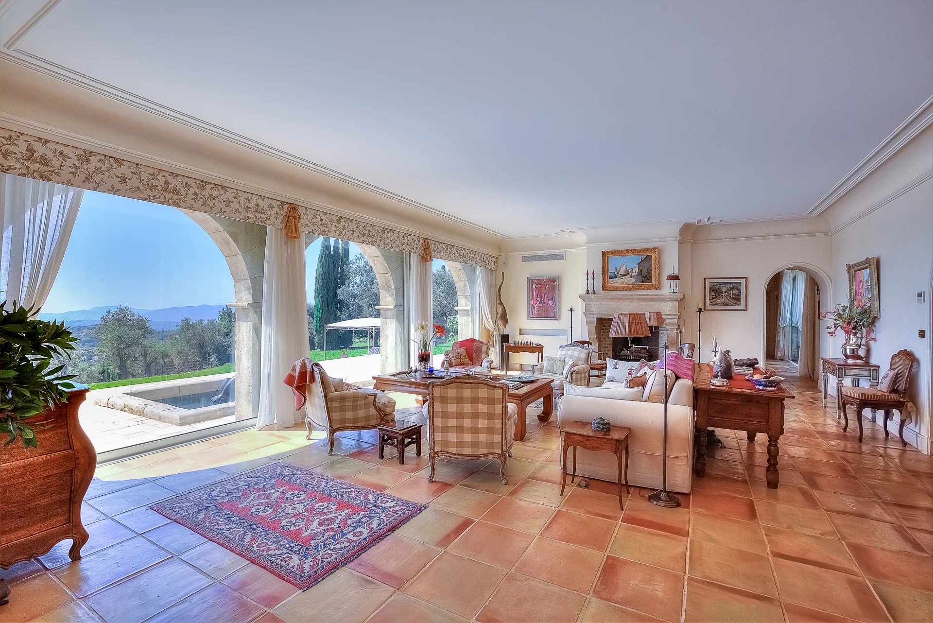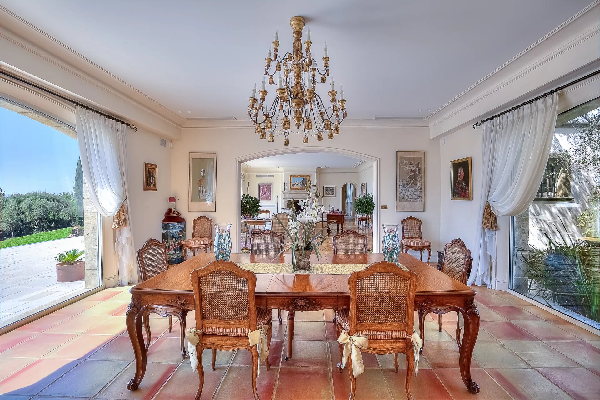 This prestigious property, which combines sophistication, comfort, and security, spans approximately 600 square meters of living space and offers breathtaking views of the golf course and the stunning Mediterranean panorama from the Bay of Nice to Mandelieu.