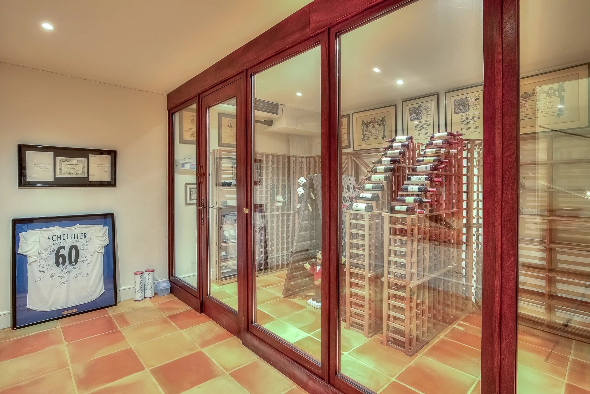 In the basement, there is a very fine air-conditioned wine cellar and a cigar cellar, as well as a game room.