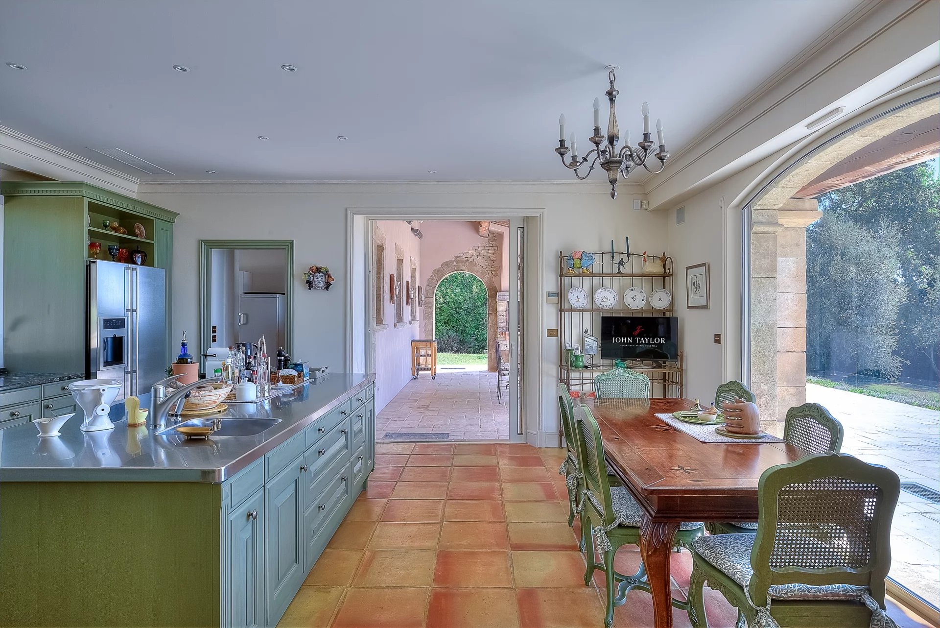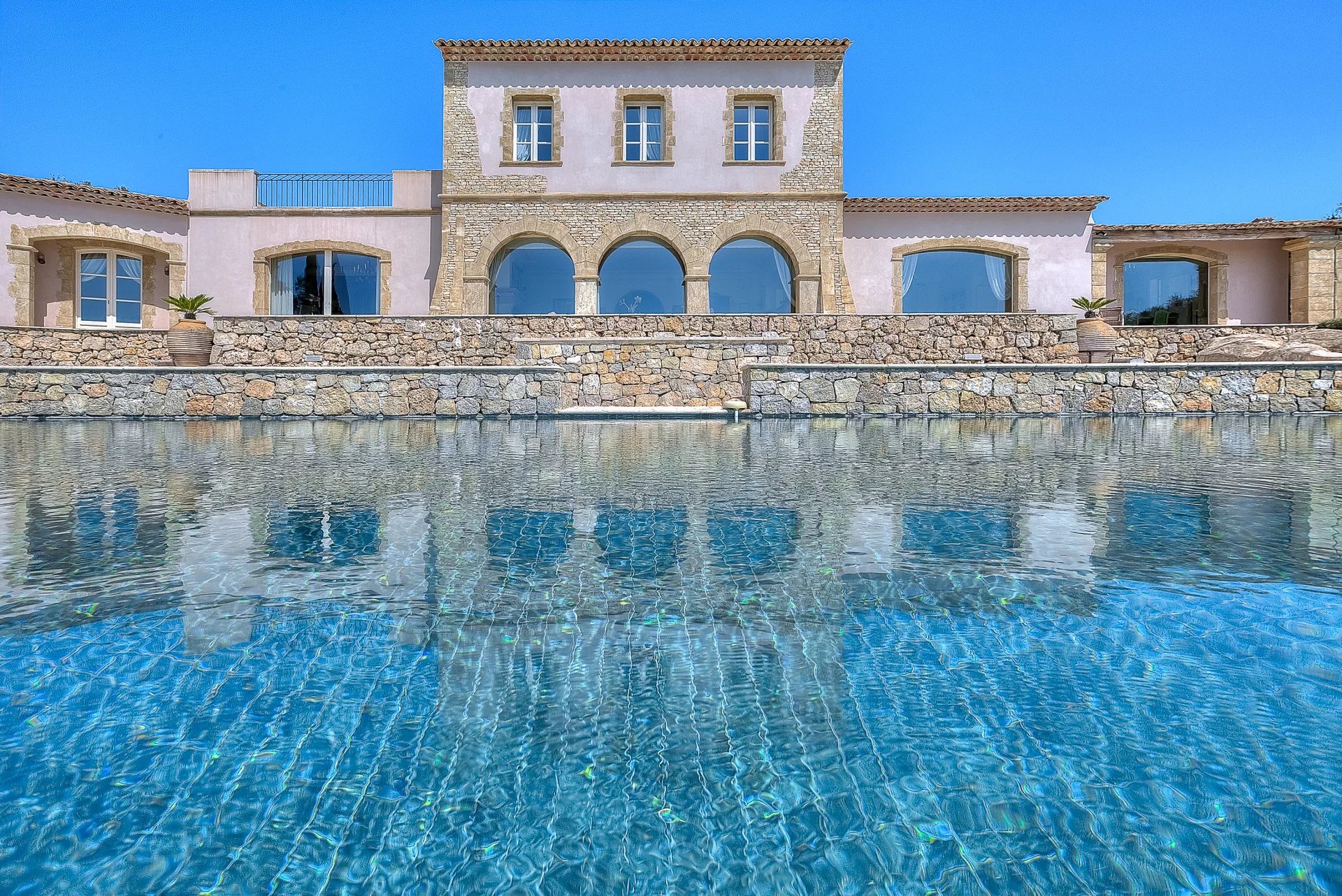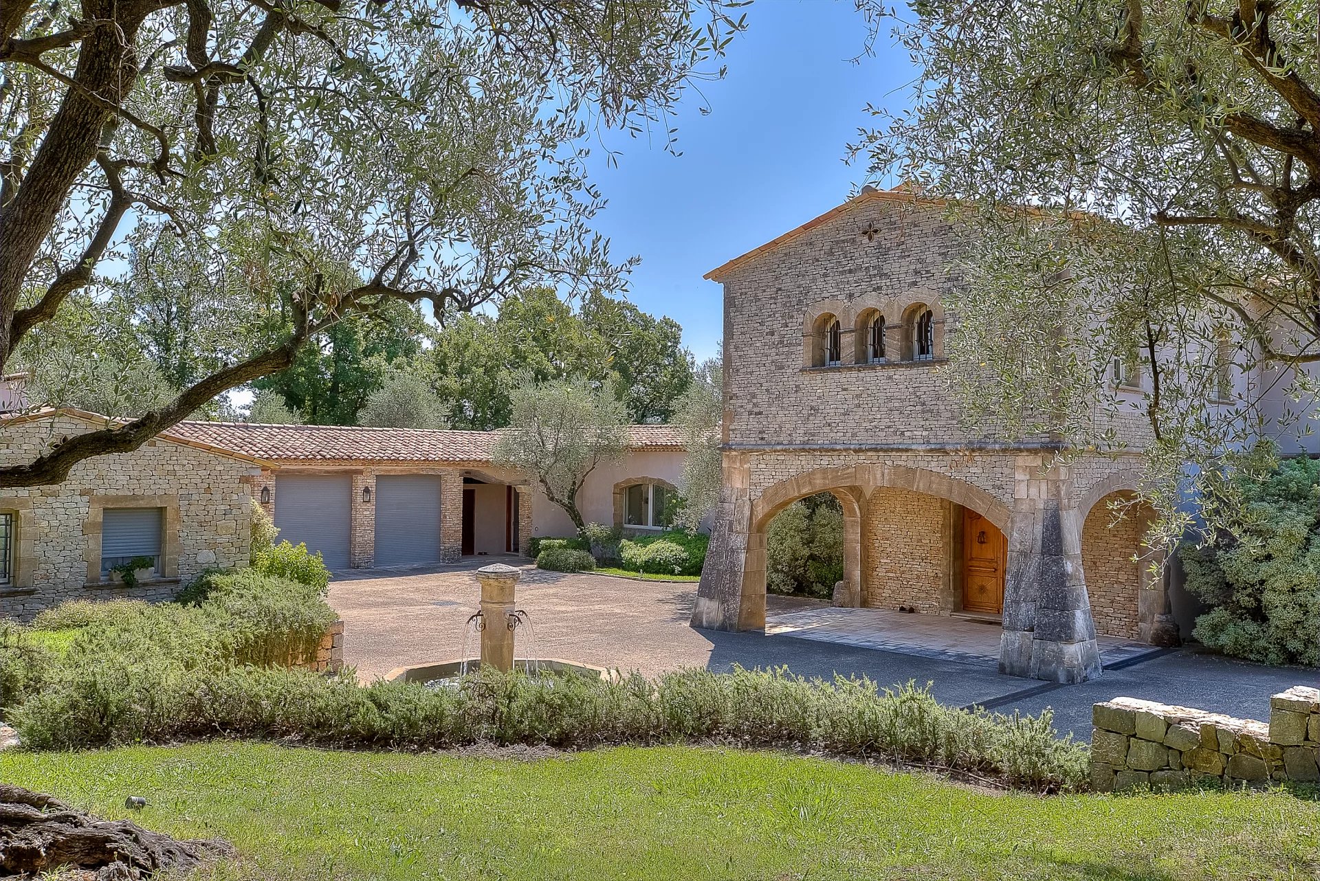 The 10,000 square meter landscaped property, designed by Jean Mus, consists of gentle restanques, stone walls, and is surrounded by over 160 olive trees.