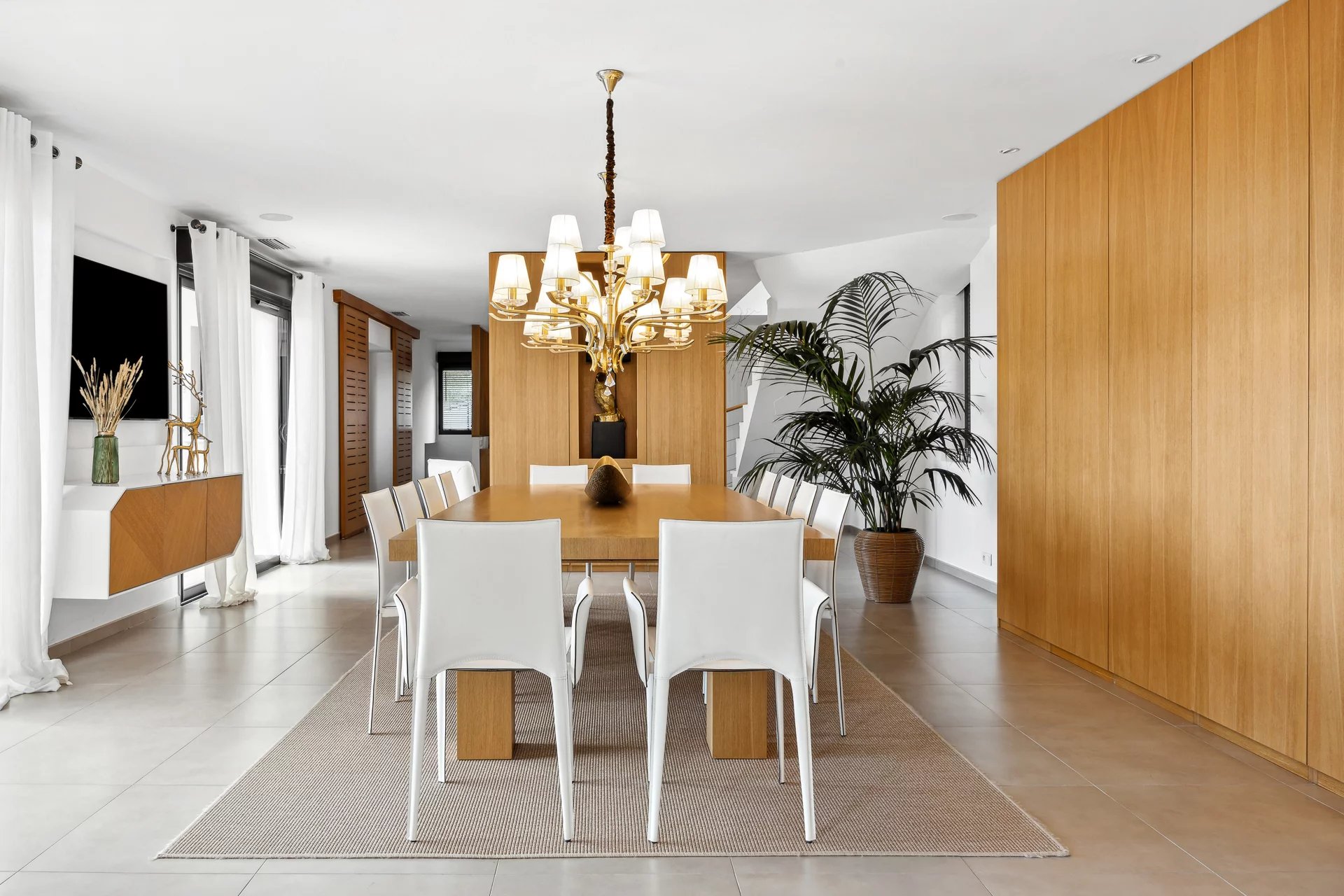 Ideally located close to amenities and schools, this beautiful contemporary villa of around 281 sqm features high quality fittings, is bright and in perfect condition, and sits in grounds of around 1660 sqm with infinity pool, jacuzzi and pool house. The two-storey villa comprises an entrance hall, an open-plan kitchen, a vast living room with dining area and lounge of around 100 sqm extending onto a magnificent terrace with sea and mountain views. Upstairs are 2 bedrooms with full en suite bathrooms and a study. On the ground floor, there is a 2-room apartment and an independent studio. A sports room, laundry room, bowling green and large wine cellar complete the property.