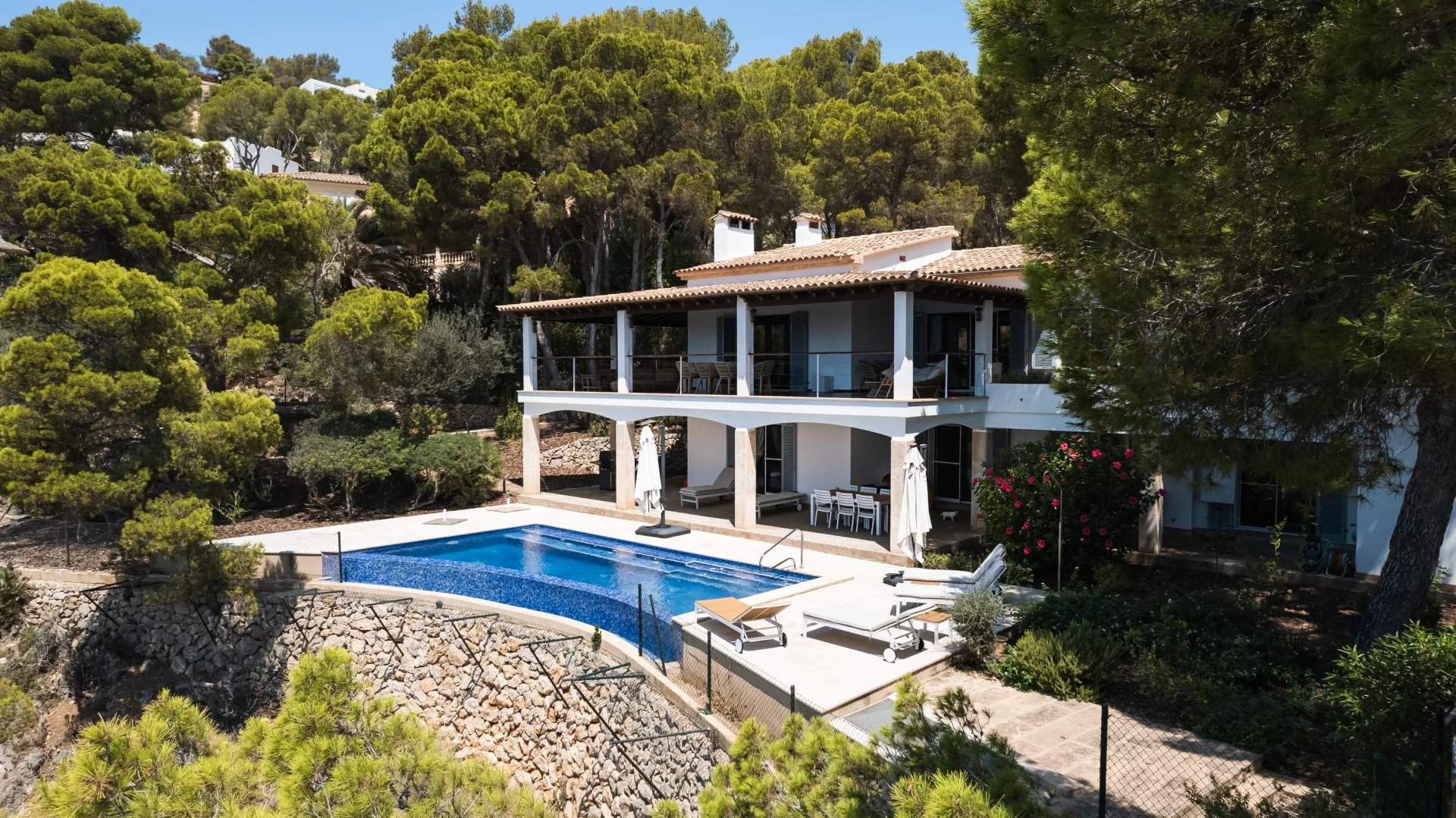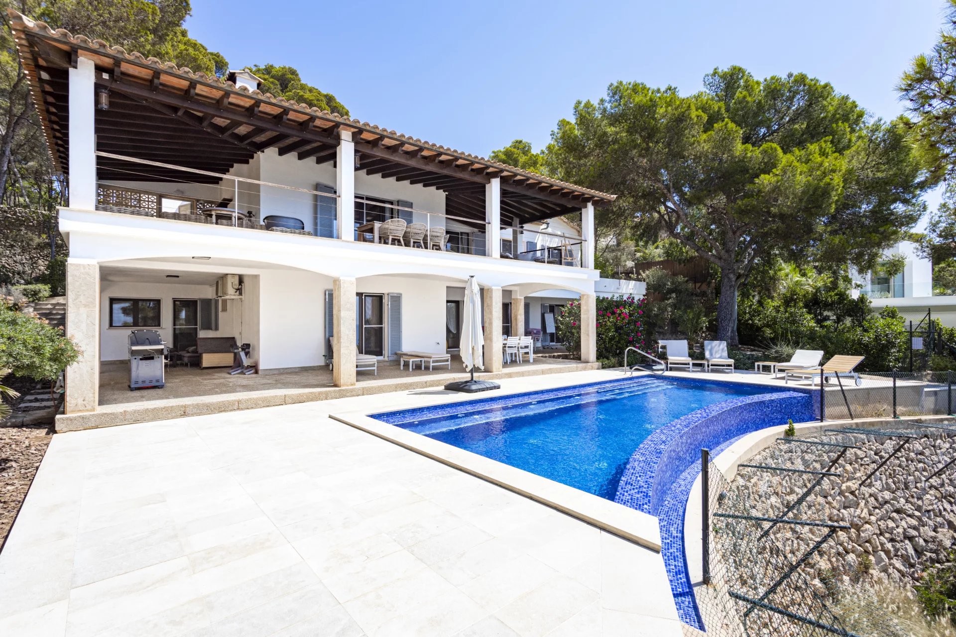 This exclusive seafront villa in Camp de Mar, Majorca, offers unrivalled panoramic views of the Mediterranean Sea and direct access to the sea from the property. Situated in a privileged and tranquil location at the end of a cul de sac, this property was built in 1981 and is distinguished by its attractive exterior design which reflects the architectural charm of the period. The property, which is in need of refurbishment or updating, represents an excellent investment opportunity for those looking for a luxury home in Mallorca. With a constructed area of 431 m² and set on a spacious plot of 1864 m², the villa has four bedrooms, three bathrooms and a garage for two cars. Outside, there is a spectacular swimming pool with sea views and spacious terraces with porch on both the ground floor and the first floor, ideal for enjoying the Mediterranean climate and the sea views that only Camp de Mar can offer. This unique property in Mallorca is perfect for those looking for an exclusive residence in one of the most sought after areas of the island.