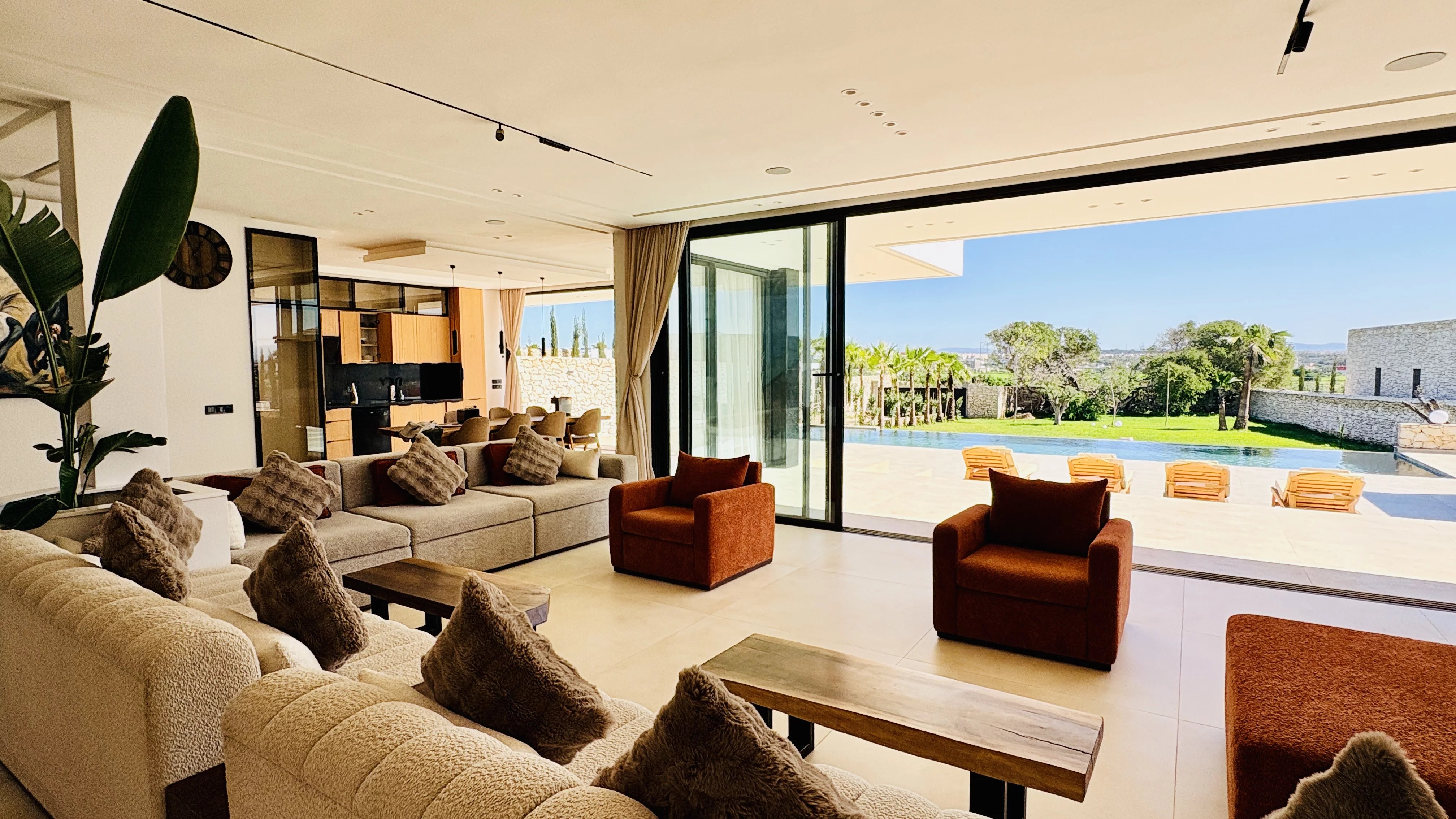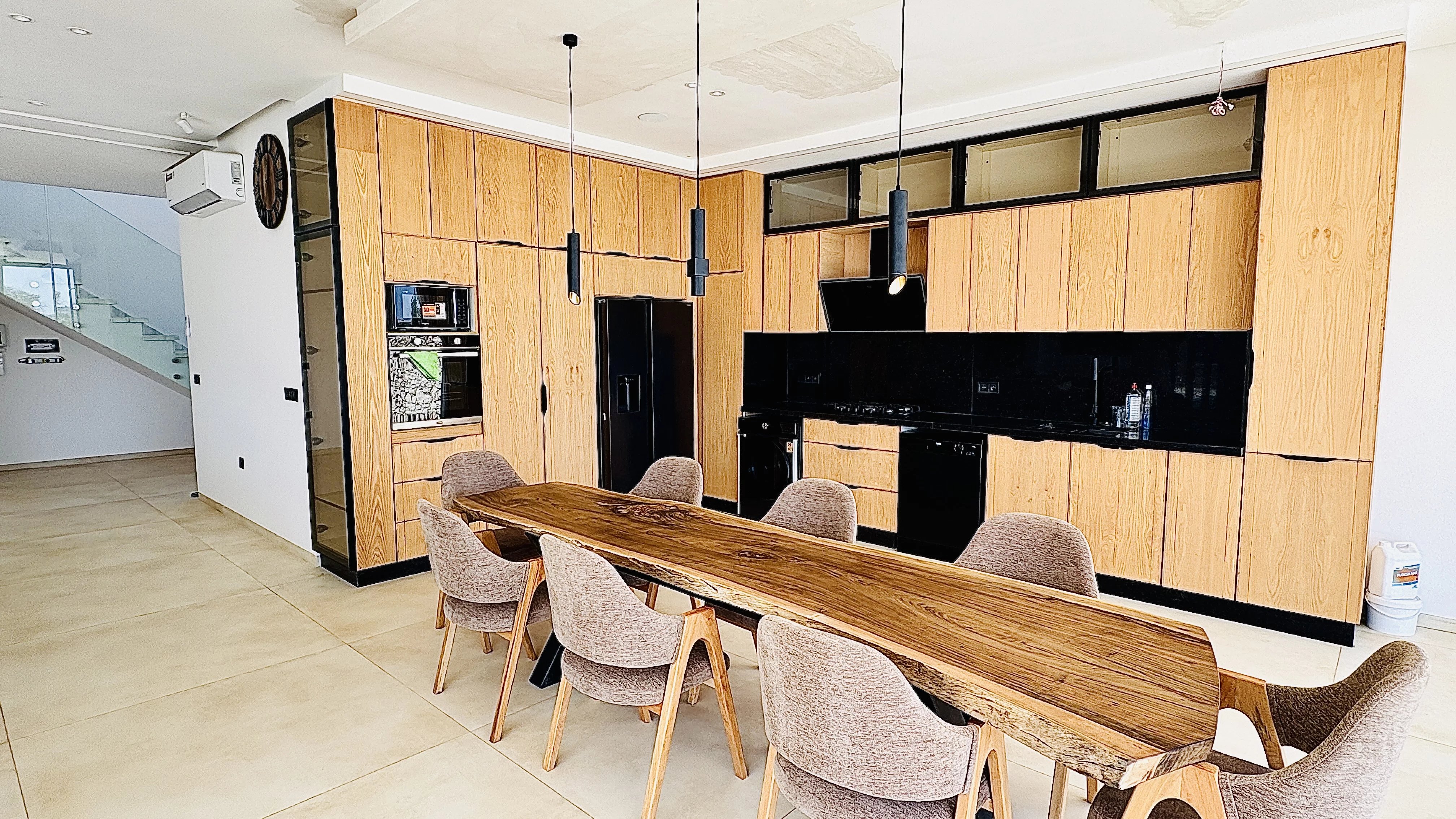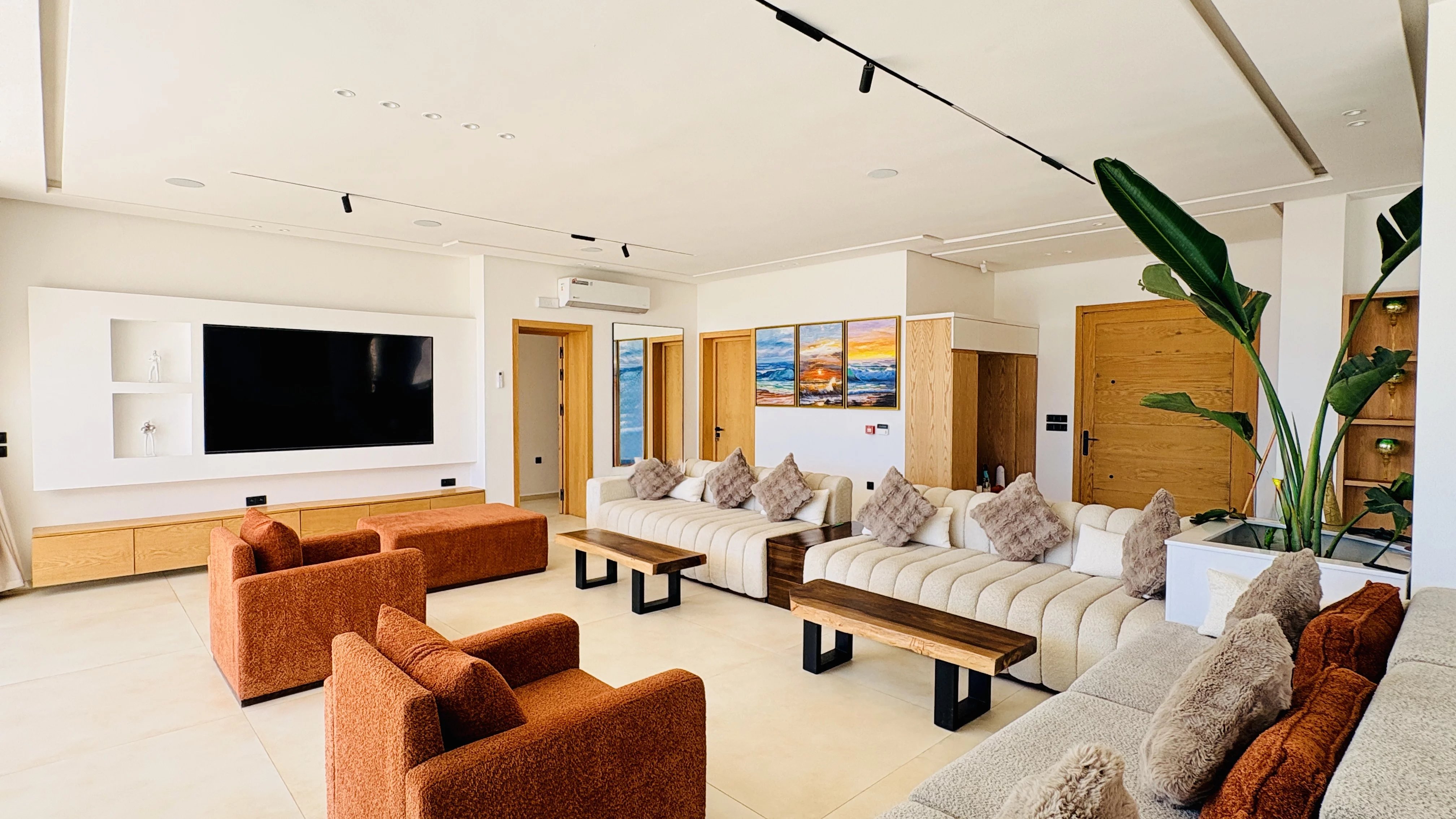 Boasting a 440 sqm living size over 2 floors, the main villa comprises an airy living area opening onto the pool and garden, an open fitted kitchen with dining and 5 ensuite bedroooms. The first floor delights with ocean views.