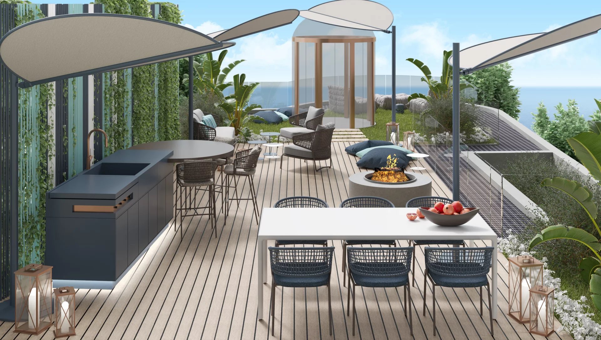 From its rooftop with panoramic views over the Mediterranean Sea, to its harmonious gardens with numerous fountains, Health House will offer you unique moments of life with your family and friends in an exceptional environment. Thanks to the curves and noble materials used in the design, such as wood, marble and glass, living in this unique property is a real privilege.