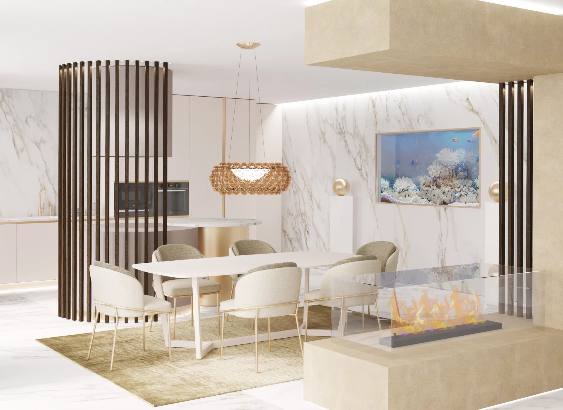 - Open-plan fitted kitchen with integrated fireplace