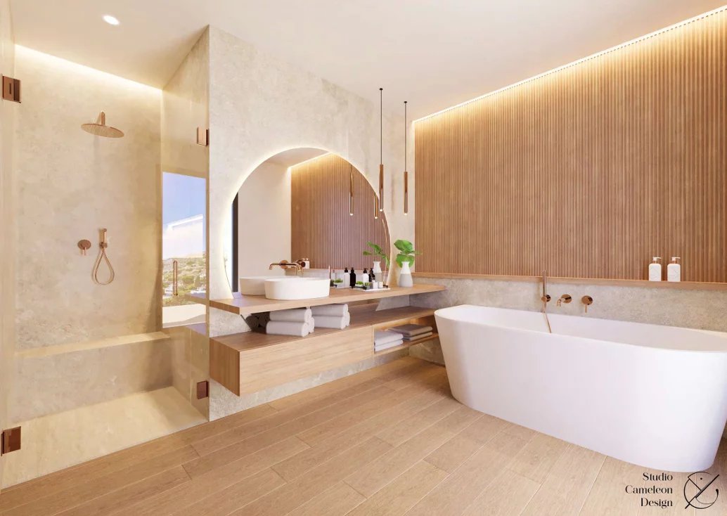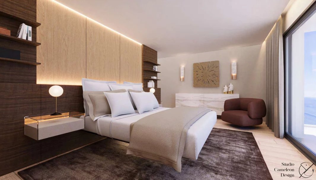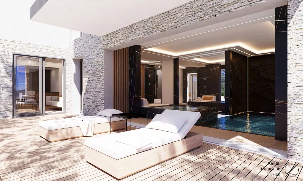 The villa, built on three levels, offers large living areas, three en-suite bedrooms, as well as planned amenities such as an indoor swimming pool, a wellness area with spa and a gym.