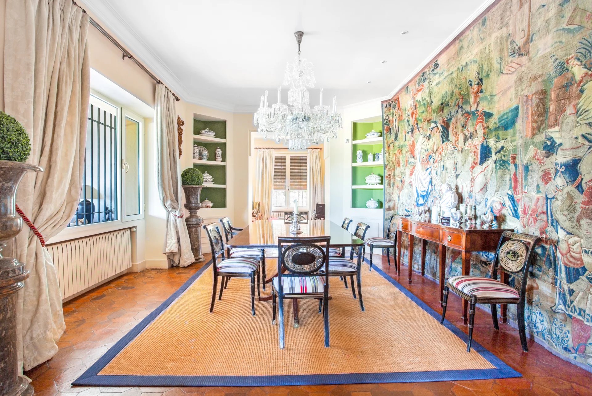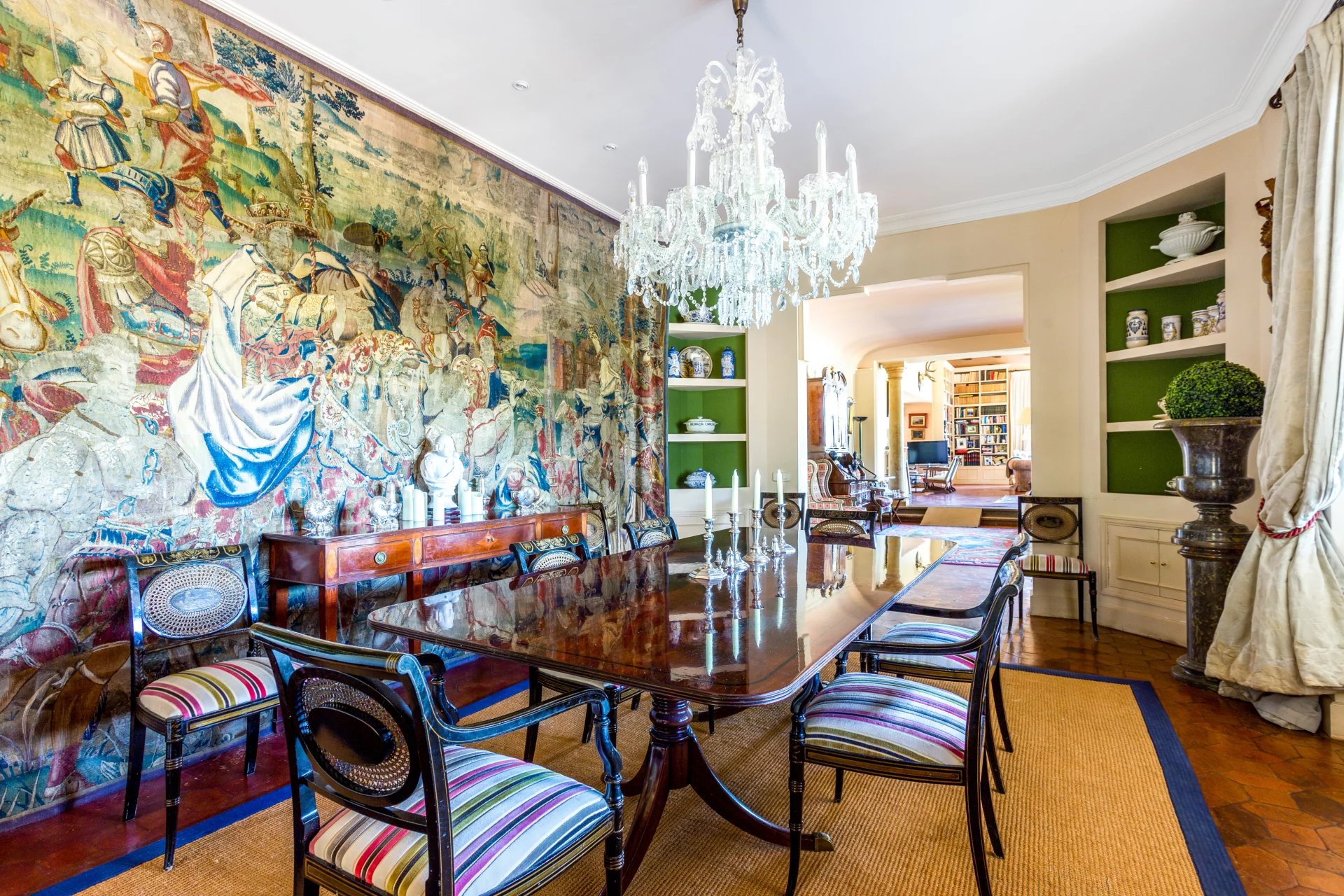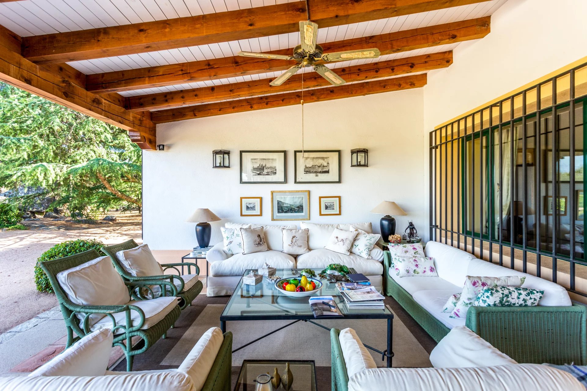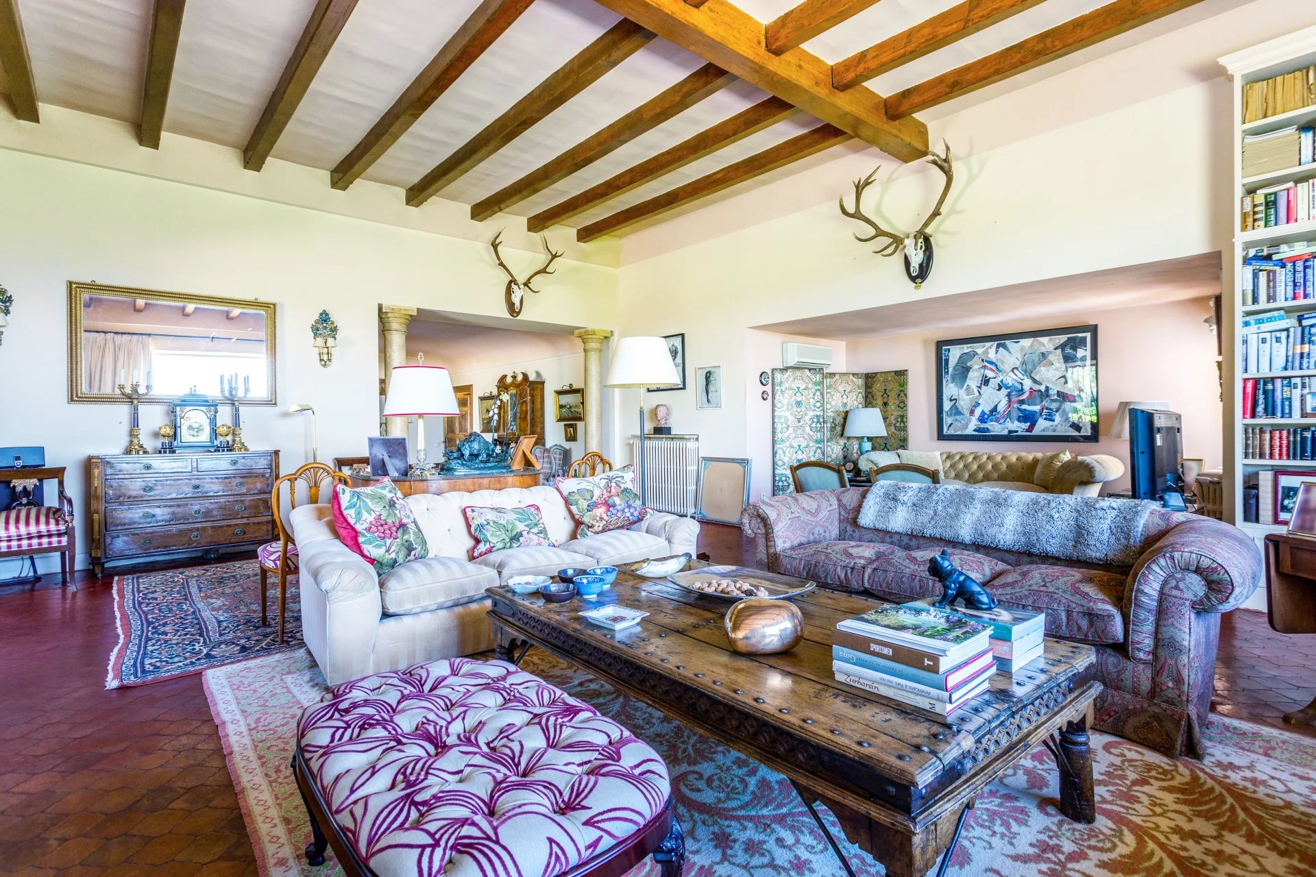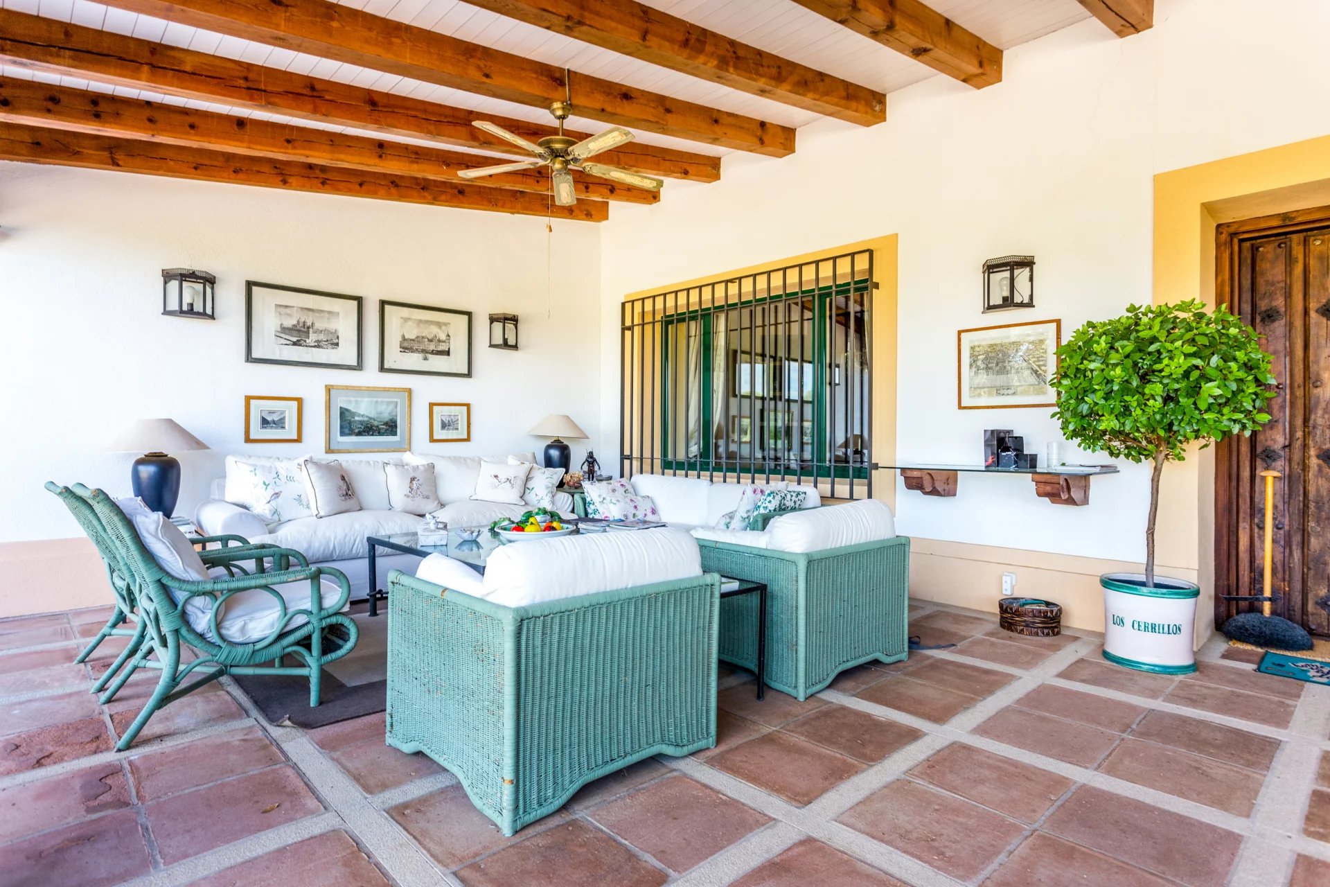 Main house: Upon entering the property, we are greeted by a fabulous porch that invites you to rest, peace and tranquility, undoubtedly one of the most desired places in the house for its orientation, its freshness and the sound of water falling into the fountain located in the garden. We access the interior of the house, through a welcoming hall that leads to the living room (90m²) with fireplace distributed in several rooms. This bright and intimate area is equipped with large windows that flood the room with light and offer unbeatable views. In the opposite area we find a dining area (20m²) that leads to the living room (35m²) also with fireplace. The sleeping area consists of five large bedrooms all with en suite bathrooms. The master bedroom has a separate dressing room. The kitchen area is distributed in office area, kitchen, technical room, and service bedroom with bathroom. From this area we can access the garden areas of the property.
