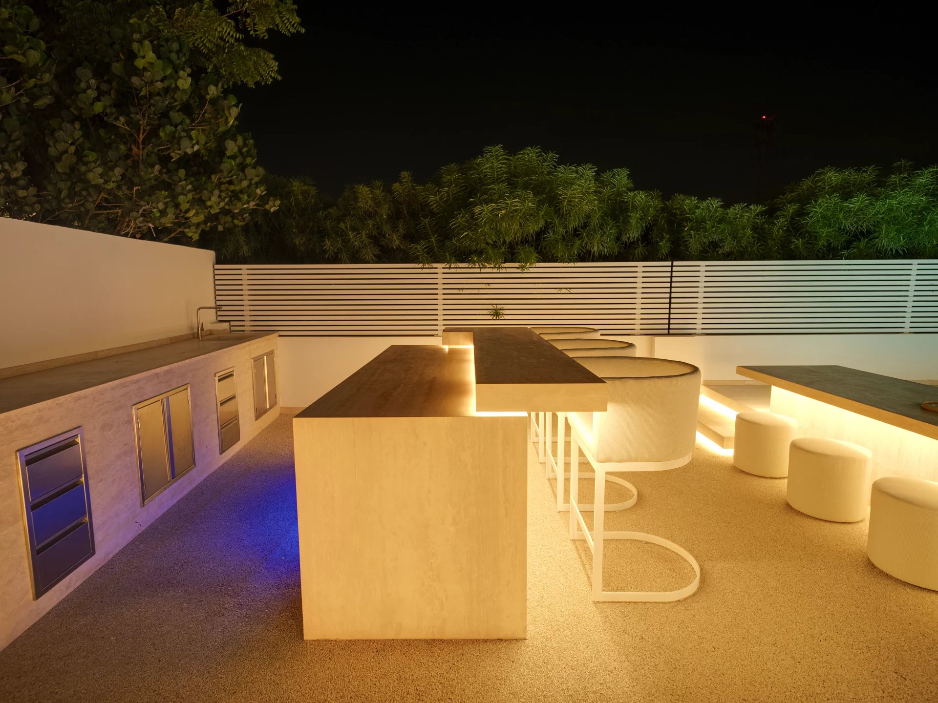 * Outdoor dining area with a fireplace